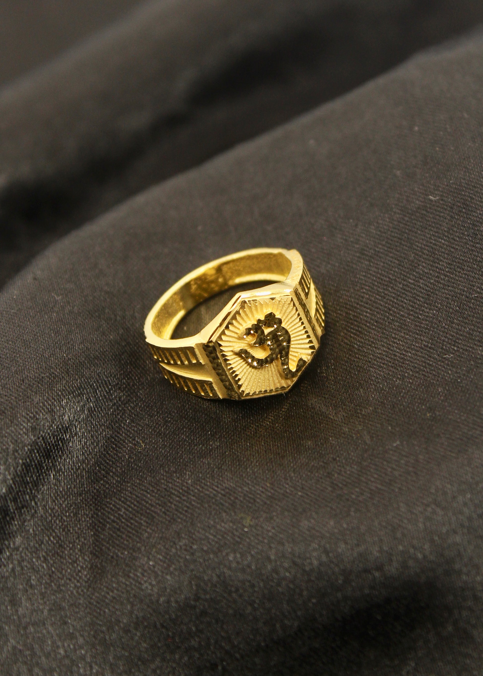 If you are fond of holding designer accessory then you must pick this men's finger ring from Sonchafa Jewellery. It feature intricate carving of Om design on golden metal surface. It is superior in quality and will retain its shine for years to come.