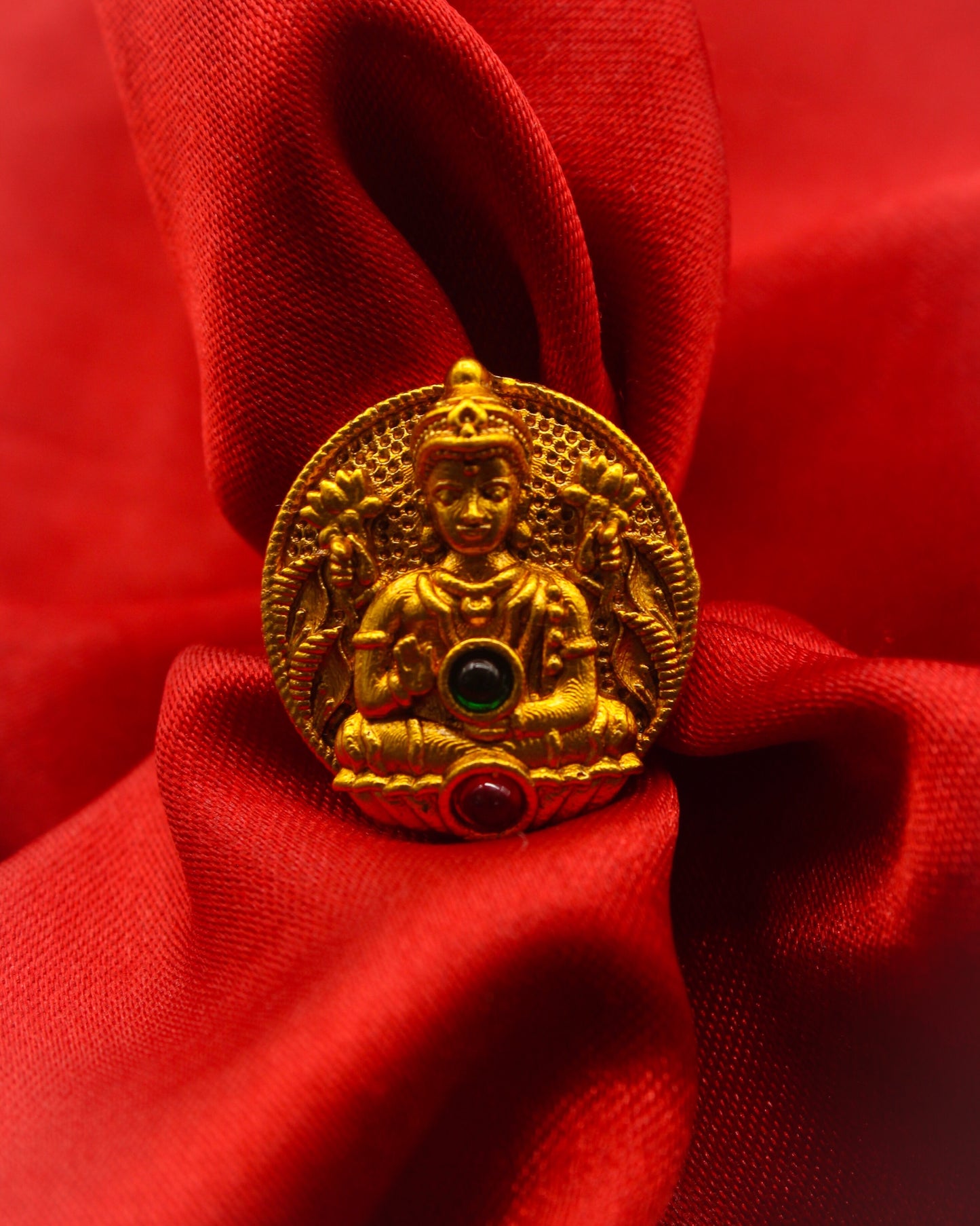 Style up your look by clubbing this beautiful Goddess Laxmi designer finger ring with your favorite costume. It is embedded with sparkling Pink, Green stones and crafted from good quality metal. This beautiful finger ring is easy to wear as it is adjustable in size.