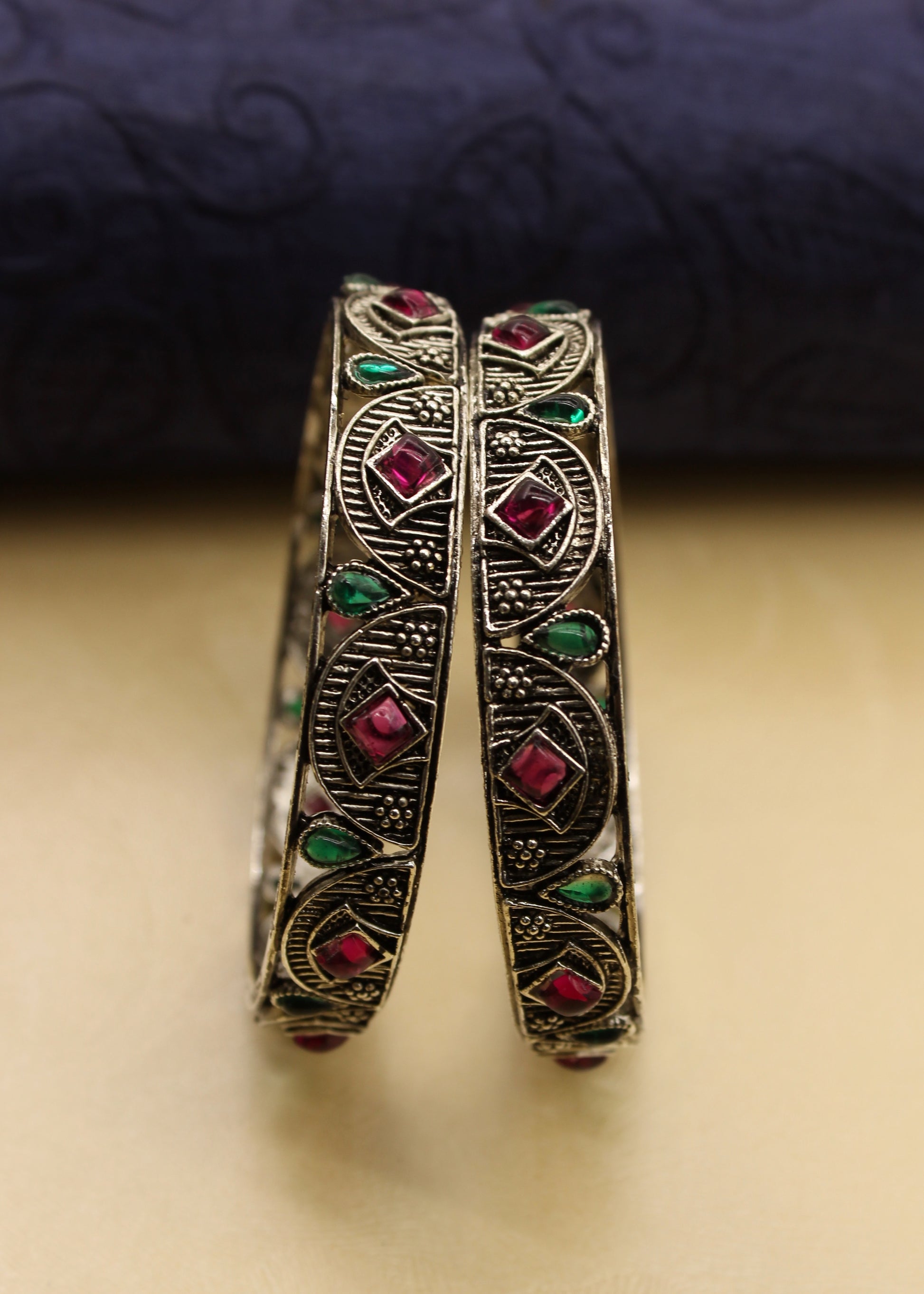 Get that attractive look by wearing this oxidised finish beautiful bangles with your matching saree. They are studded with sparkling pink, green stones along with carving work. This set is good in quality and will be your fashion companion for many years