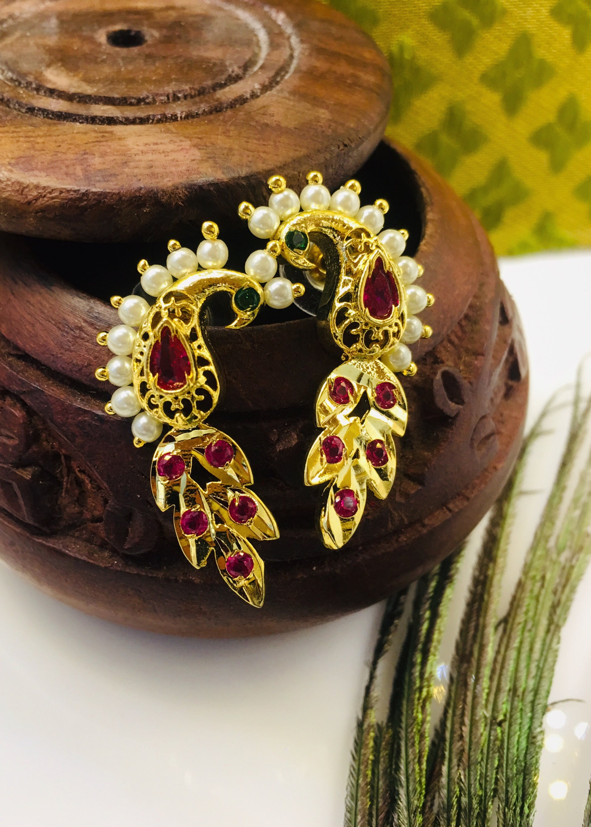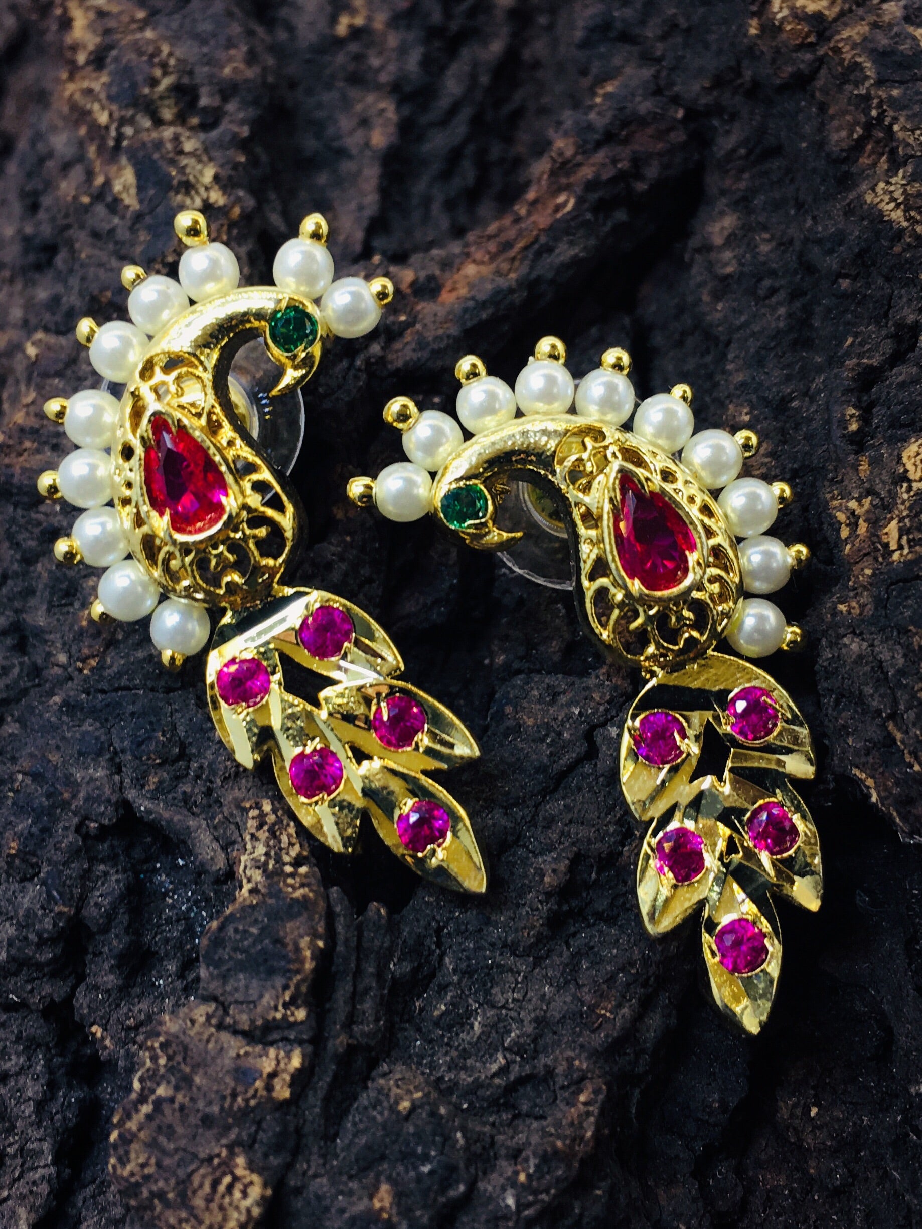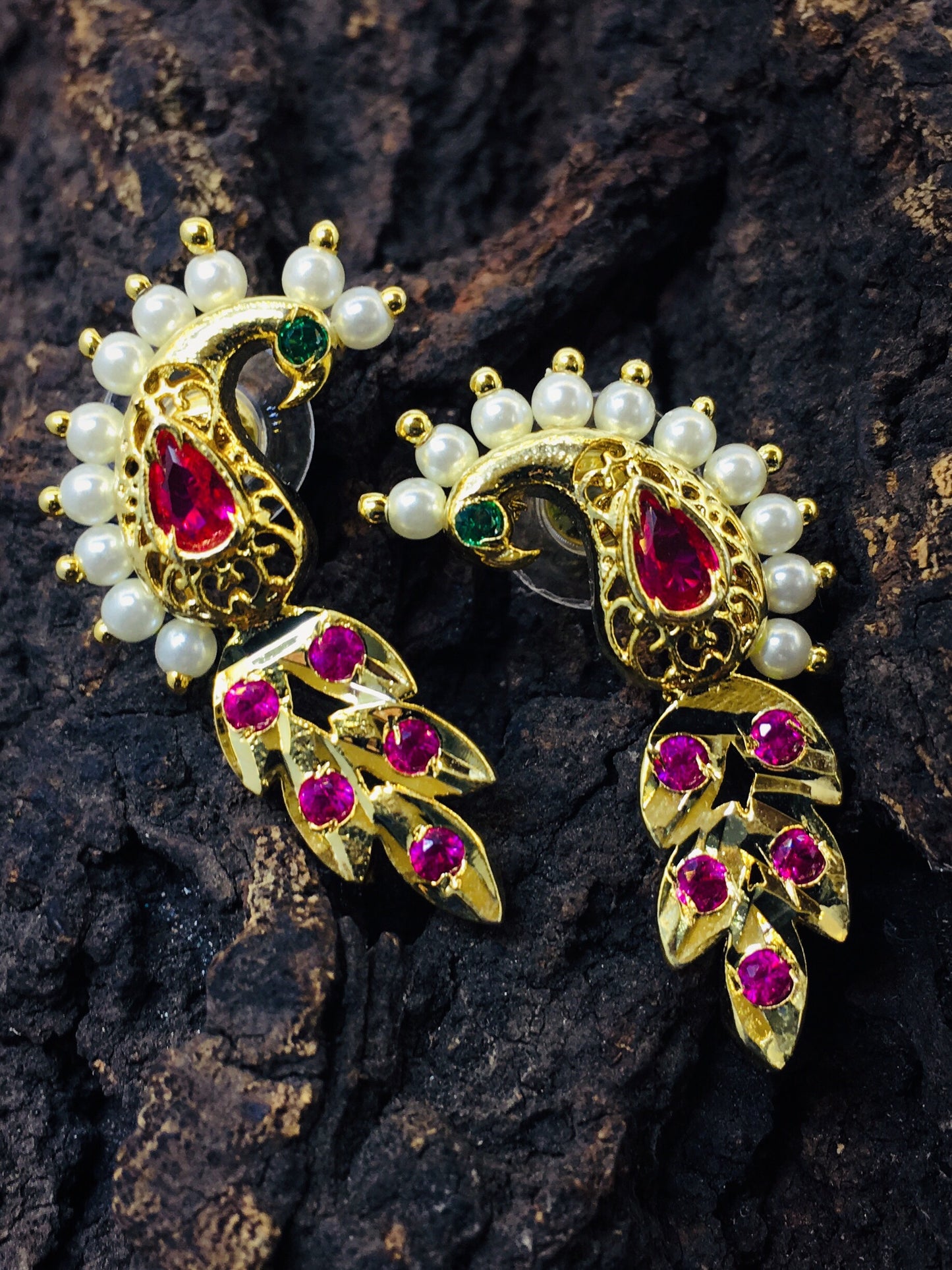 Have a look peacock inspired studs earrings form perfect match our Maharashtrian look. it is studded shimmering pink stone along with pearls beads and made form golden finish metal. It is wonderfully studded with crystal stone and made form metal.