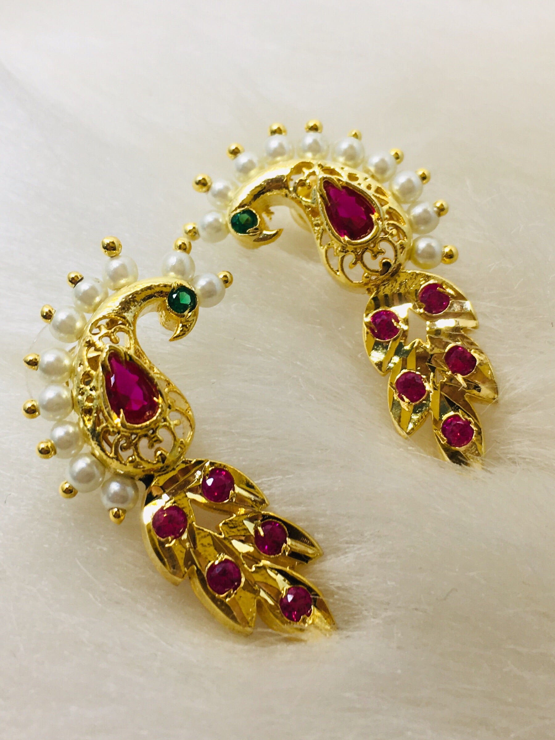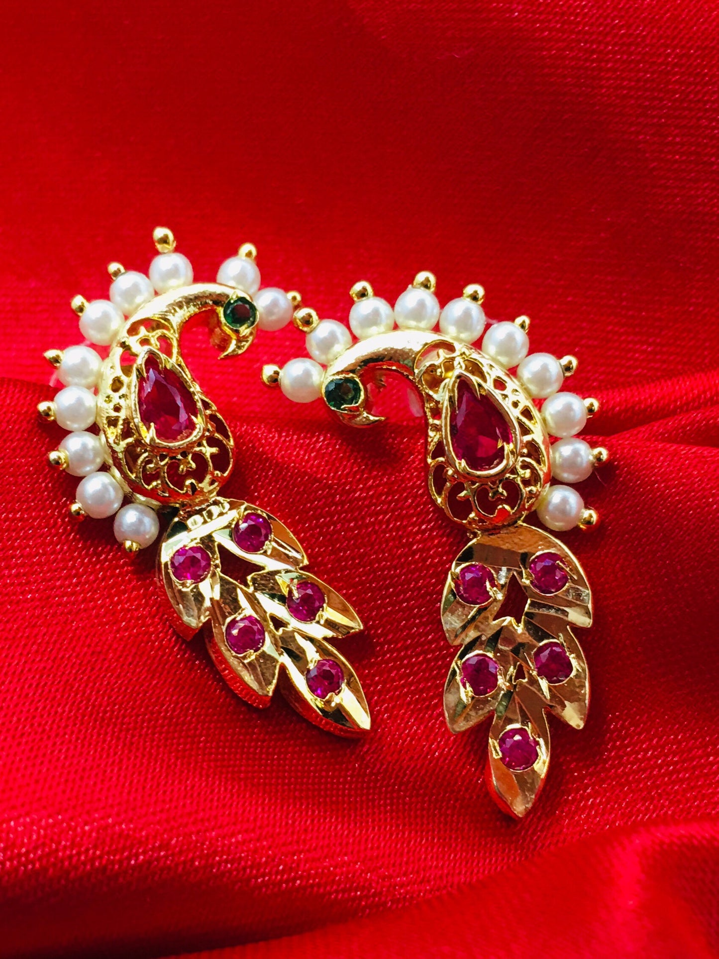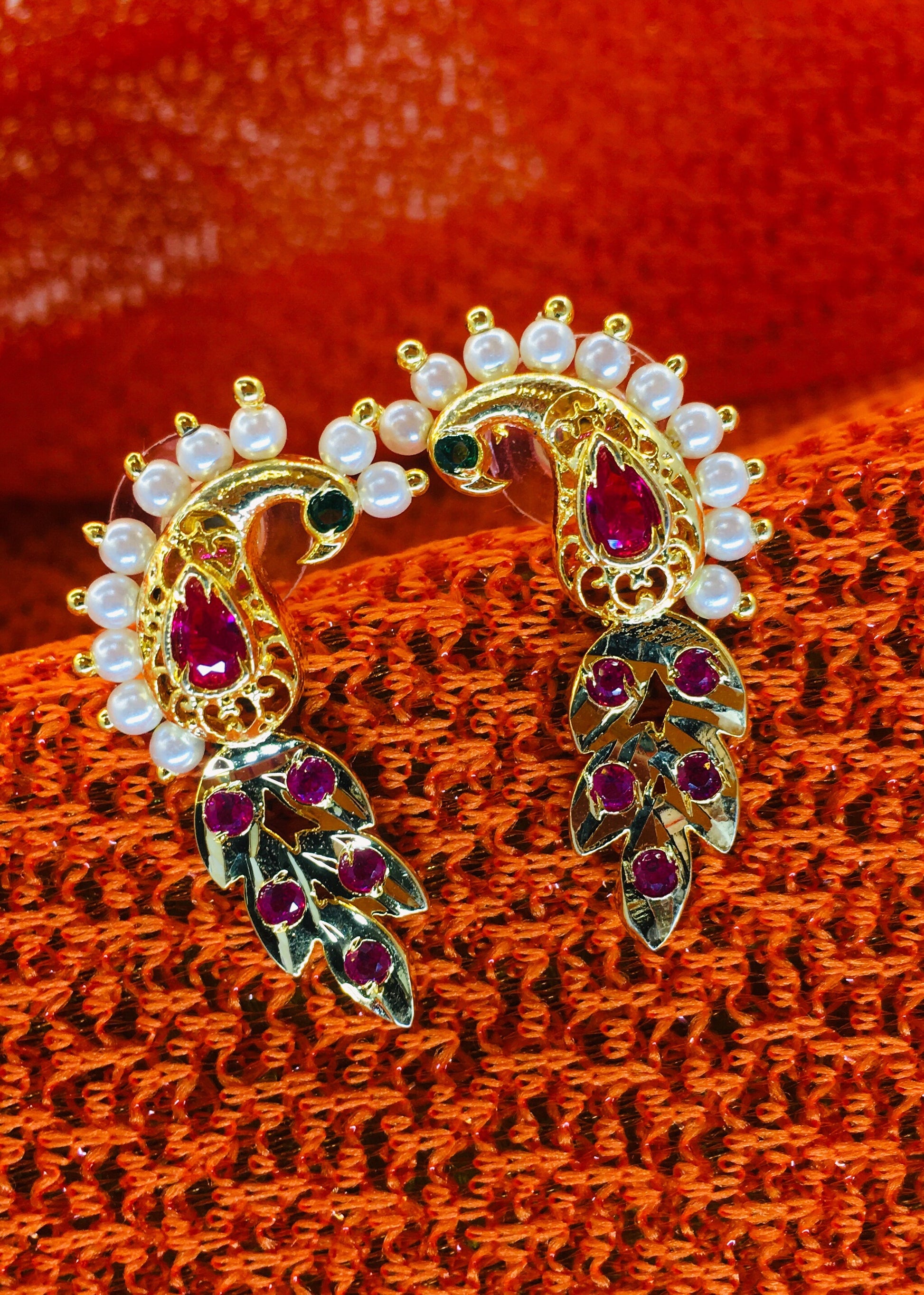 Have a look peacock inspired studs earrings form perfect match our Maharashtrian look. it is studded shimmering pink stone along with pearls beads and made form golden finish metal. It is wonderfully studded with crystal stone and made form metal.