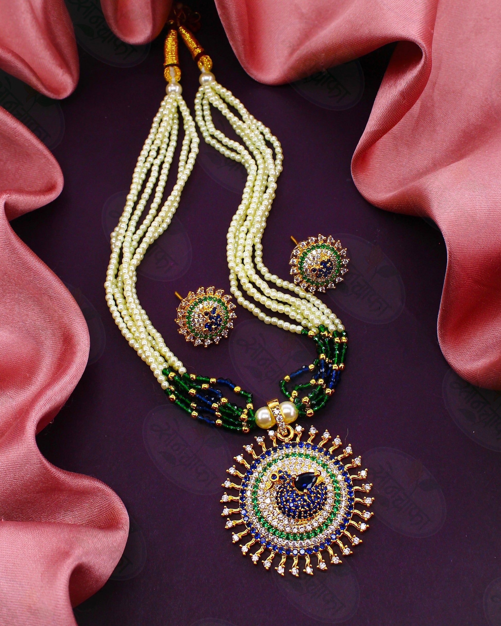 Buy now Wonderful adorable floral necklace set form Sonchafa Jewellery for your trendy look. It is studded with blue, green, White stone crafted with golden finish This necklace set has wonderful pearl beads droplets for more stylish look.