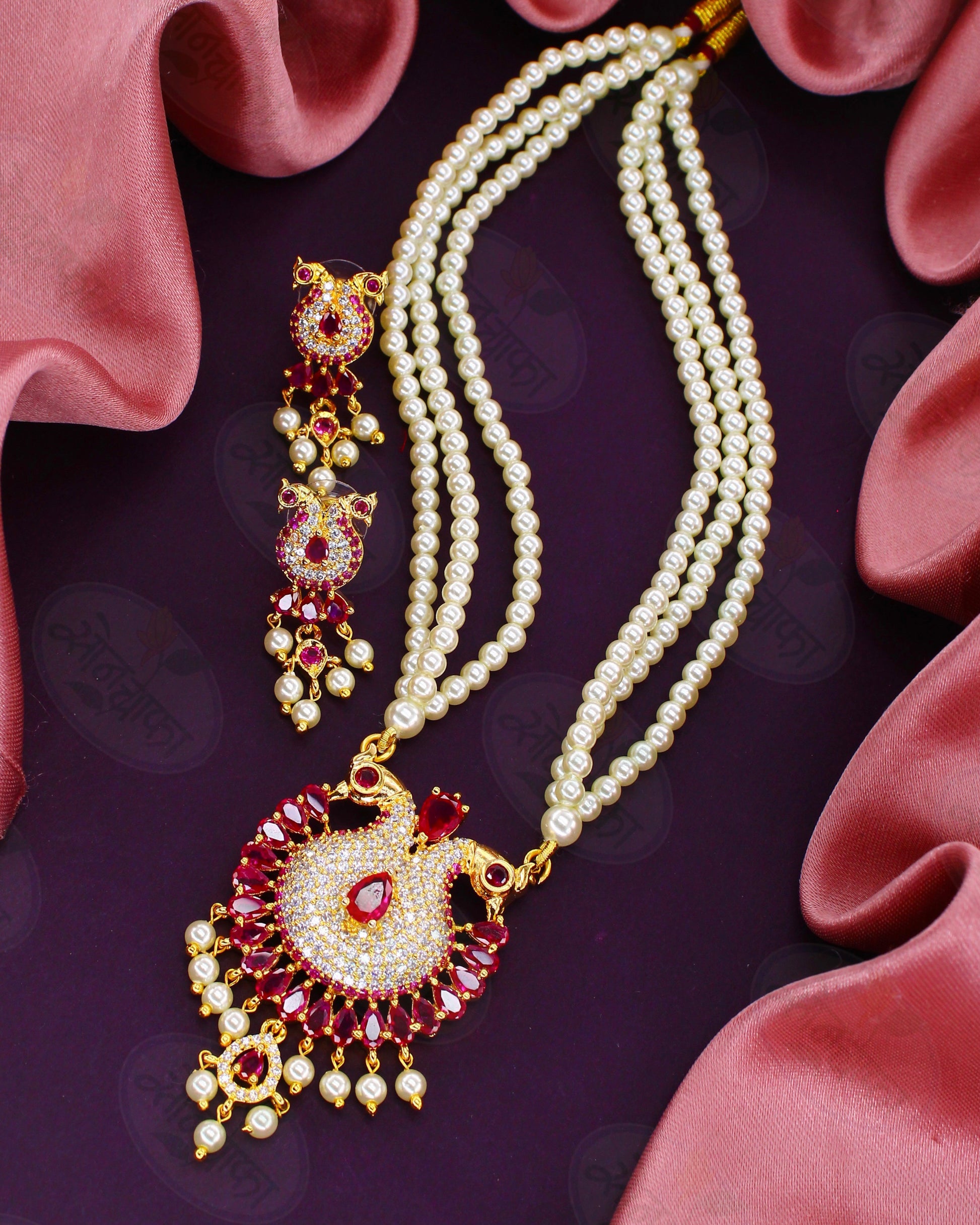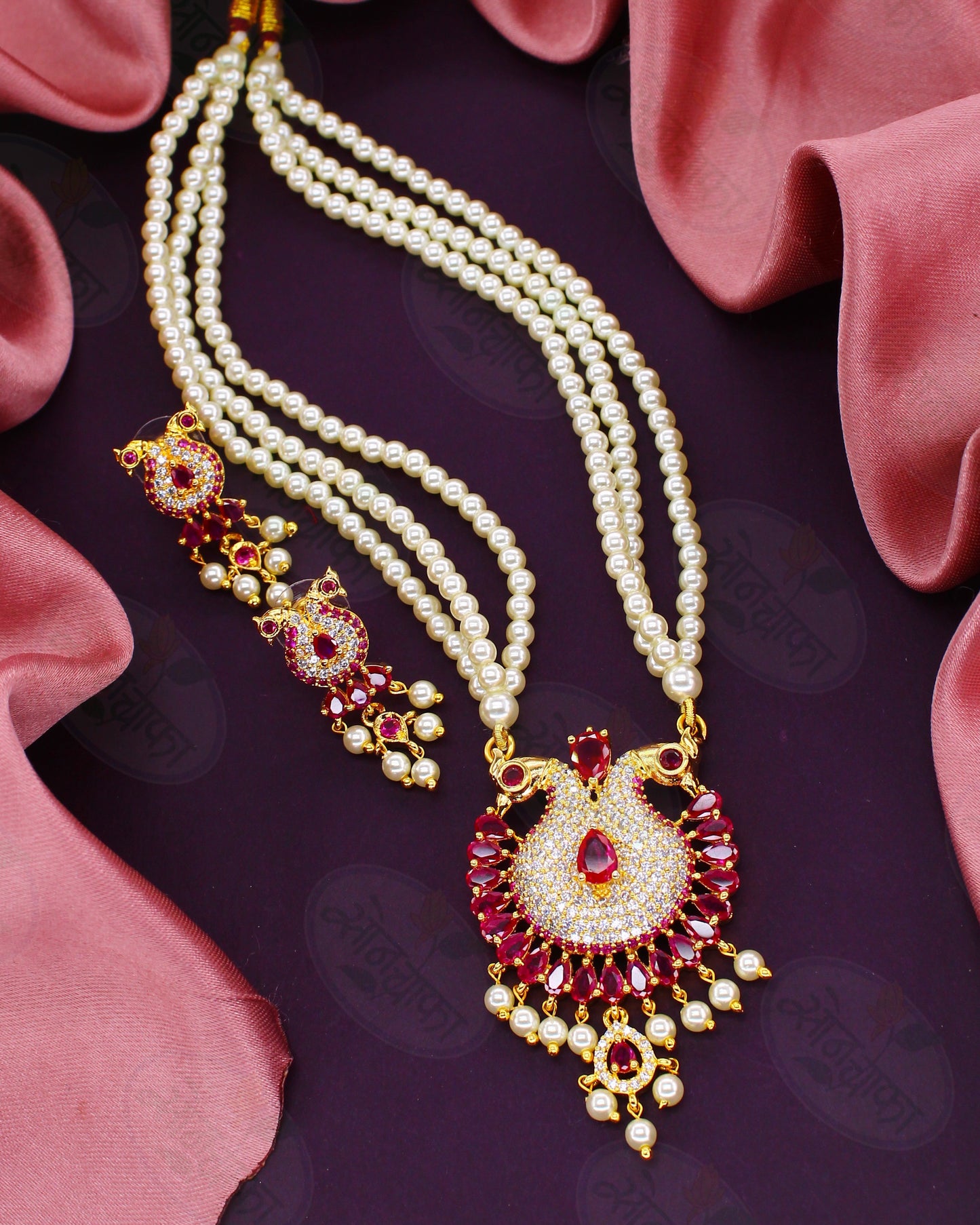 Buy now Wonderful adorable floral necklace set form Sonchafa Jewellery for your trendy look. It is studded with Pink -White stone crafted with golden finish This necklace set has wonderful pearl beads droplets for more stylish look.