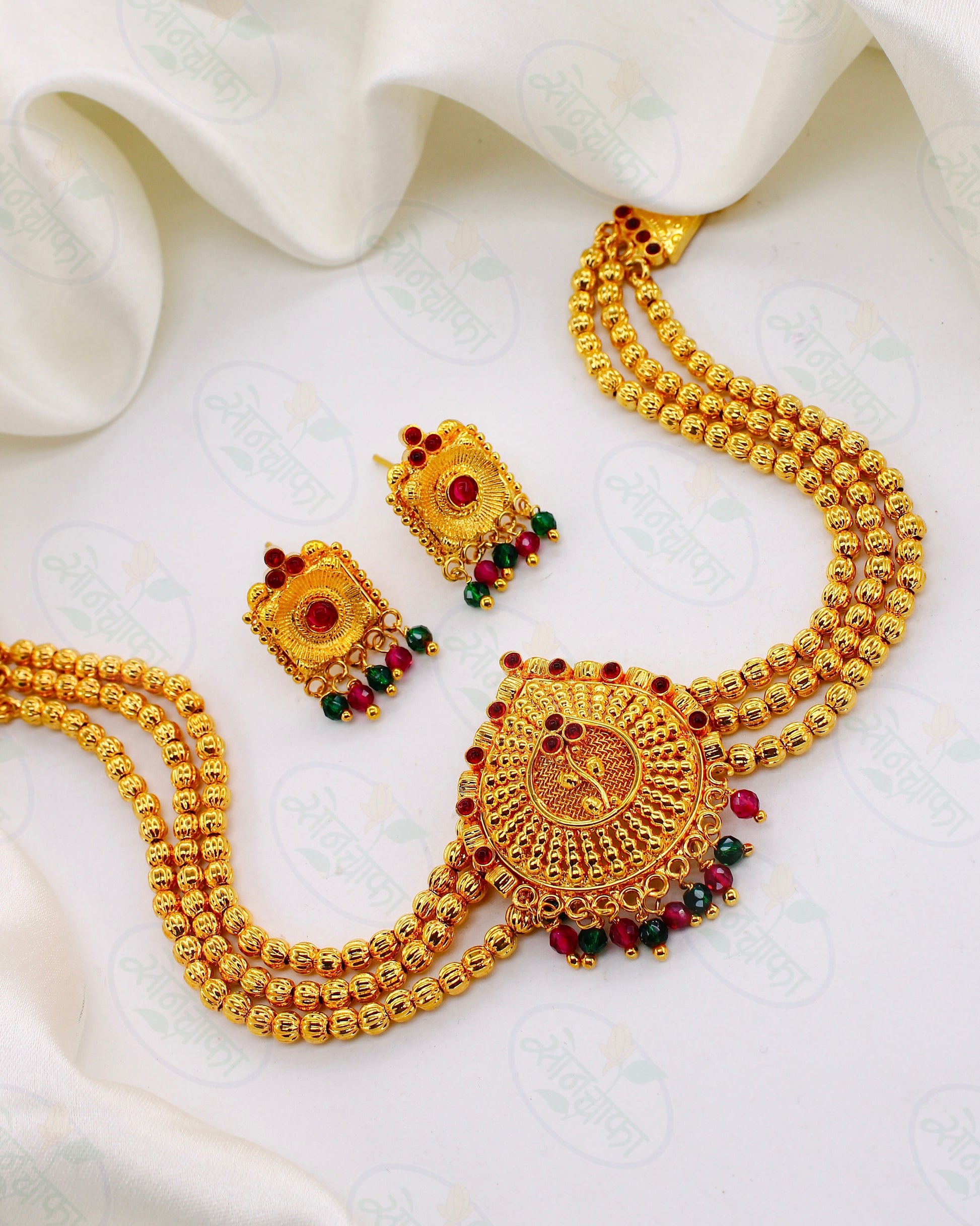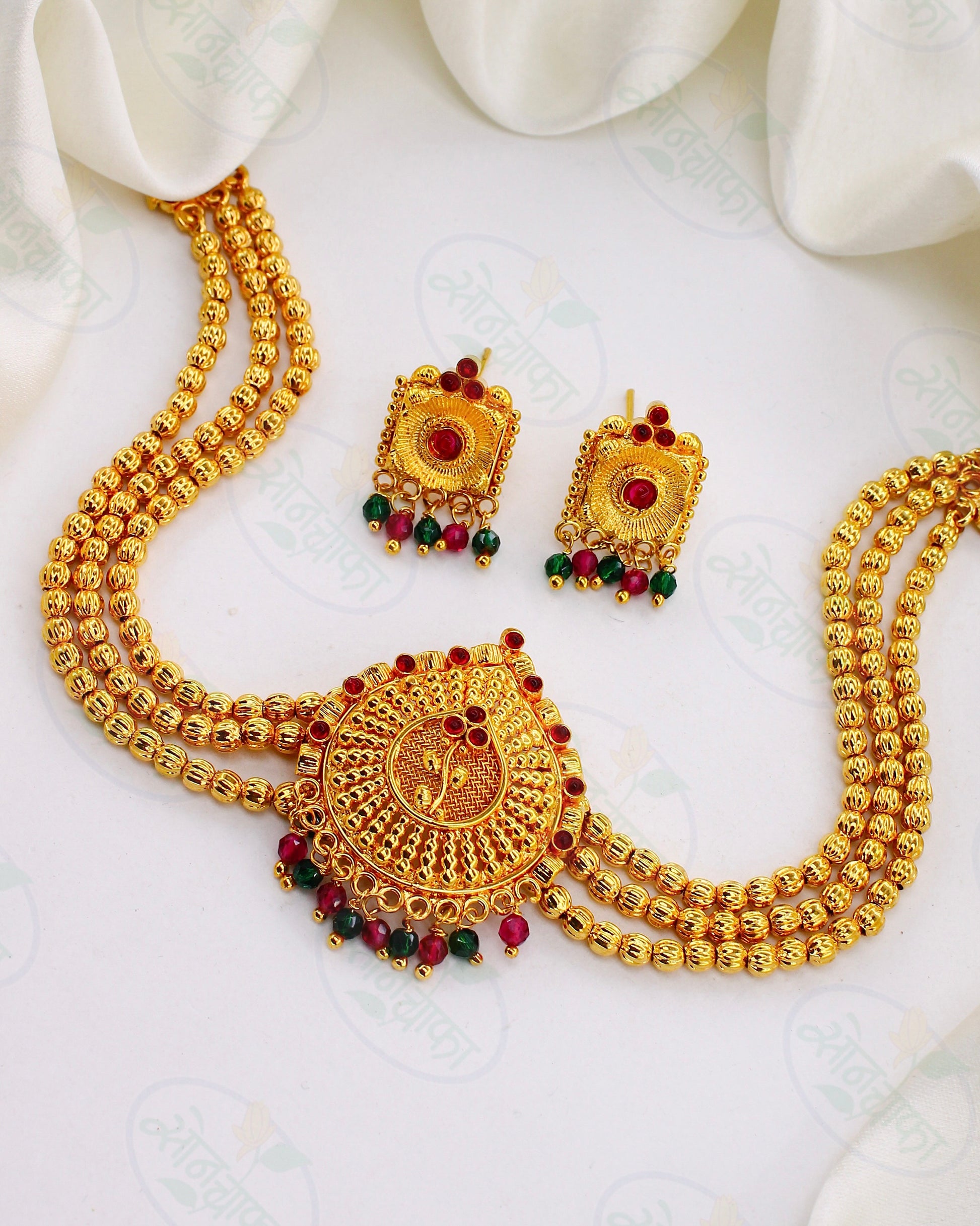 Pink, Green stone designer Choker form Sonchafa Jewellery for our stylish look. It is wonderfully crafted with Matte gold finish metal along with Golden beads. This choker Necklace set has Pink, Green droplets for attraction look.