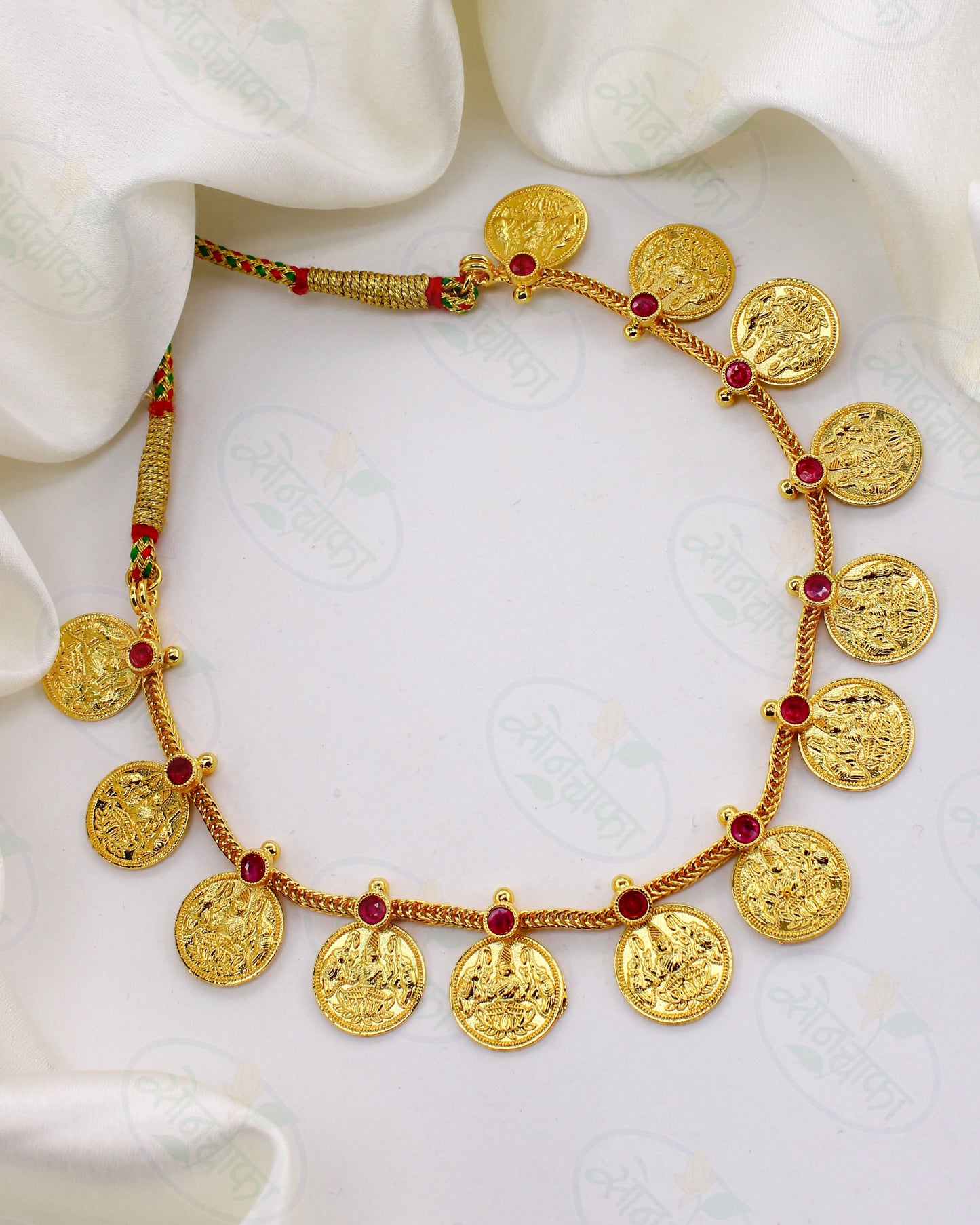 Adorn your neckline with this golden finish wonderful necklace set with your fancy saree. It is studded with golden beads and has golden coin droplet for added attraction. This set is made from golden finish metal and ensure high durability.