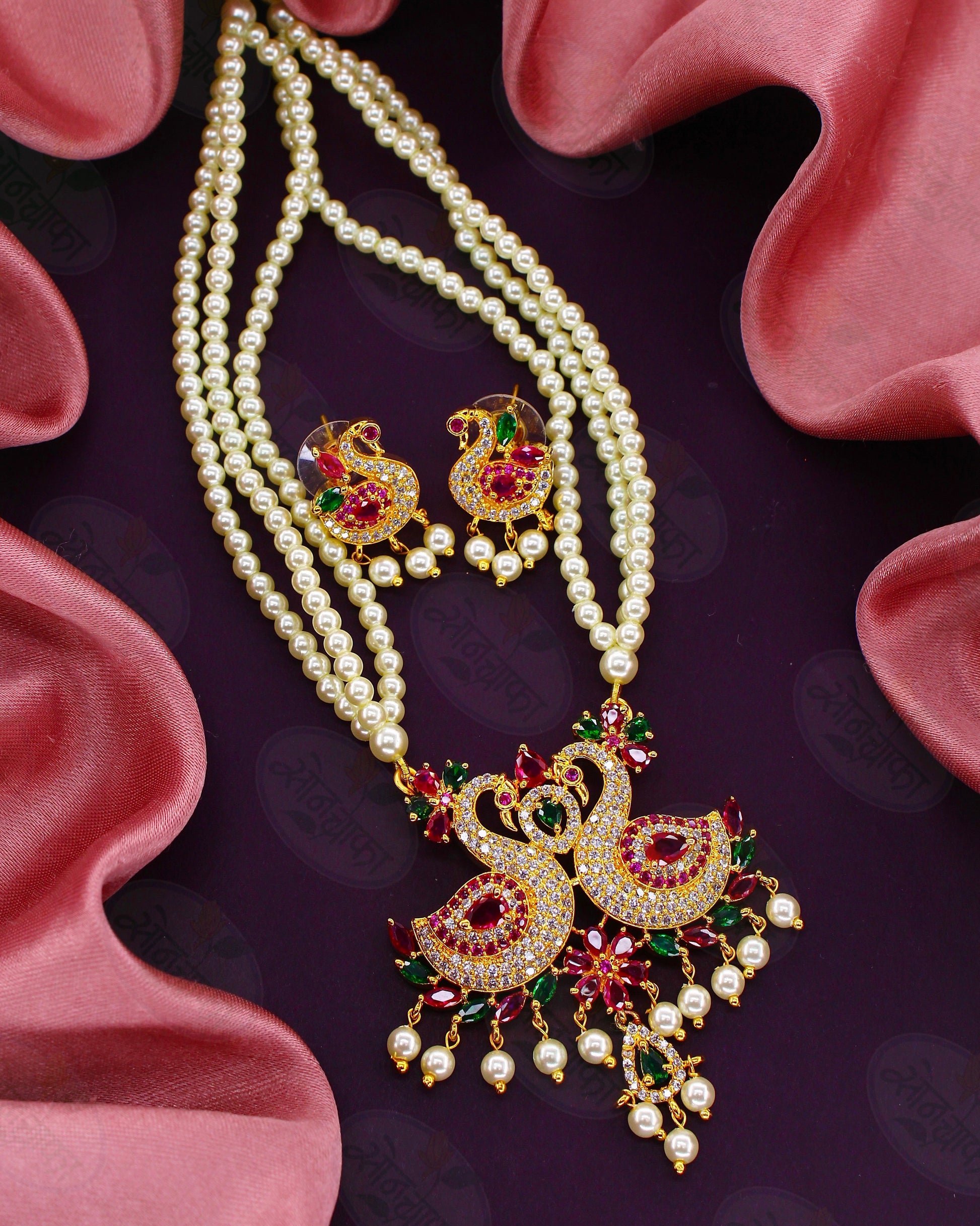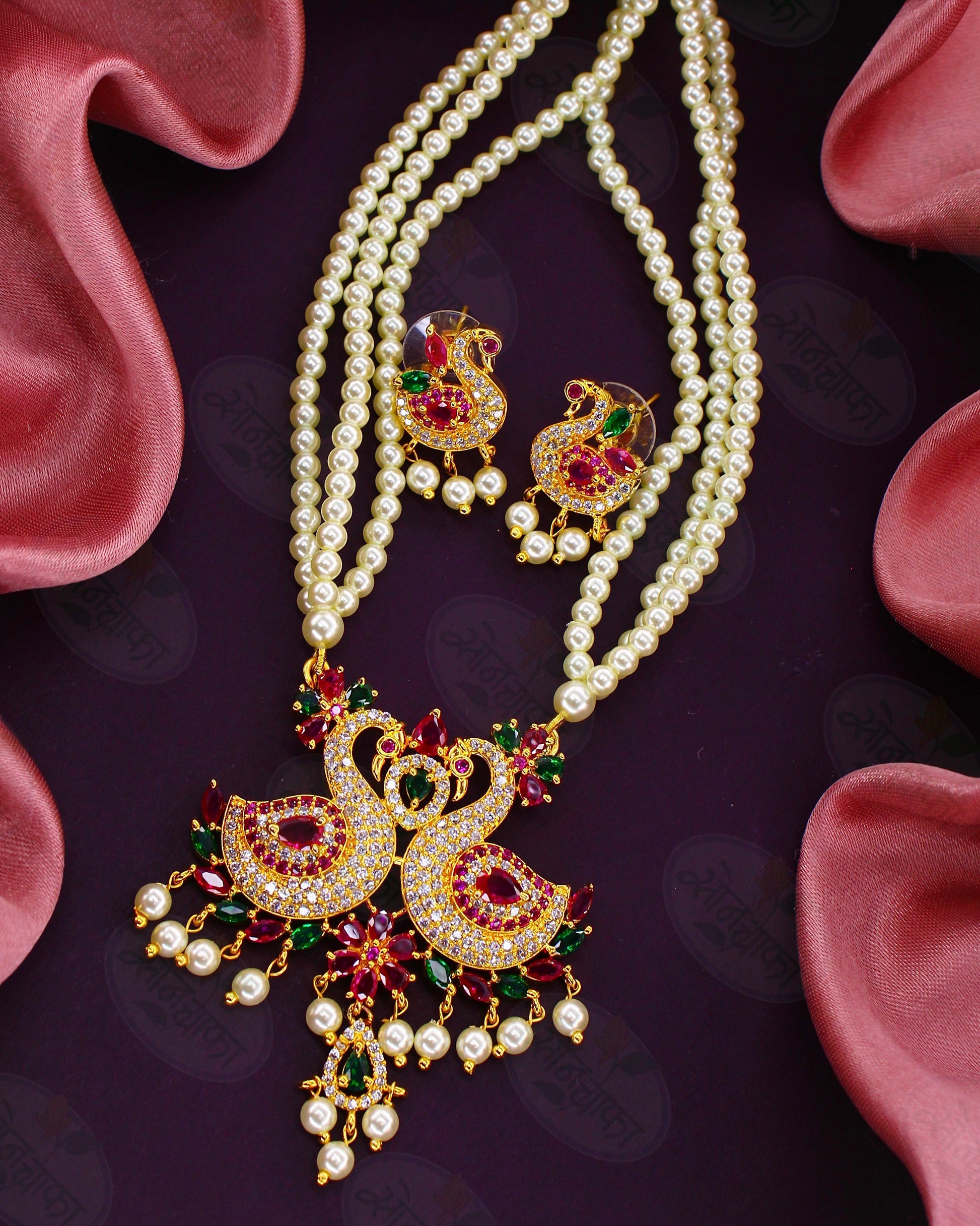Have a look at this beautiful pearl beads necklace set from Sonchafa Jewellery which is perfect combination of class and elegance. It is studded and feature flawless work on metal surface. This necklace is woven with decorative beads along with pearl beads.
