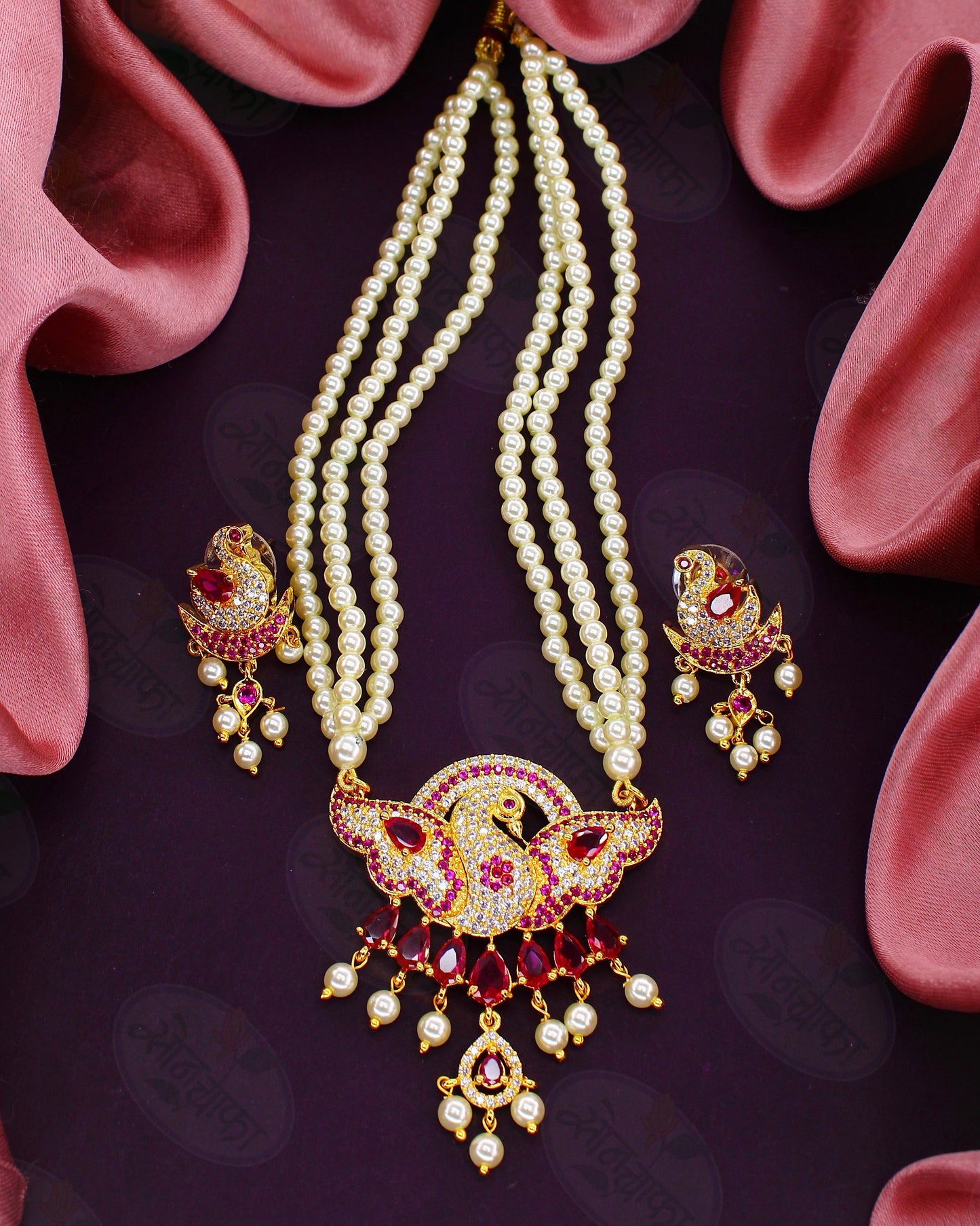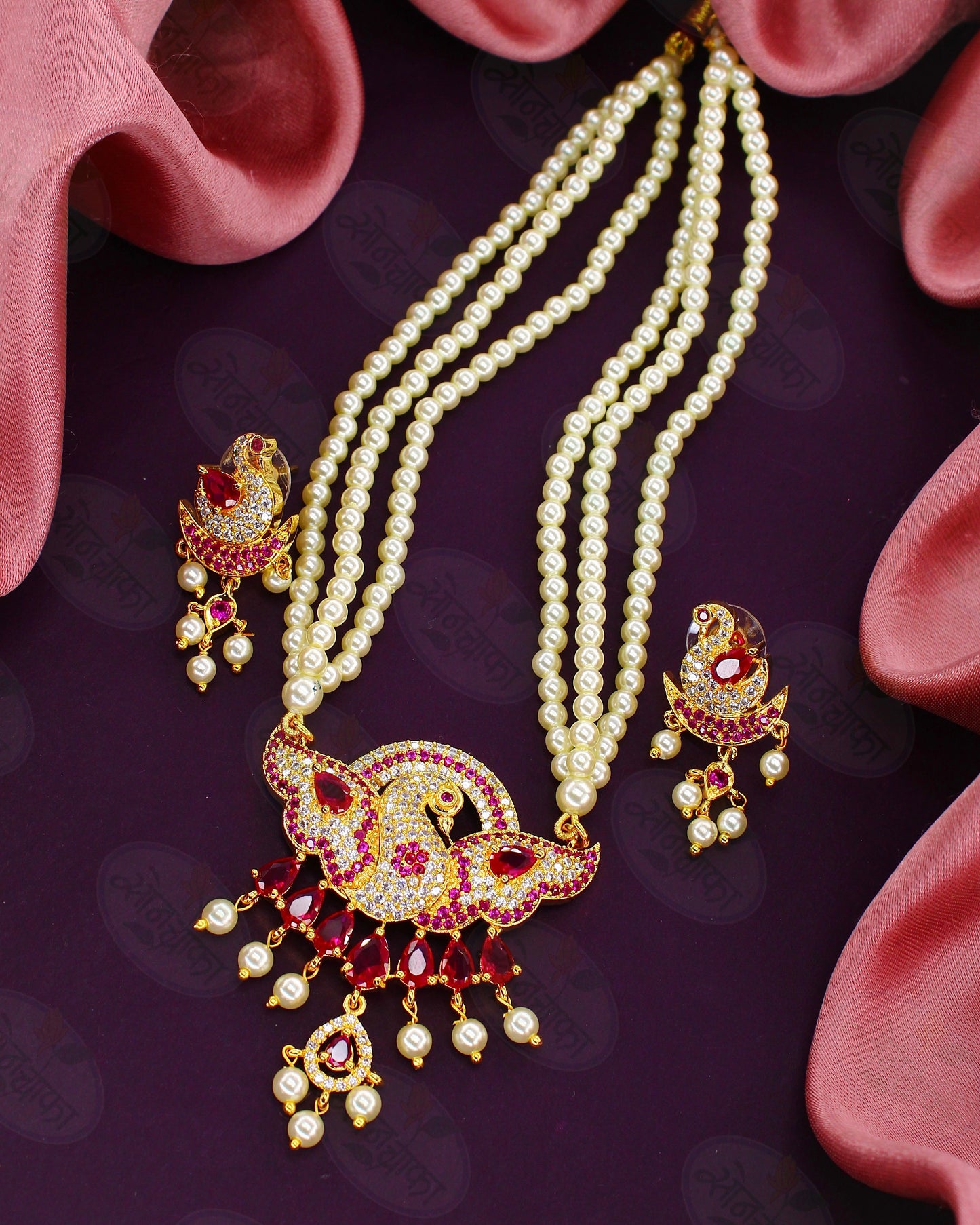Presenting this beautiful Puneri Moti necklace for women who love to wear traditional jewellery. The pendant is studded with sparkling pink-white colour stones and has white pearl droplets for added attraction. It is fashioned from golden finish metal and ensures high durability. This set is made from golden finish metal & will go well with traditional saree.