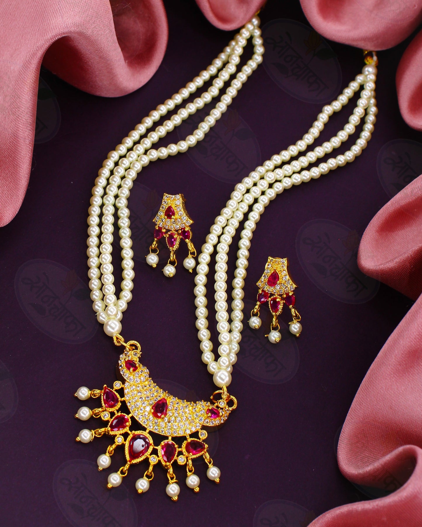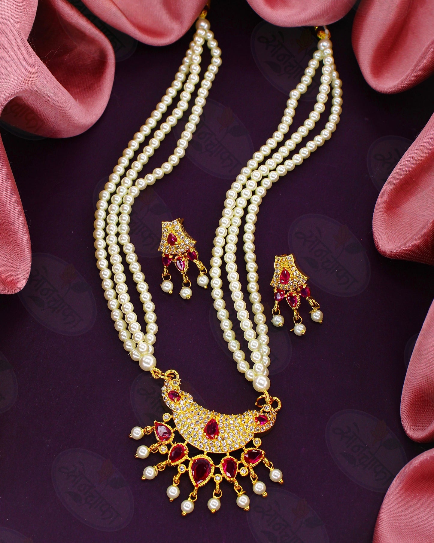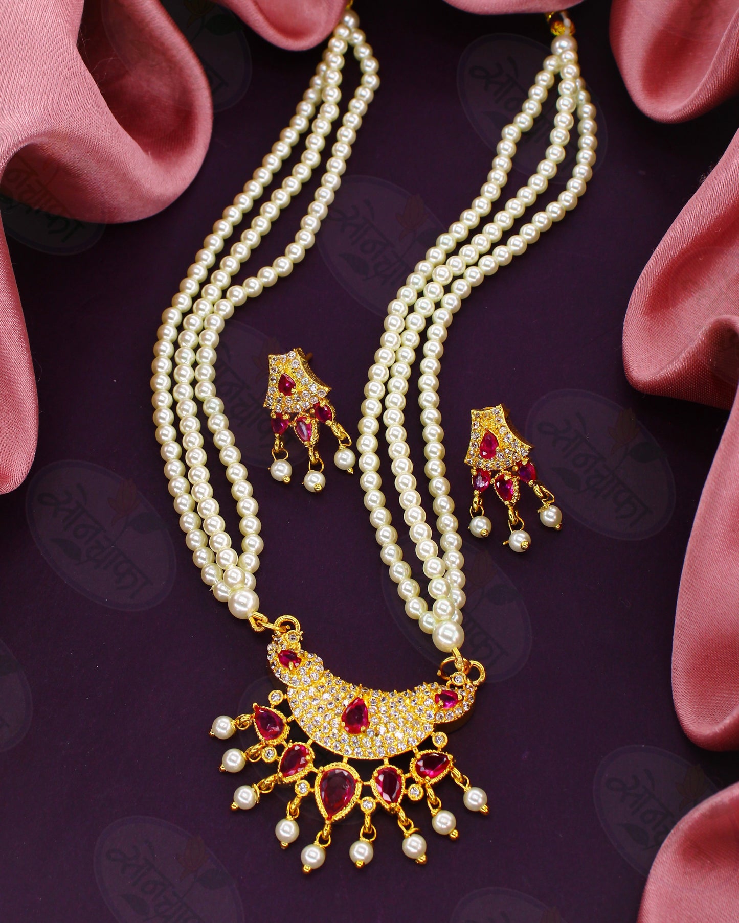 Buy now Wonderful adorable floral necklace set form Sonchafa Jewellery for your trendy look. It is studded with Pink -White stone crafted with golden finish This necklace set has wonderful pearl beads droplets for more stylish look.