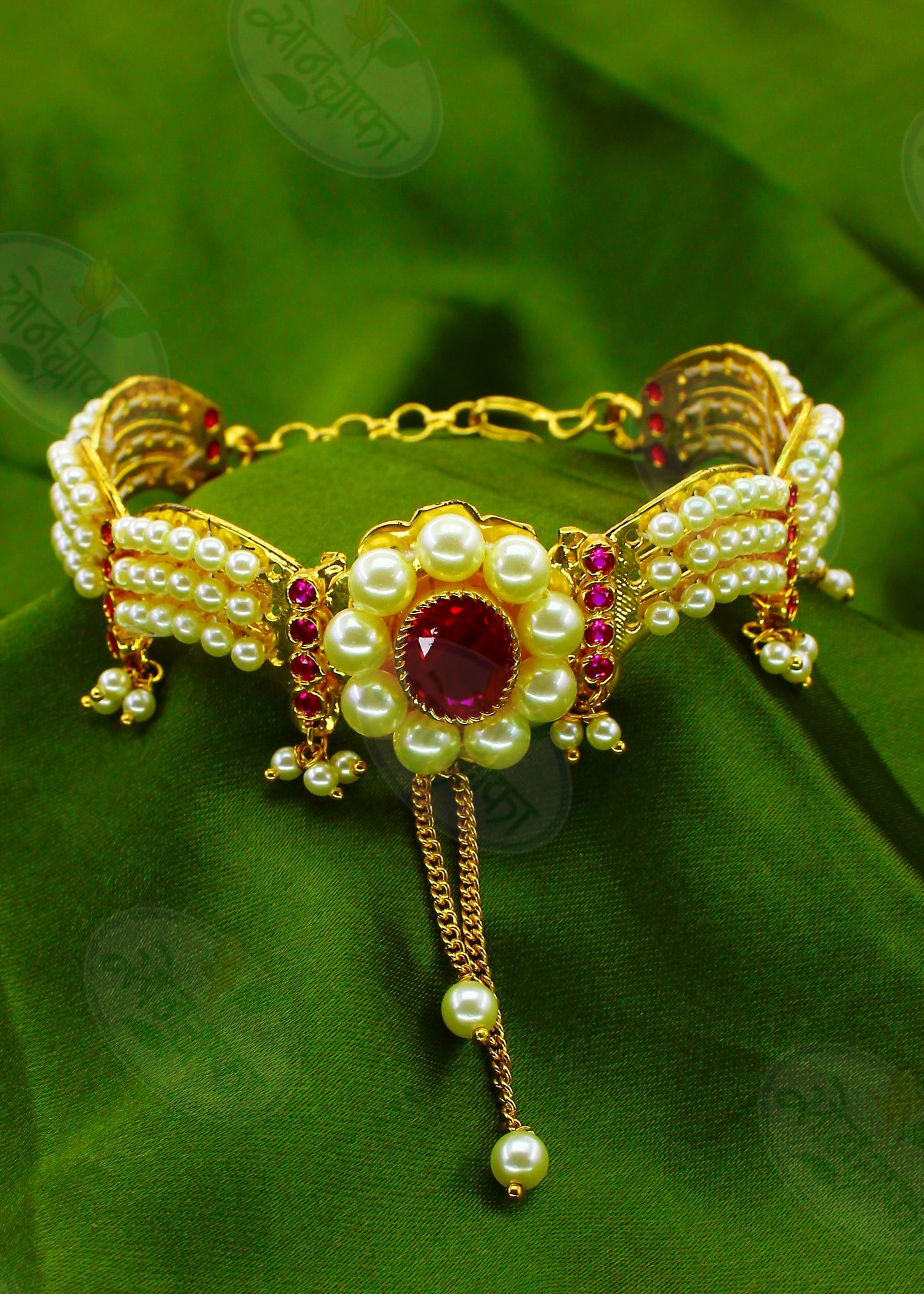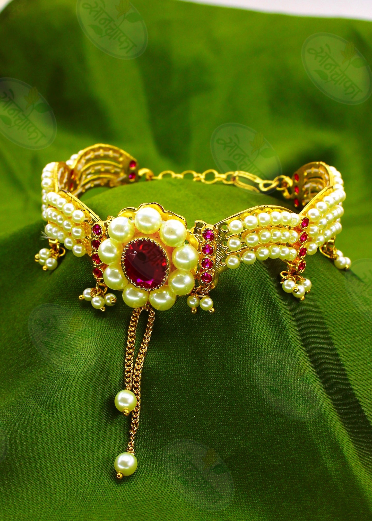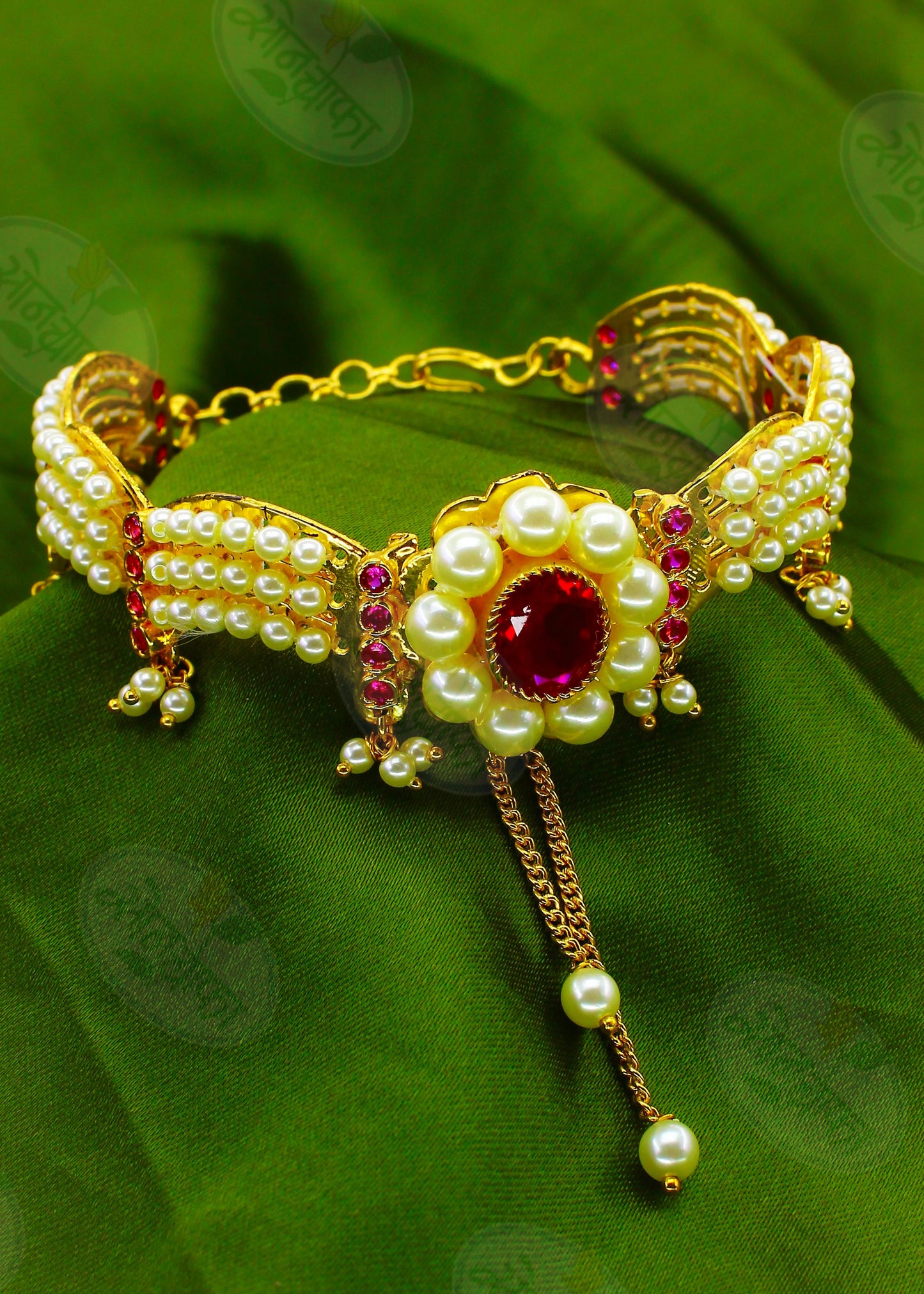 If you wish to get that perfect Maharashtrian look then you must pick this pink colour beautiful waki from the stock of Sonchafa Jewellery. It is embedded with sparkling pink colour stones and has pearl bead droplets for added attraction. This bajuband is superior in quality.