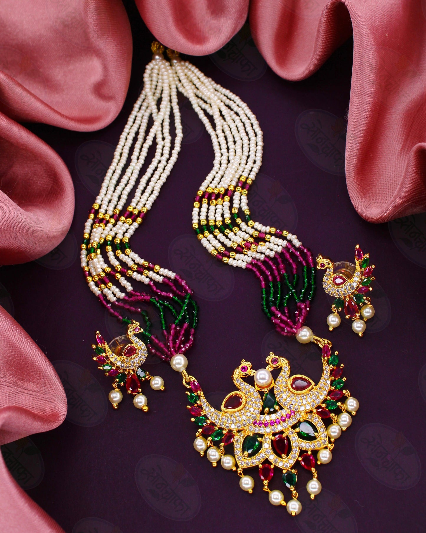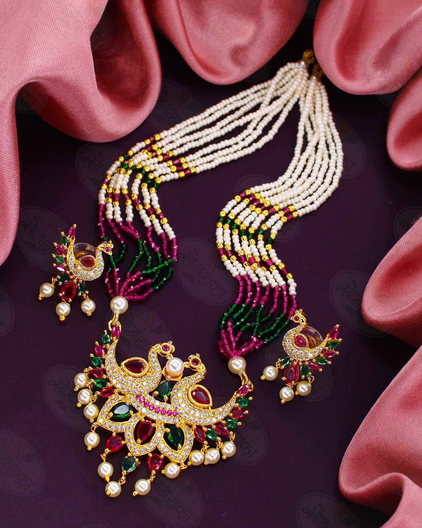 Checkout Exclusive moti collection from Sonchafa Jewellery which is best to combine with paithani saree. The pendant is encrusted with sparkling pink, white color stones and made from golden finish metal. It is woven with good quality pearls and comes with adjustable dori, so that you can fit it properly according to your neck fit.