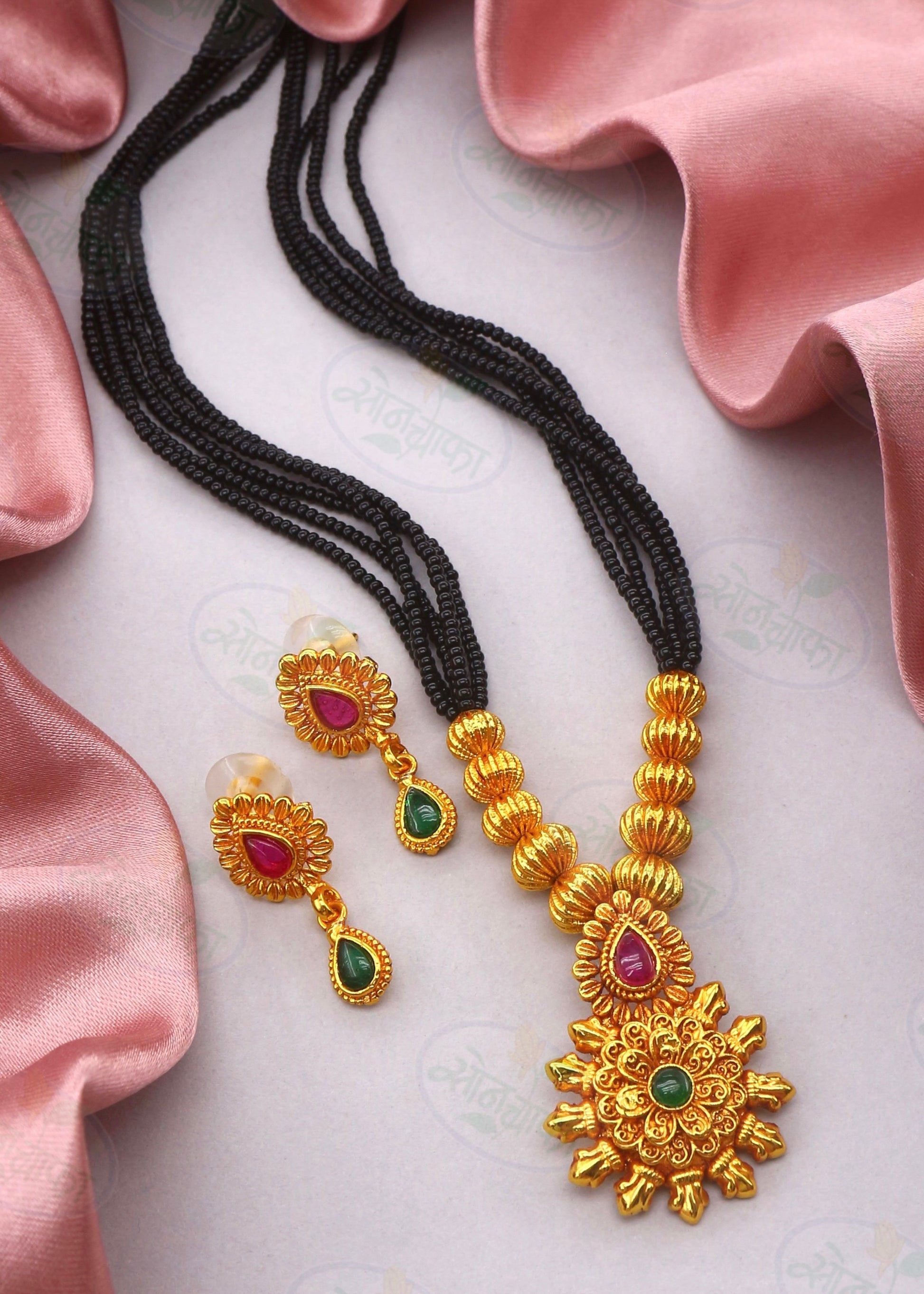 Complete your Maharashtrian look by clubbing this floral designer adorable mangaslutra with your paithani saree from Sonchafa Jewellery. The five layer black beaded chain is styled with pink stones. This Mangalsutra is easy to wear and comfortable to hold all day long.