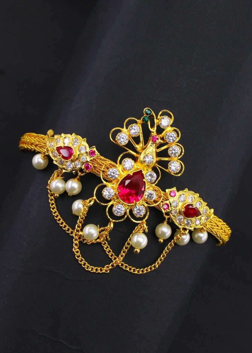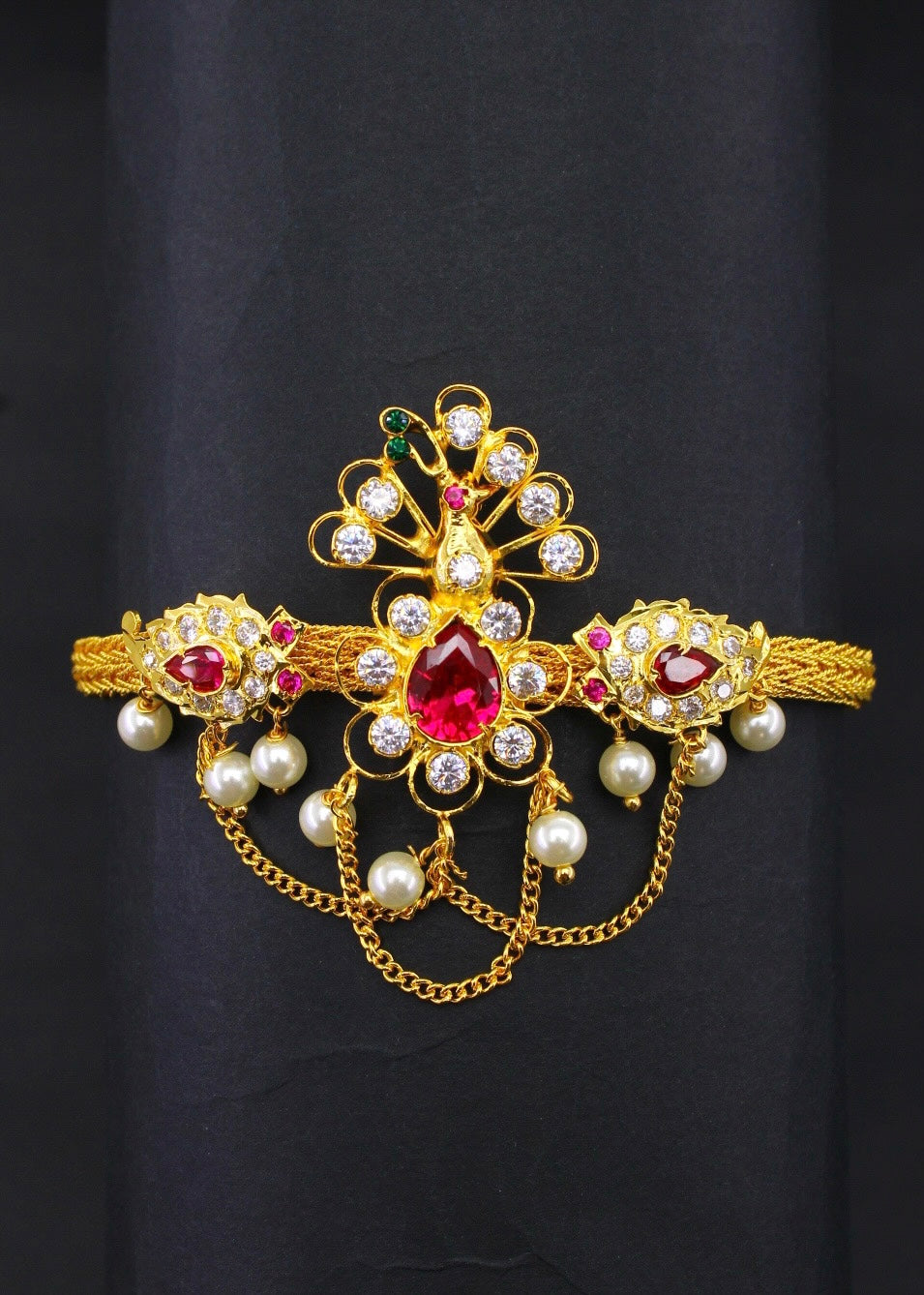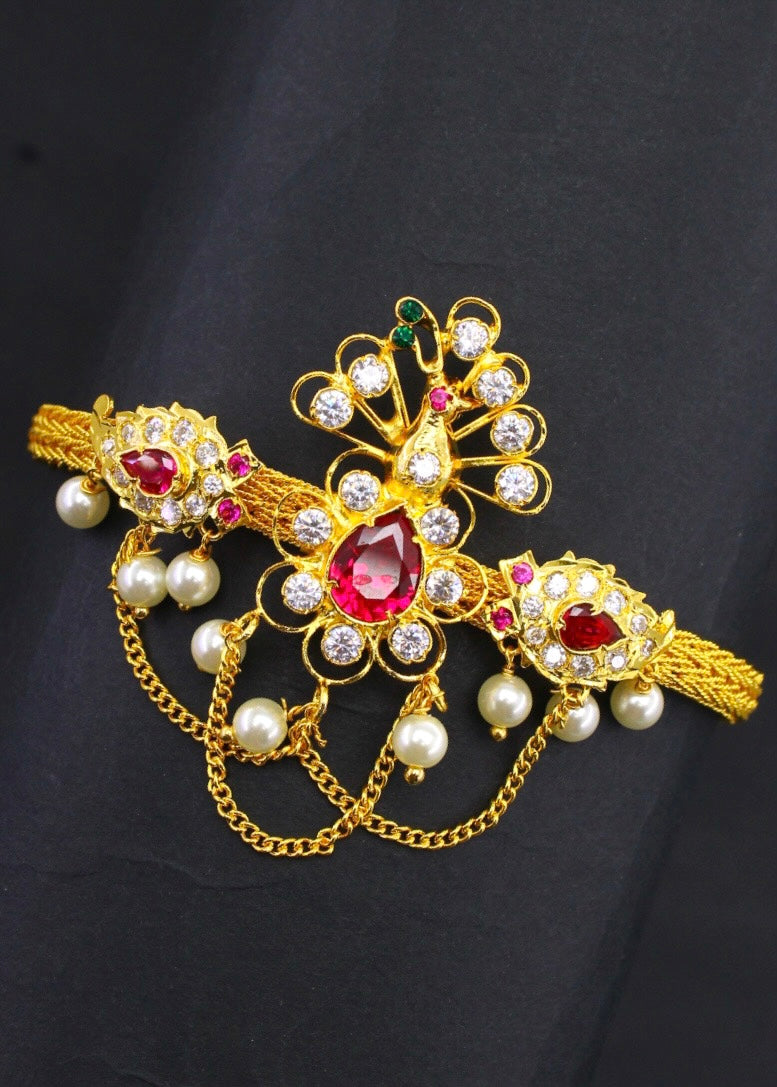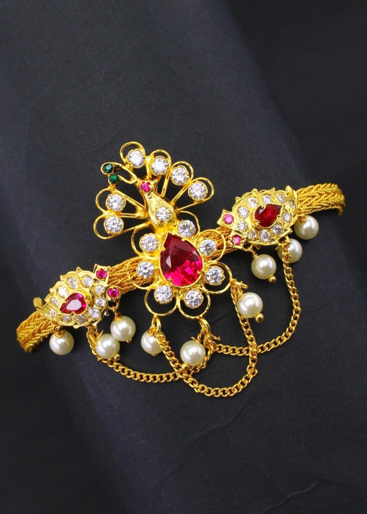 Here is a Peacock designer waki from Sonchafa Jewellery. This waki is made from golden finish metal. It has pink - white stones and a peacock carved design. This waki will look gorgeous when adorned with traditional outfits.