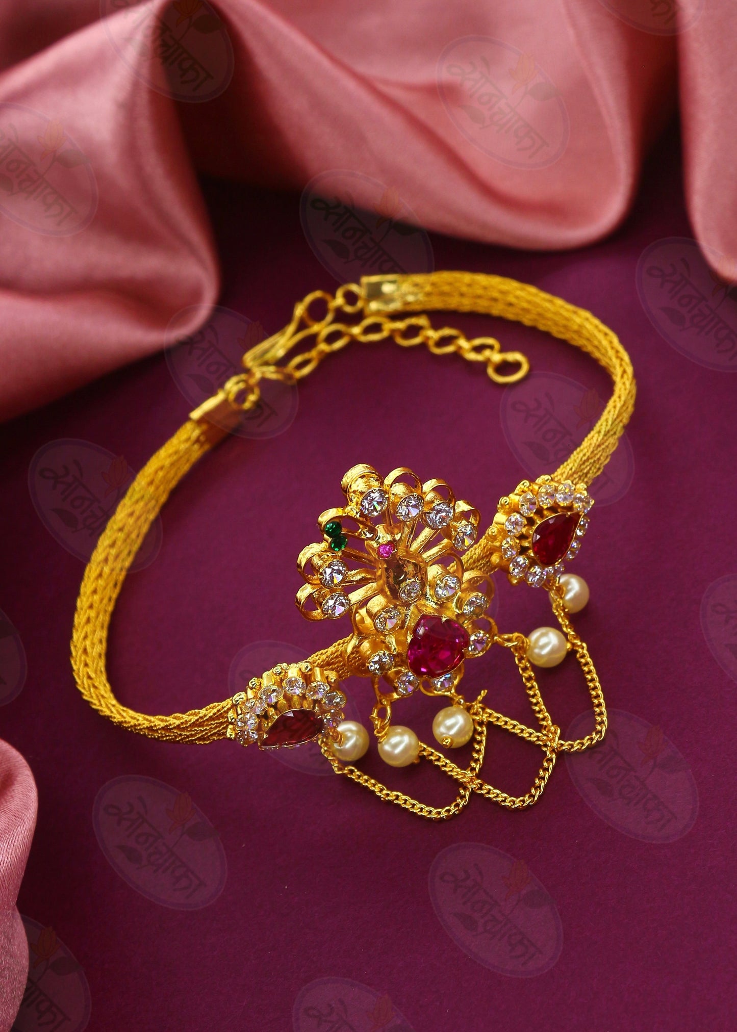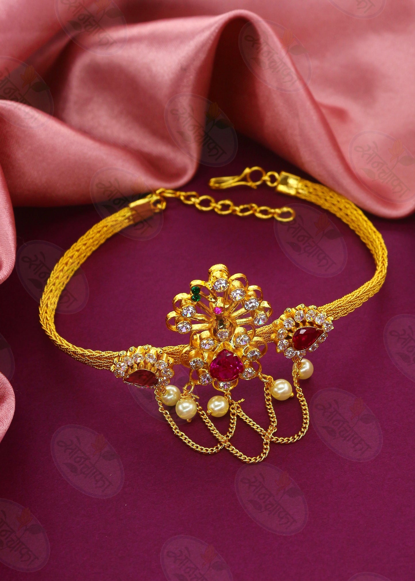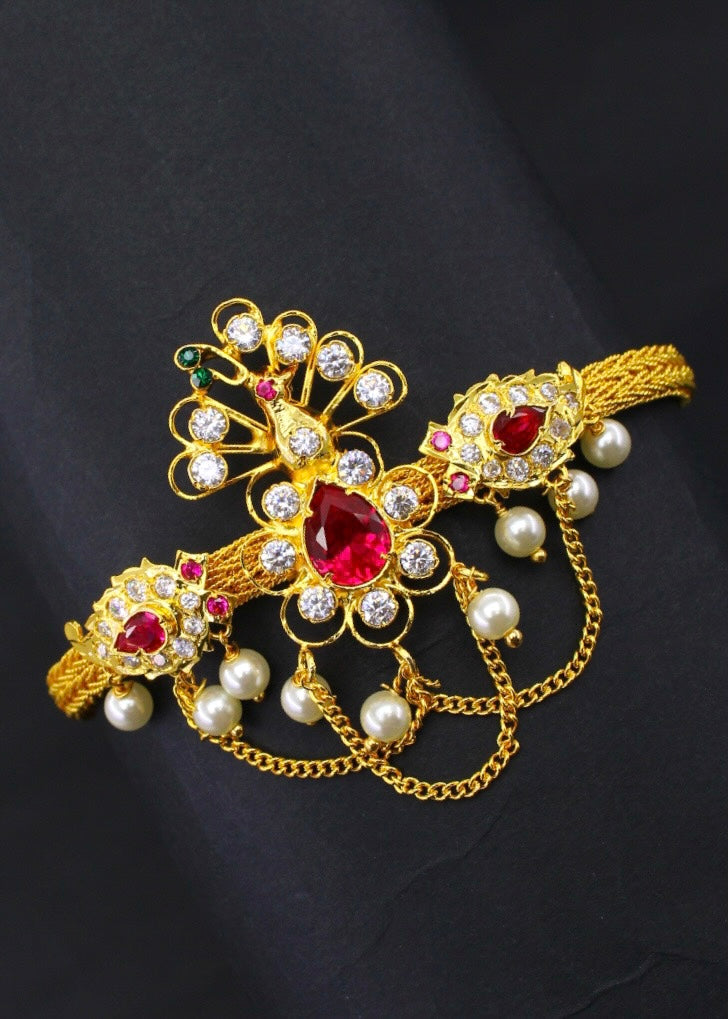 Here is a Peacock designer waki from Sonchafa Jewellery. This waki is made from golden finish metal. It has pink - white stones and a peacock carved design. This waki will look gorgeous when adorned with traditional outfits.