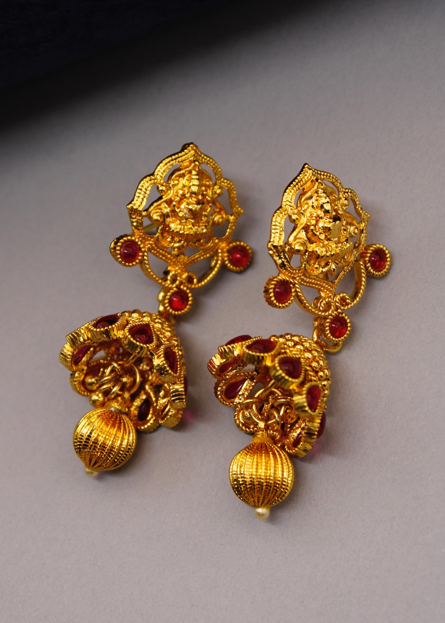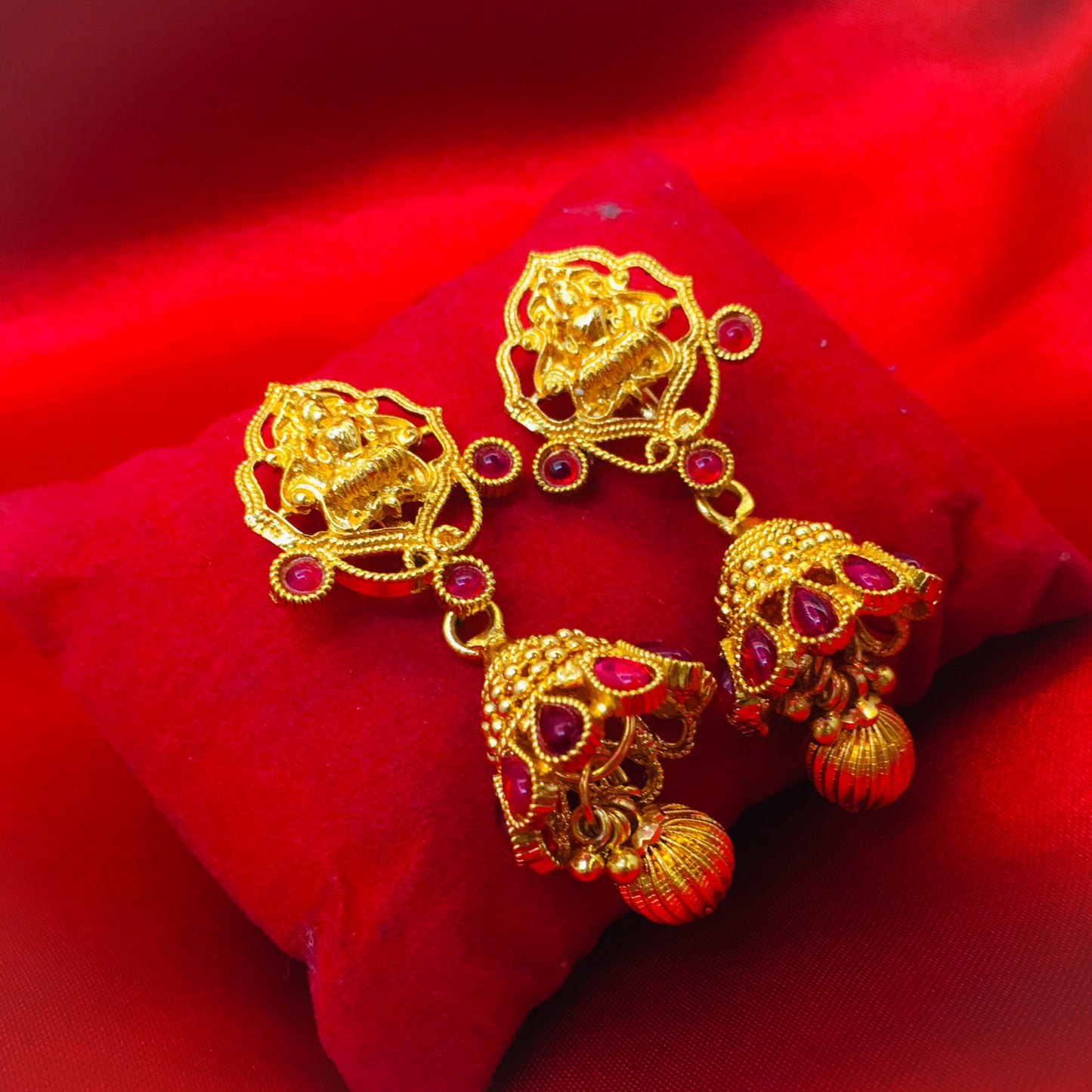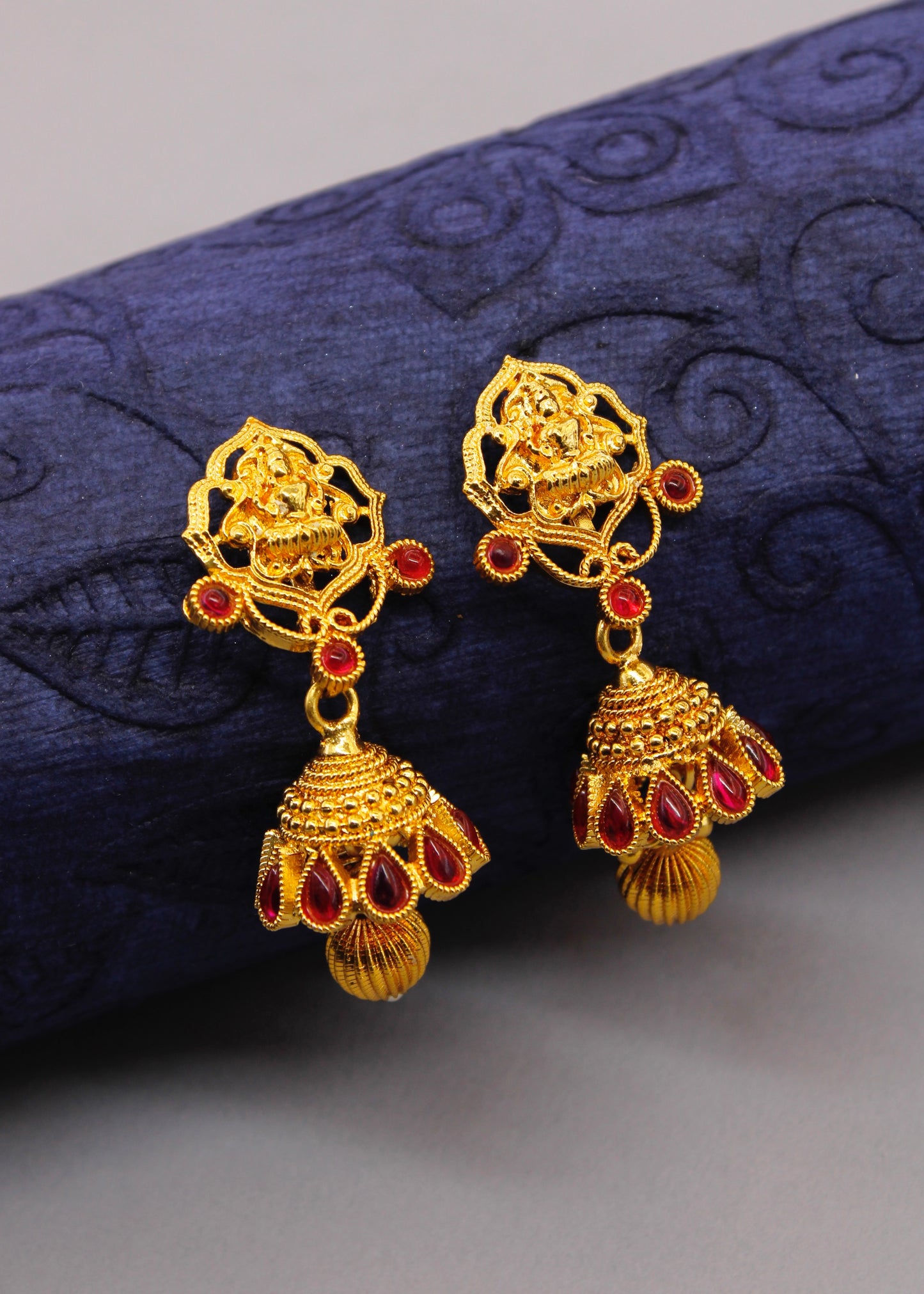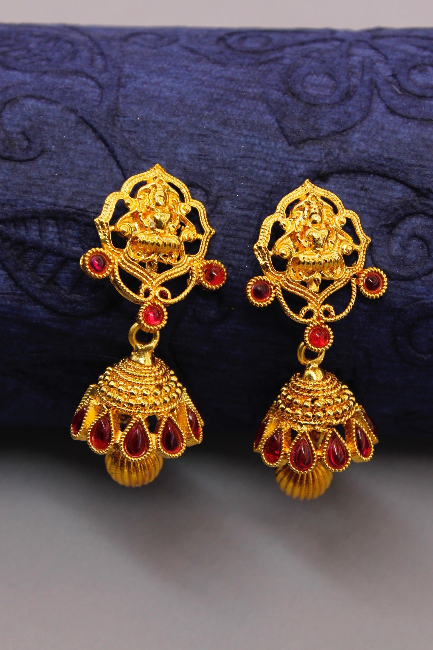 Creatively designed this pair of gold plated in Geru reddish Tinge finish jhumki earrings from Sonchafa. They are embedded with sparkling kemp & Laxmi design tops. These jhumkis have golden bead droplet for added attraction.
