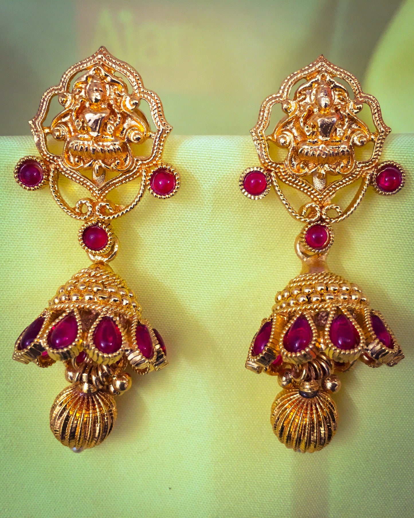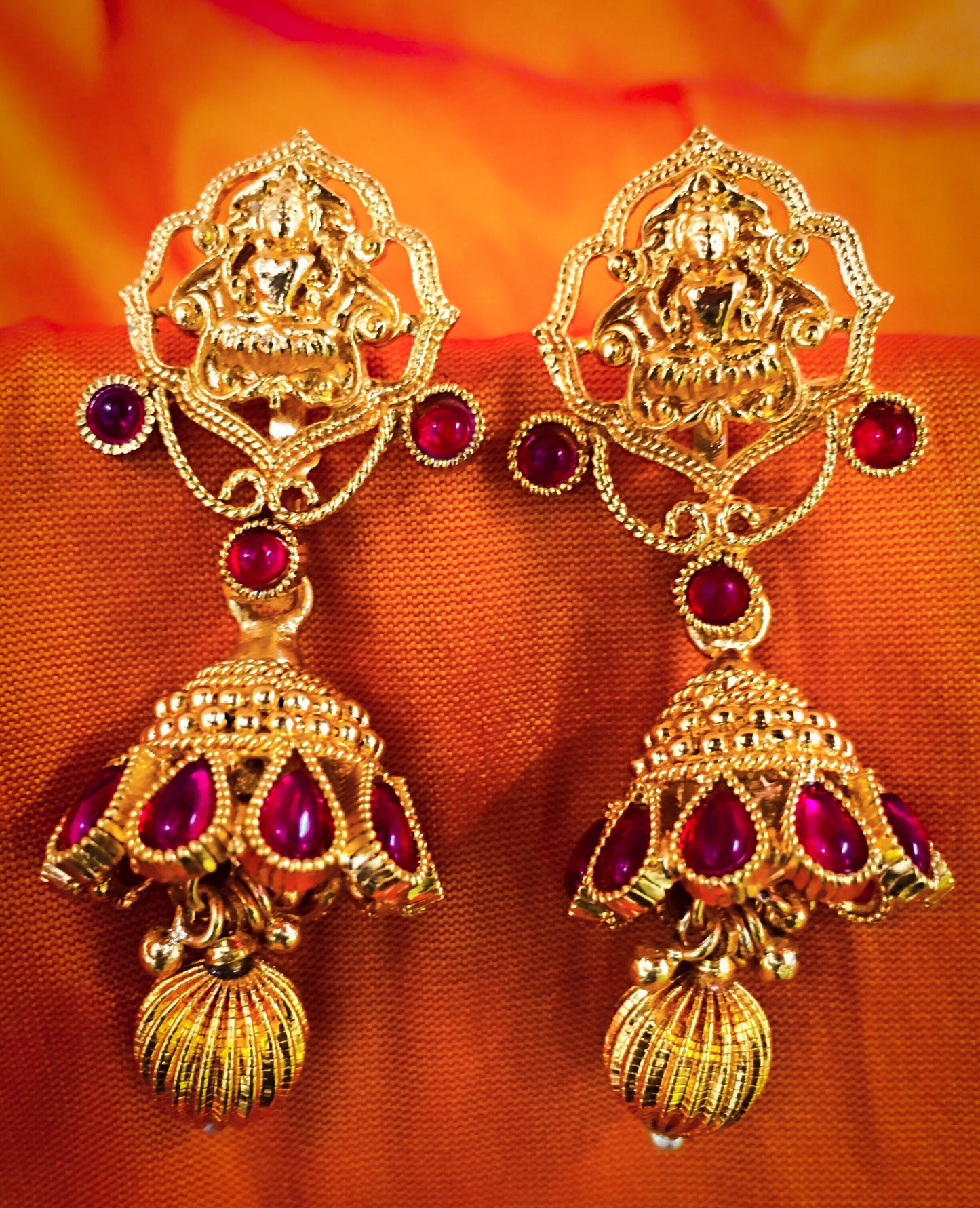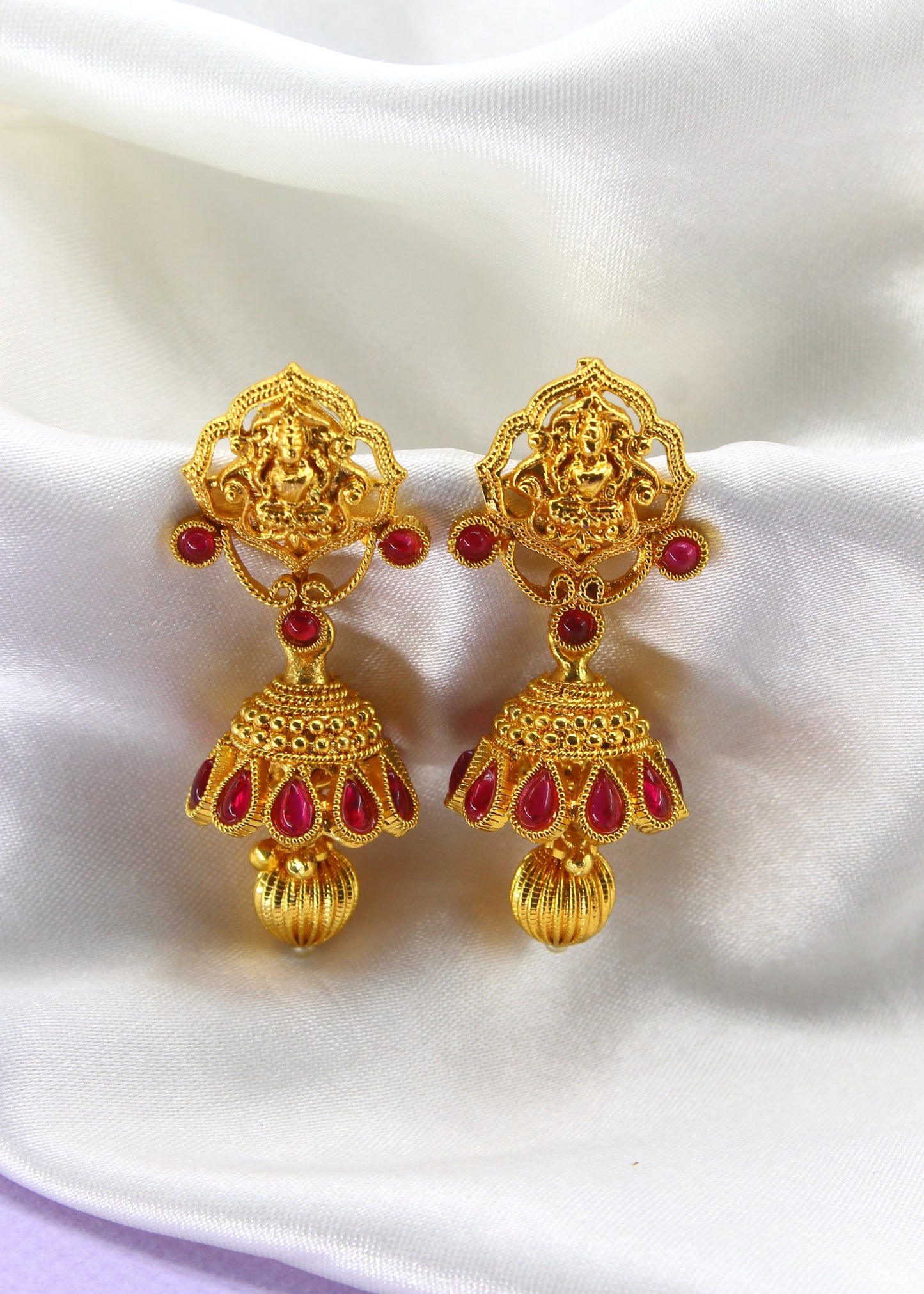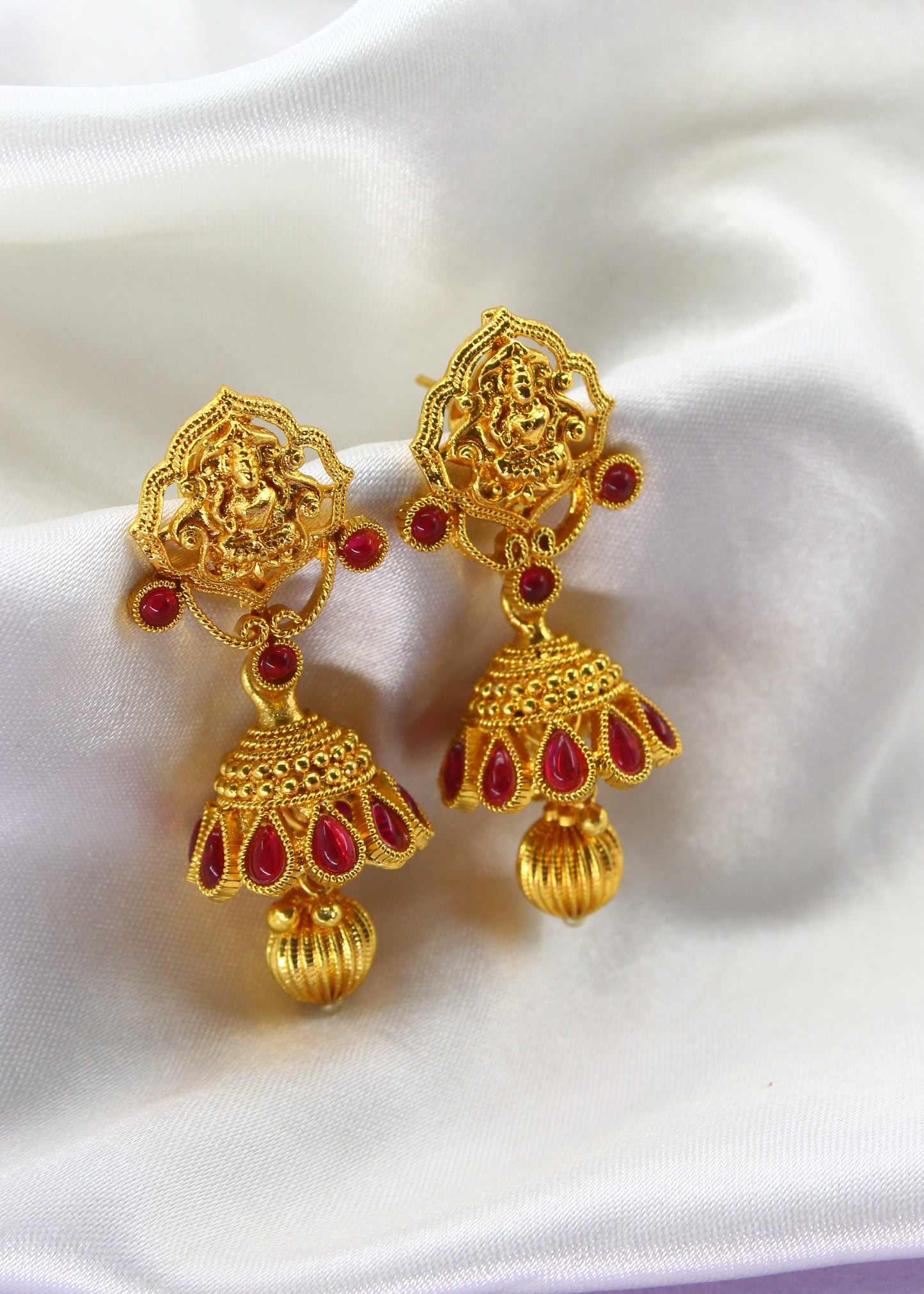Creatively designed this pair of gold plated in Geru reddish Tinge finish jhumki earrings from Sonchafa. They are embedded with sparkling kemp & Laxmi design tops. These jhumkis have golden bead droplet for added attraction.