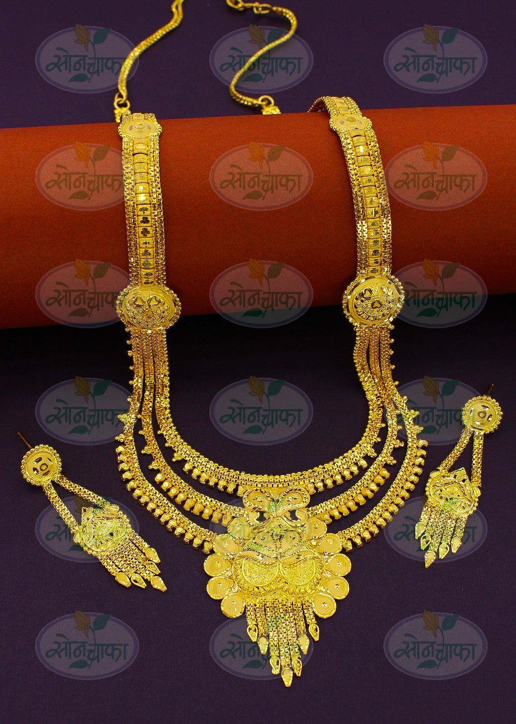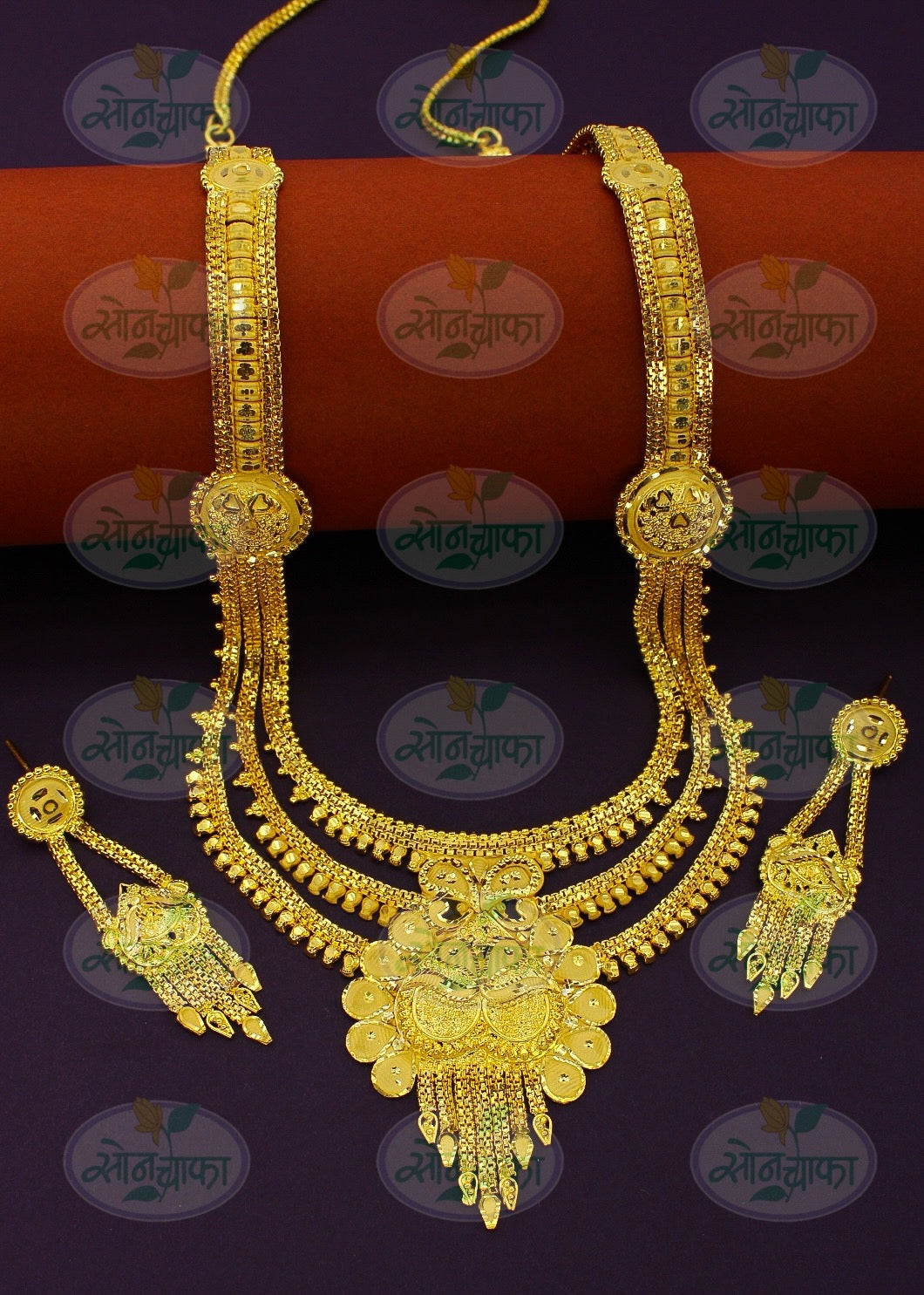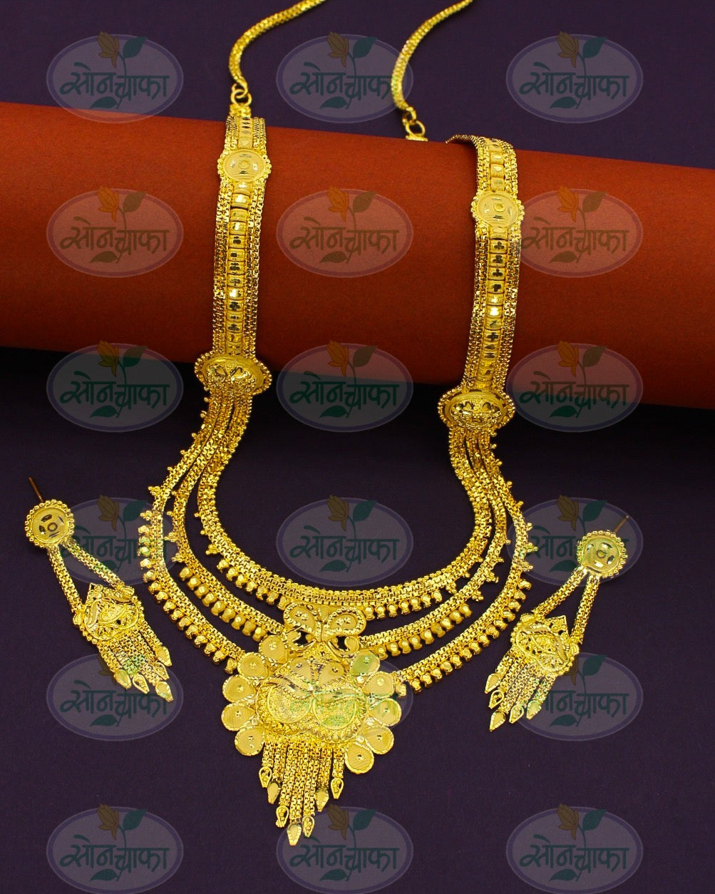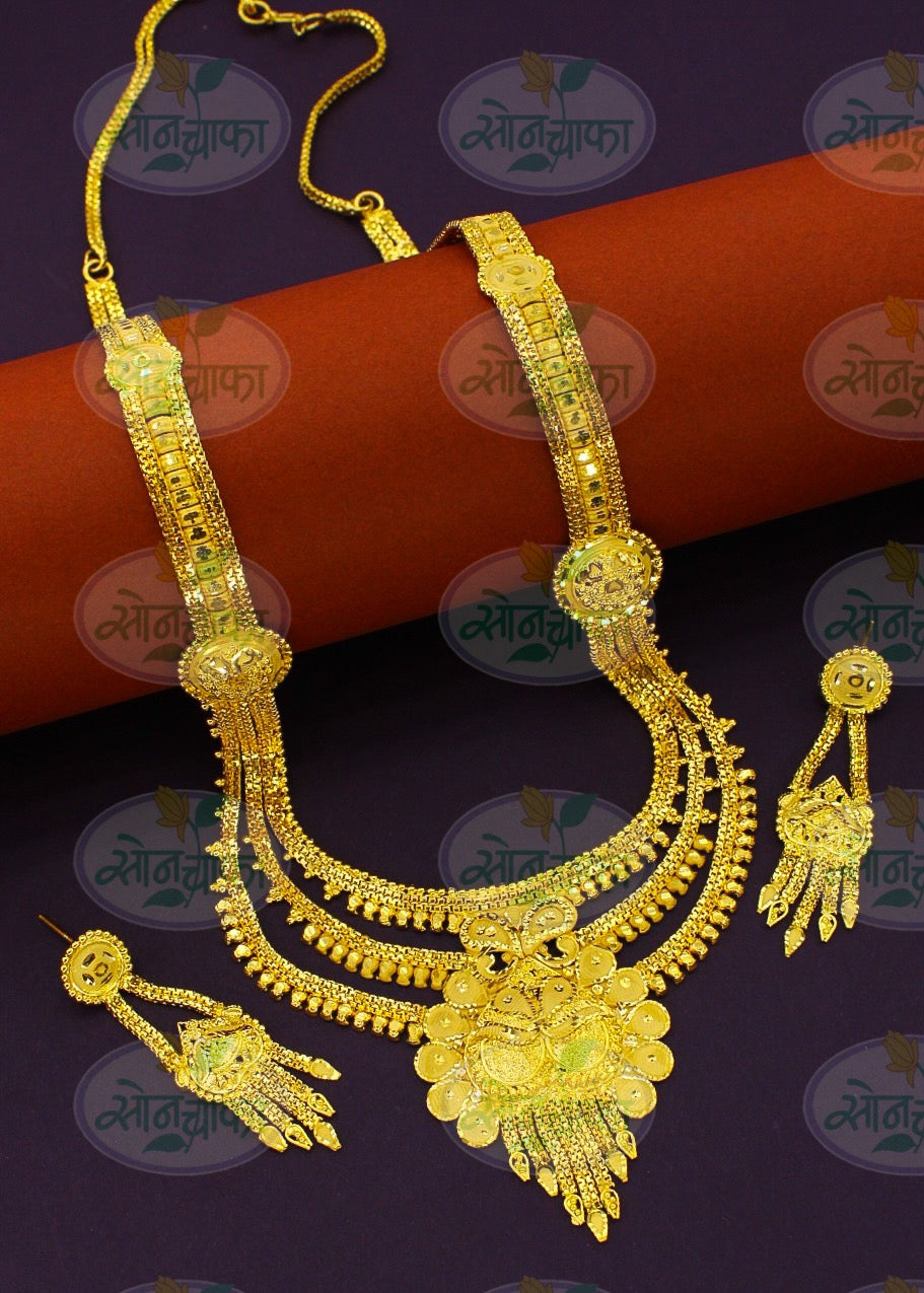 Sonchafa Jewellers offers to you this 1Gram gold plated designer necklace set. The pendant has attractive carving design on golden finish surface and made from gold plated metal. It has attractive earrings. Excellent quality and high durability of this necklace set.