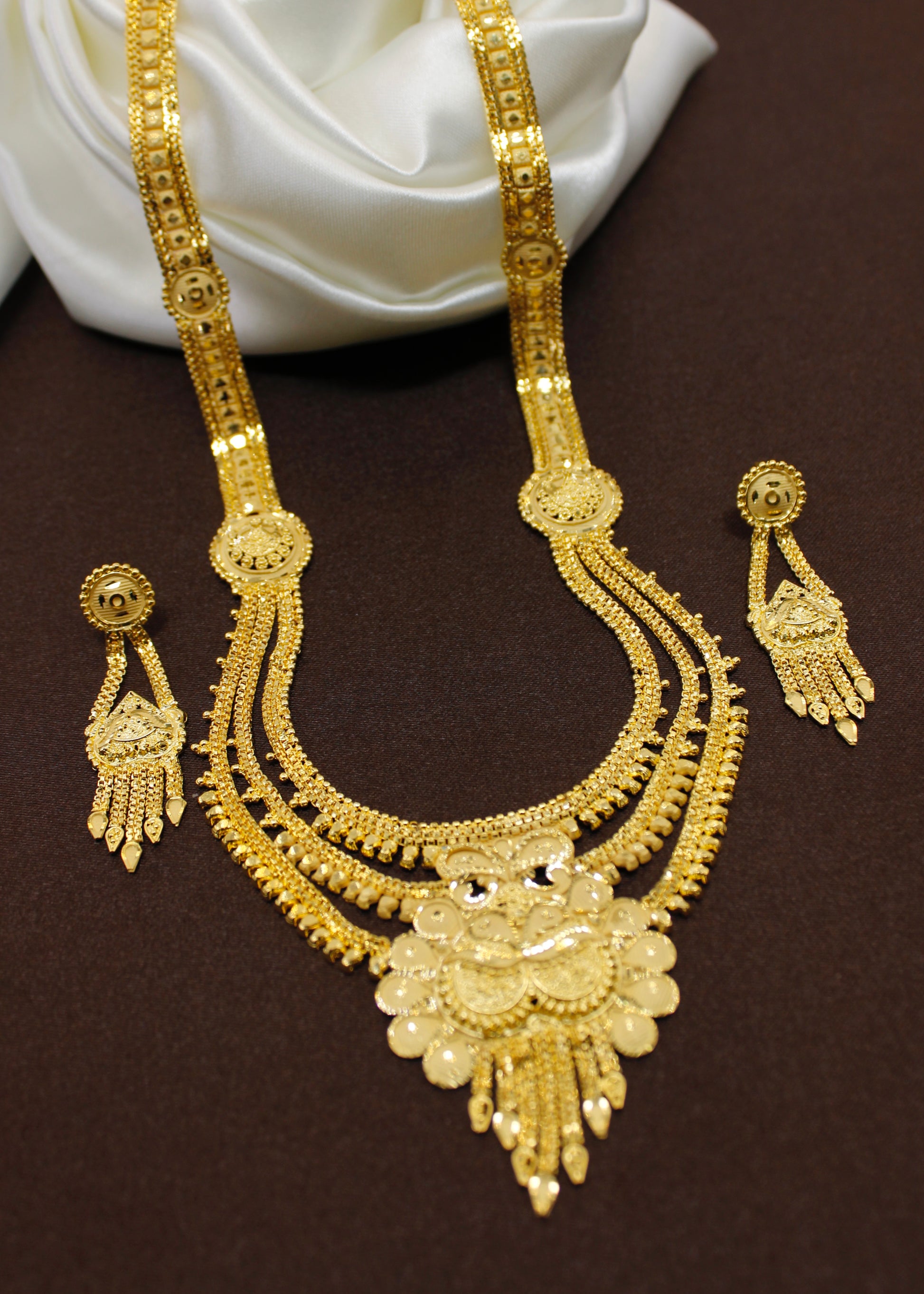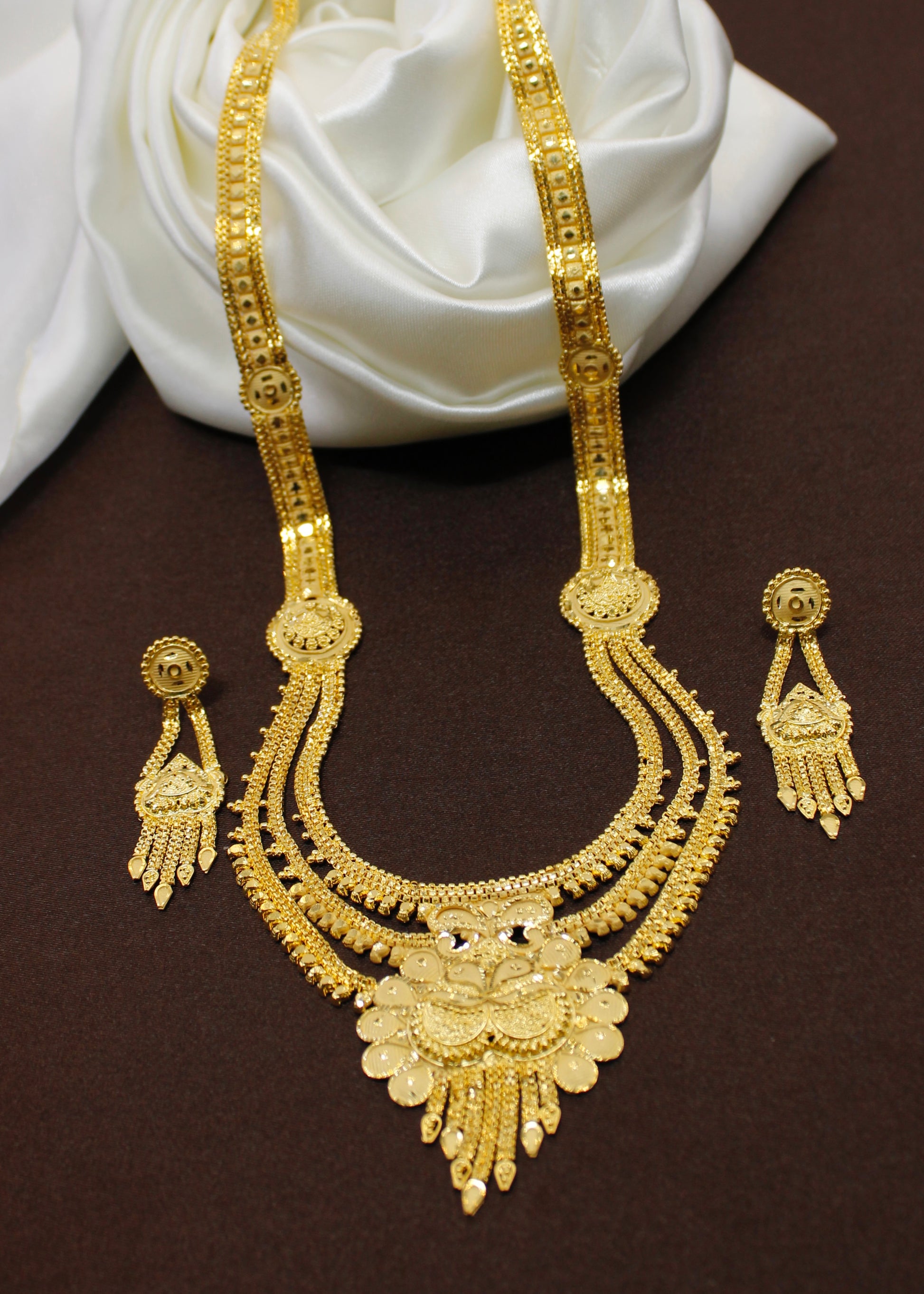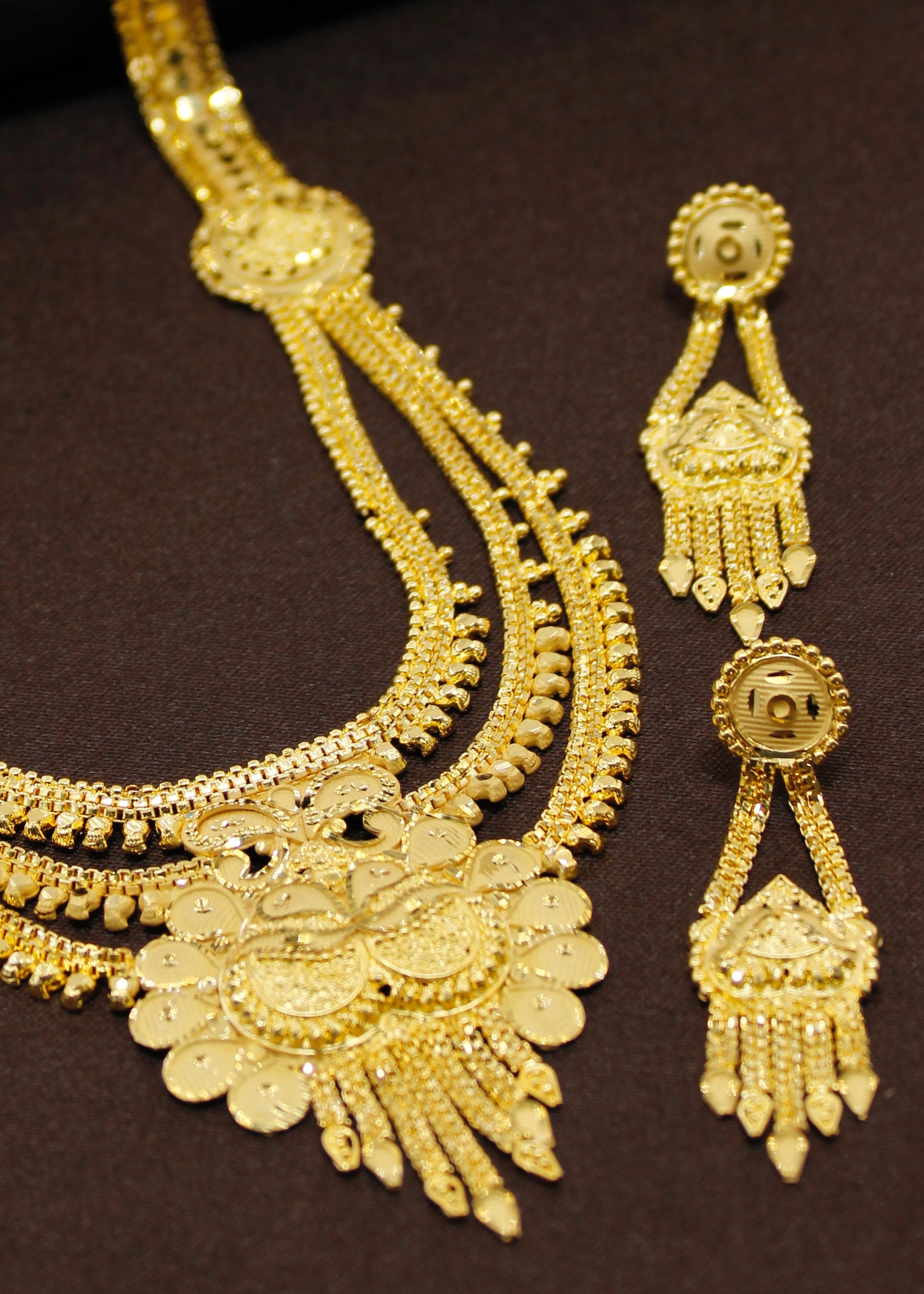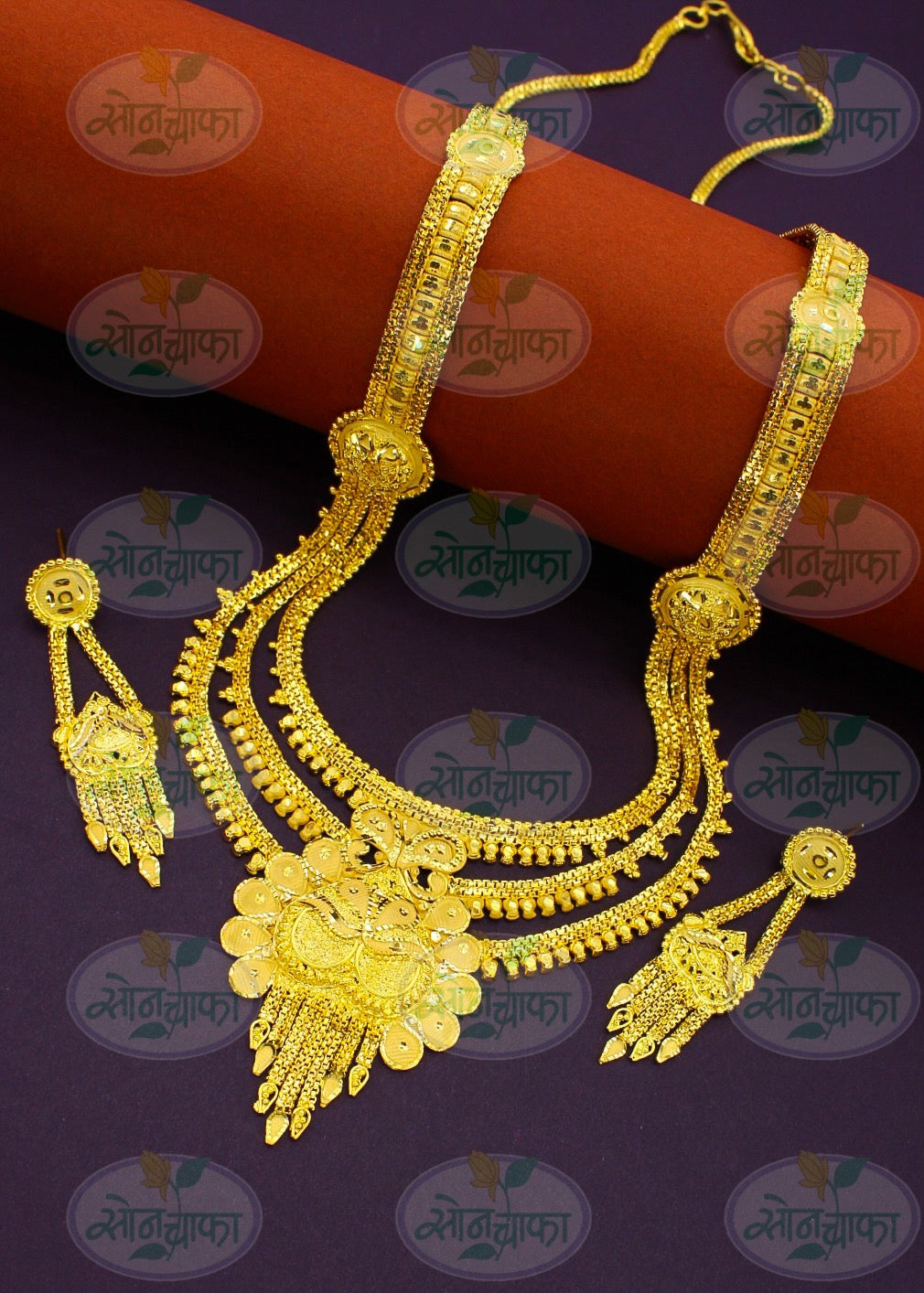 Sonchafa Jewellers offers to you this 1Gram gold plated designer necklace set. The pendant has attractive carving design on golden finish surface and made from gold plated metal. It has attractive earrings. Excellent quality and high durability of this necklace set.