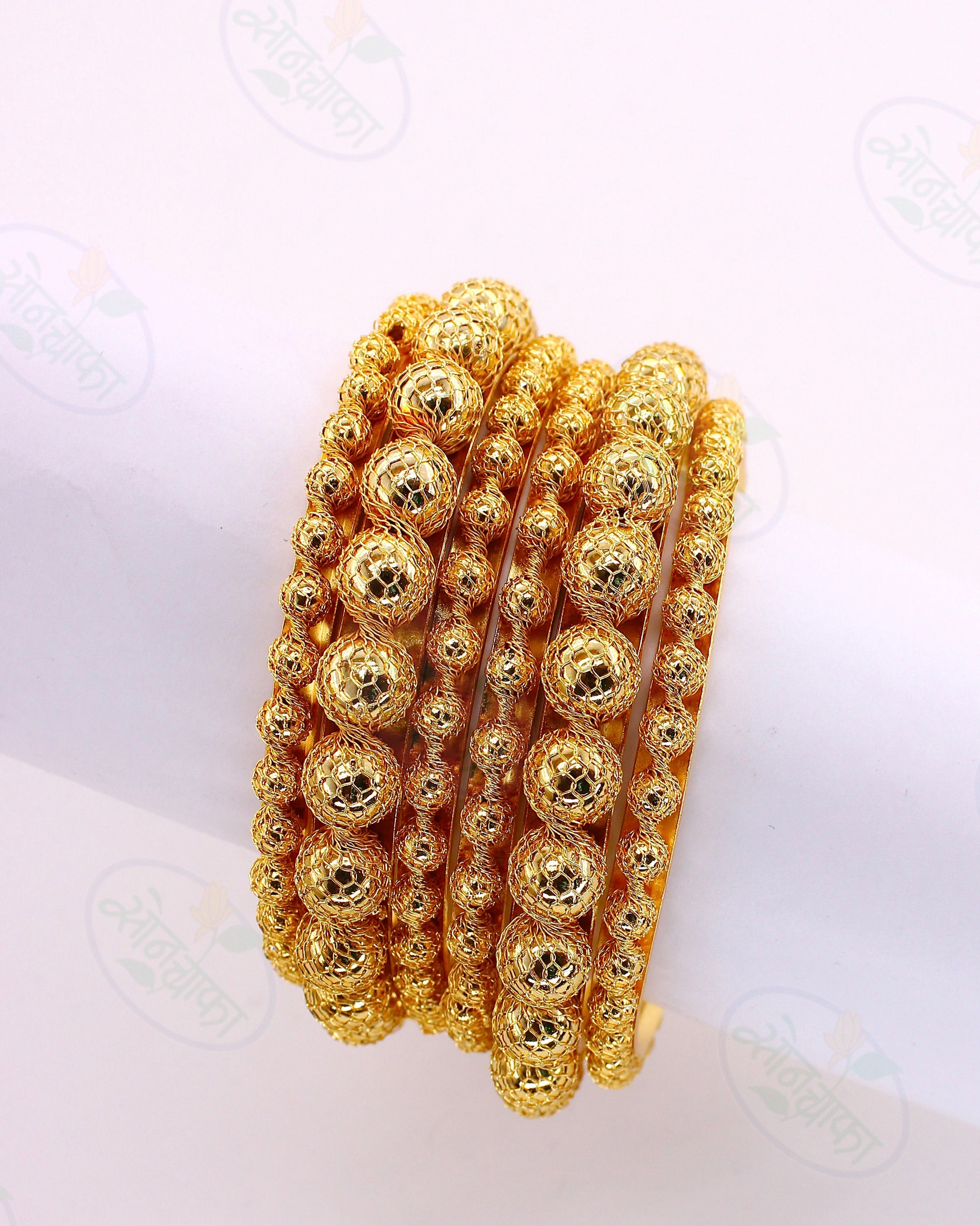 Golden colour pair of bangles from Sonchafa Jewellery will blow your heart at very first look. These are wonderfully woven with bright pearl beads and made from antique gold finish metal. These bangles are superior in quality and long lasting. These pearl with jali bangles are skin-friendly.