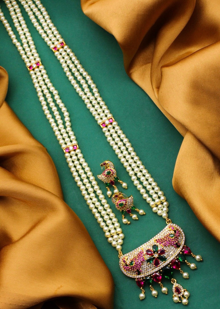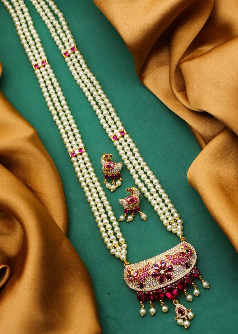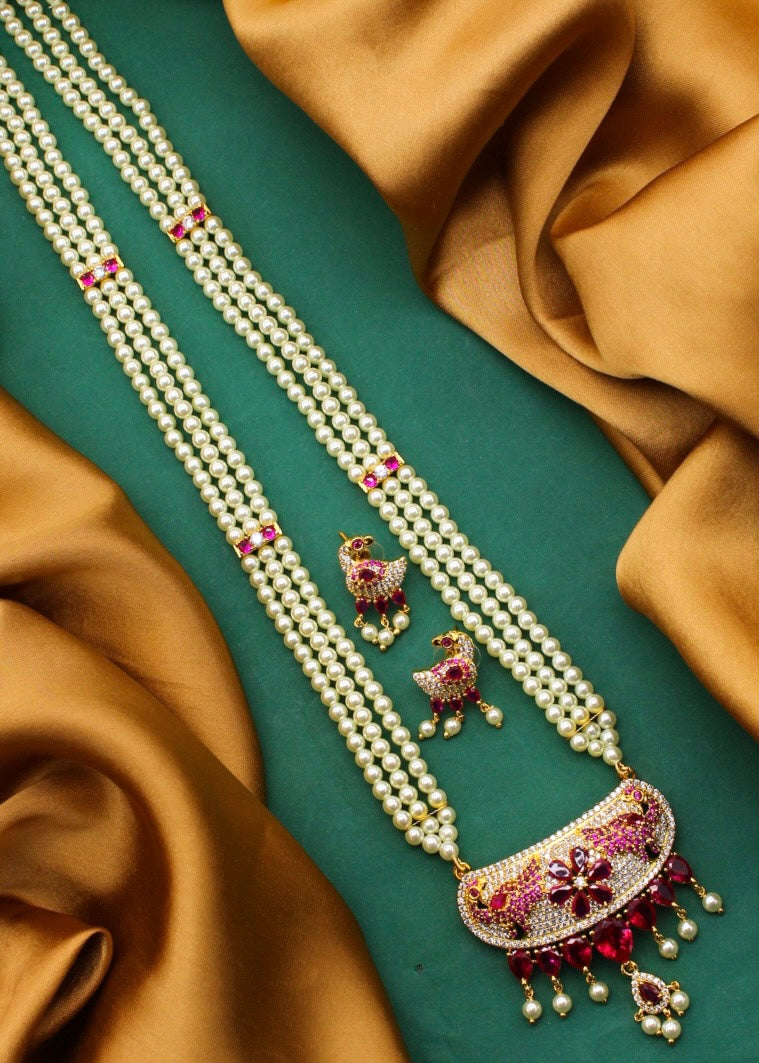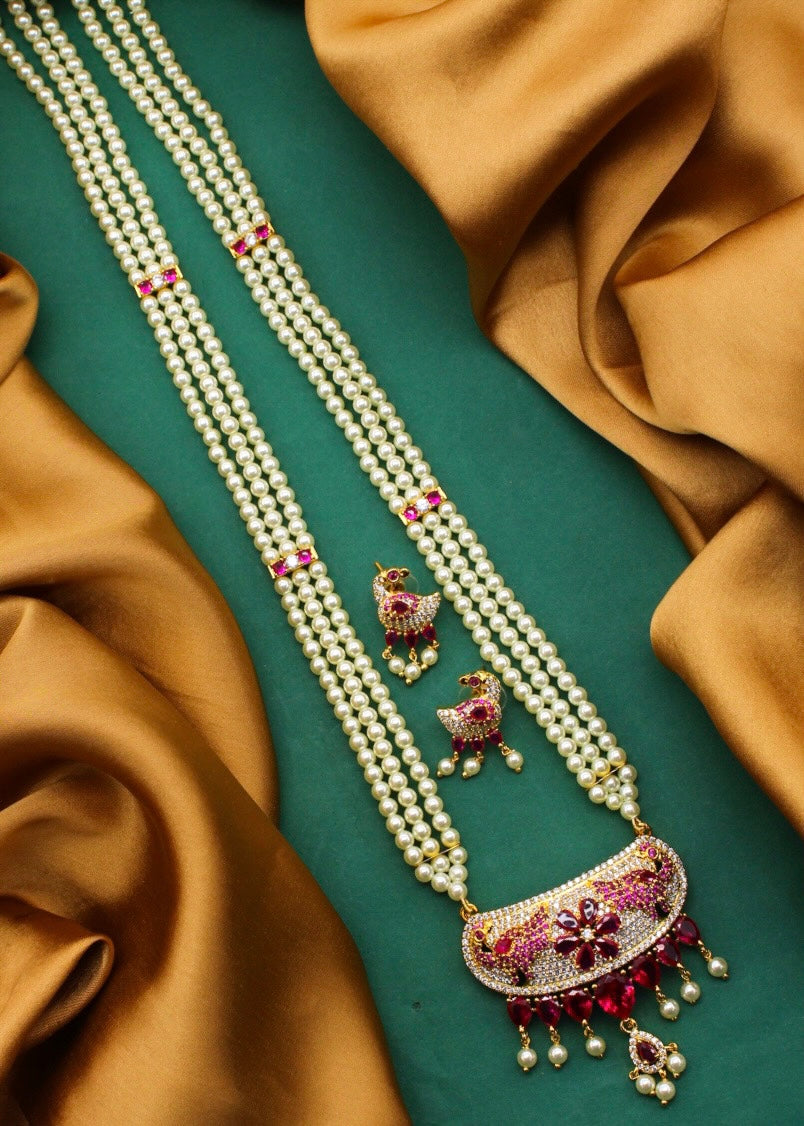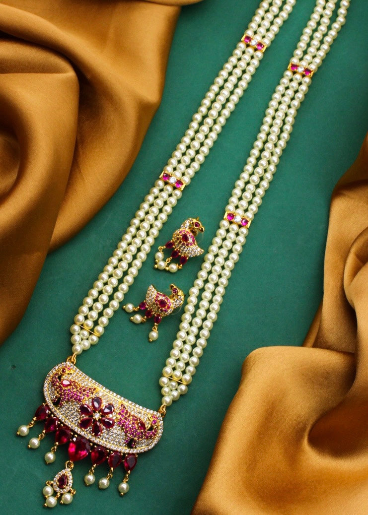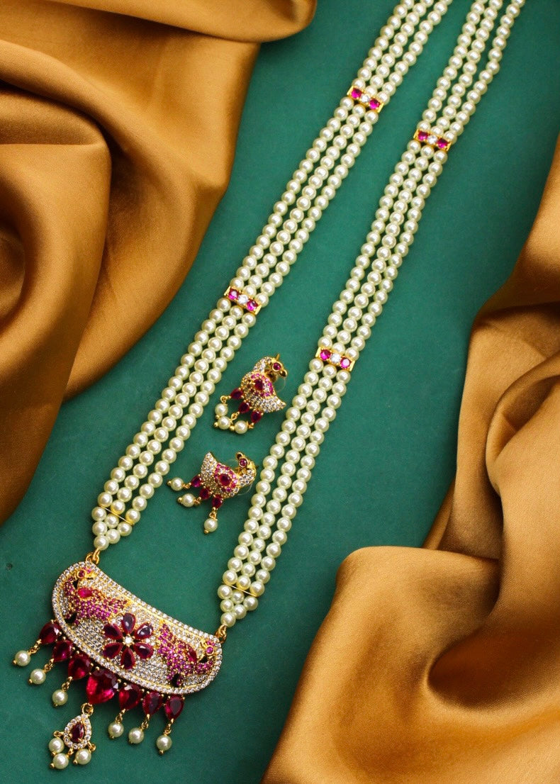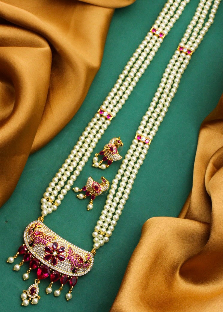 Buy now Wonderful adorable floral necklace set form Sonchafa Jewellery for your trendy look. It is studded with Pink -White stone crafted with golden finish This necklace set has wonderful pearl beads droplets for more stylish look.