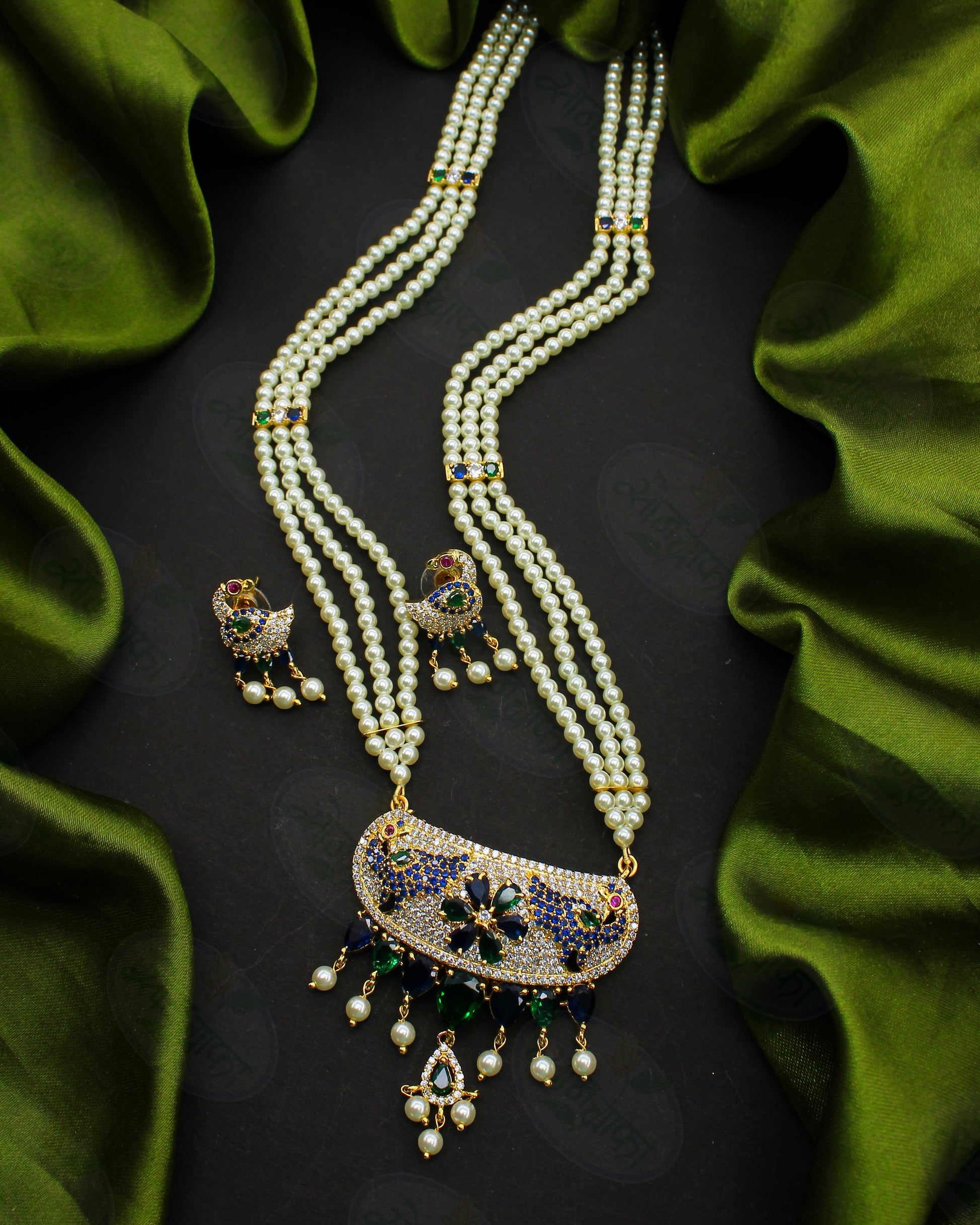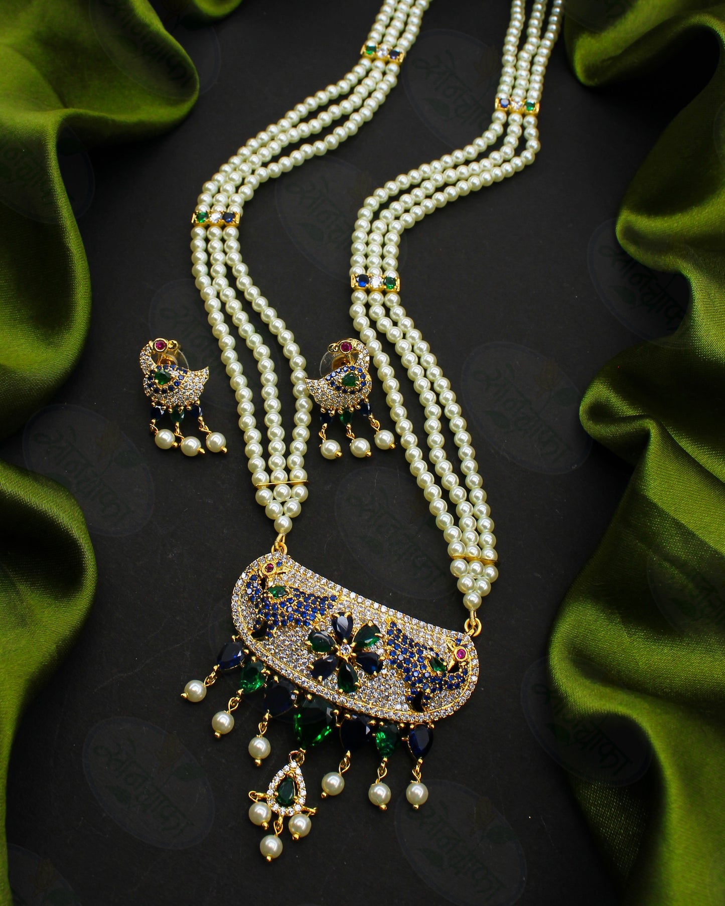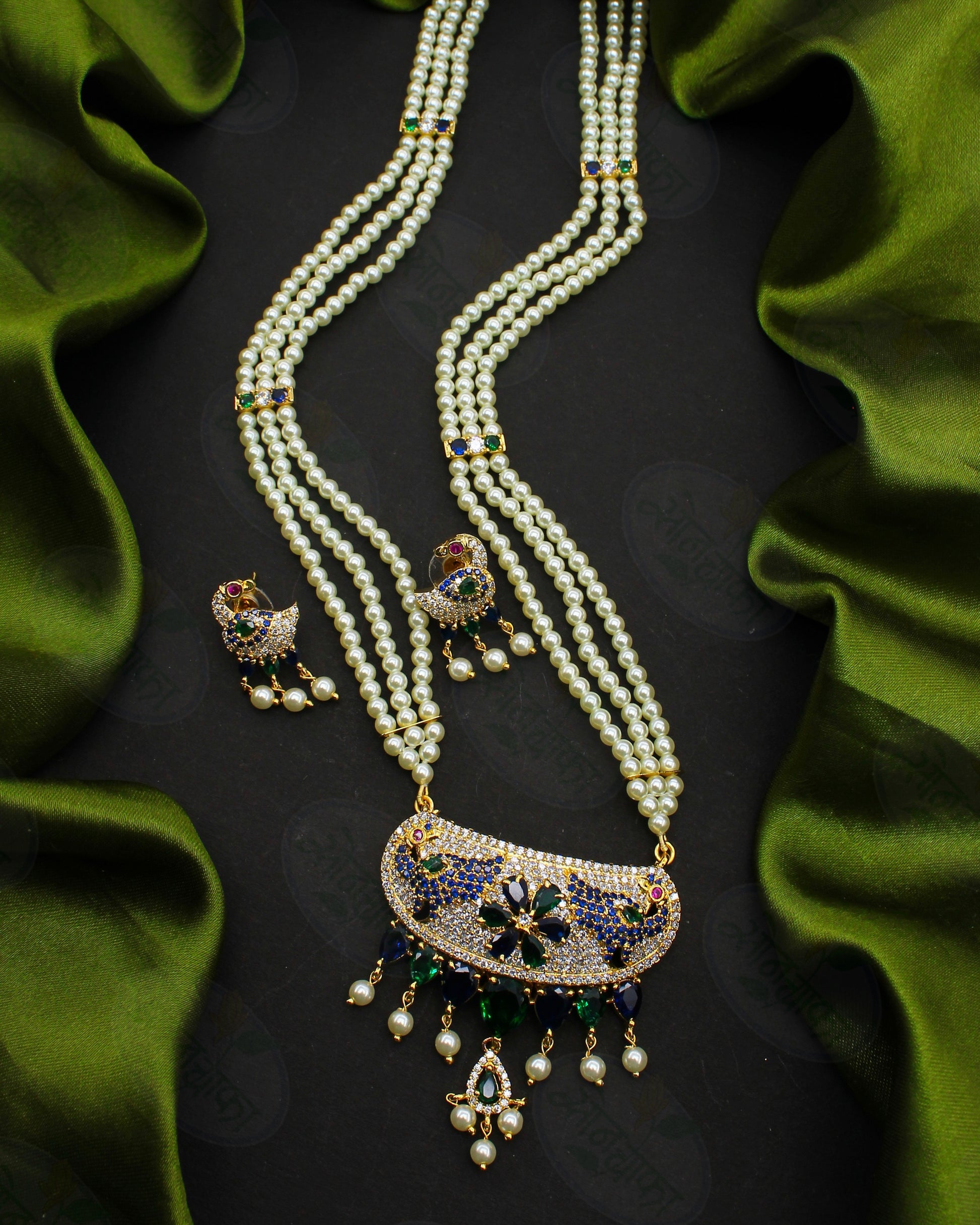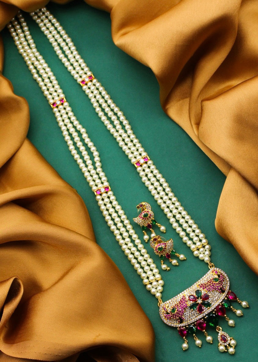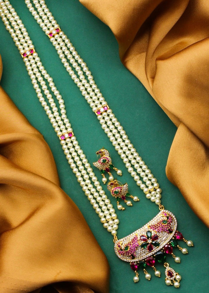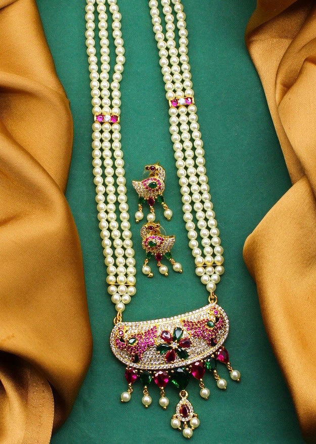Buy now Wonderful adorable floral necklace set form Sonchafa Jewellery for your trendy look. It is studded with Pink -White stone crafted with golden finish This necklace set has wonderful pearl beads droplets for more stylish look.