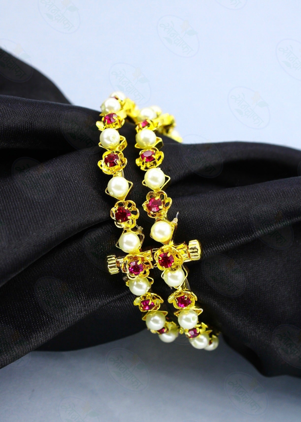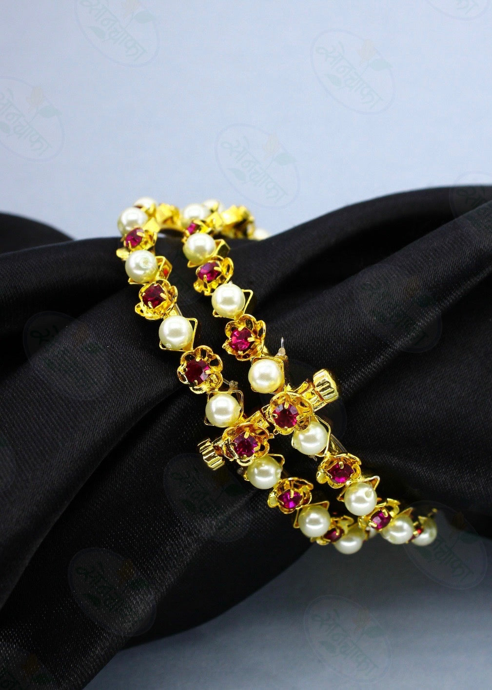 Sonchafa Jewellery offers this all new golden finish with moti and pink colour stone studded moti bangles for women online. These bangles will surely give you attractive look.