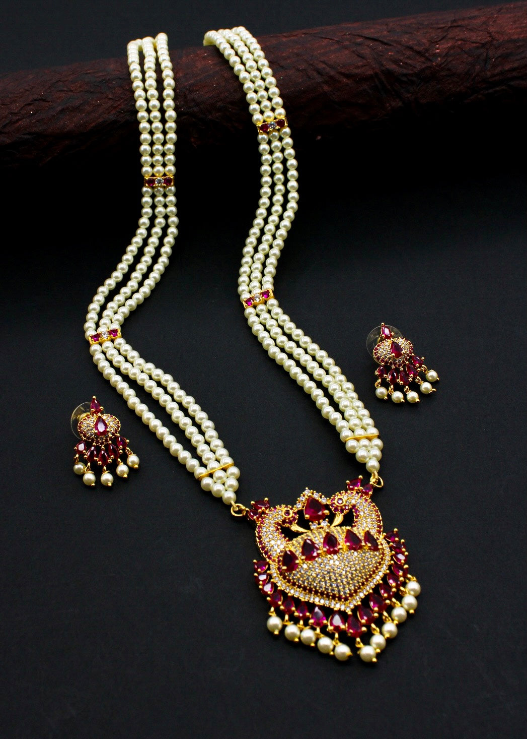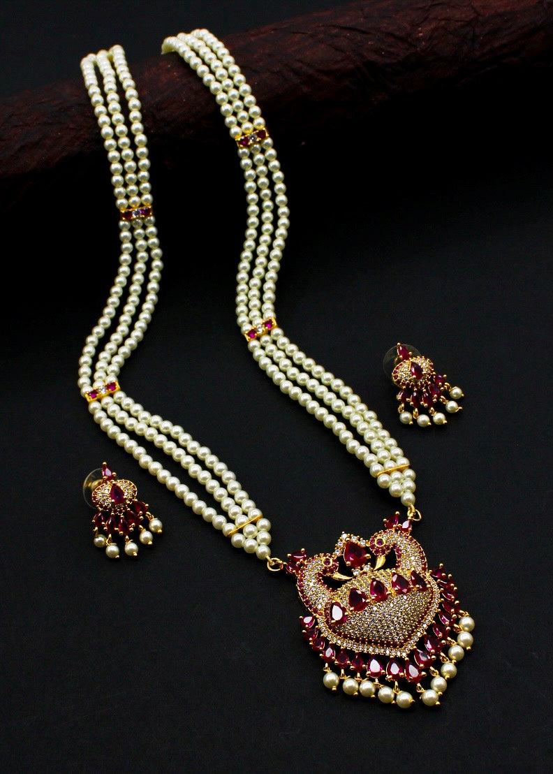 Complete your festive look by clubbing this appealing designer moti necklace set with your occasional costume. It is studded with sparkling pink, white stones and made from golden finish metal. It is wonderfully woven with pearl beads. The design of this necklace is unique and worth-noticing. It is superior in quality and long lasting.