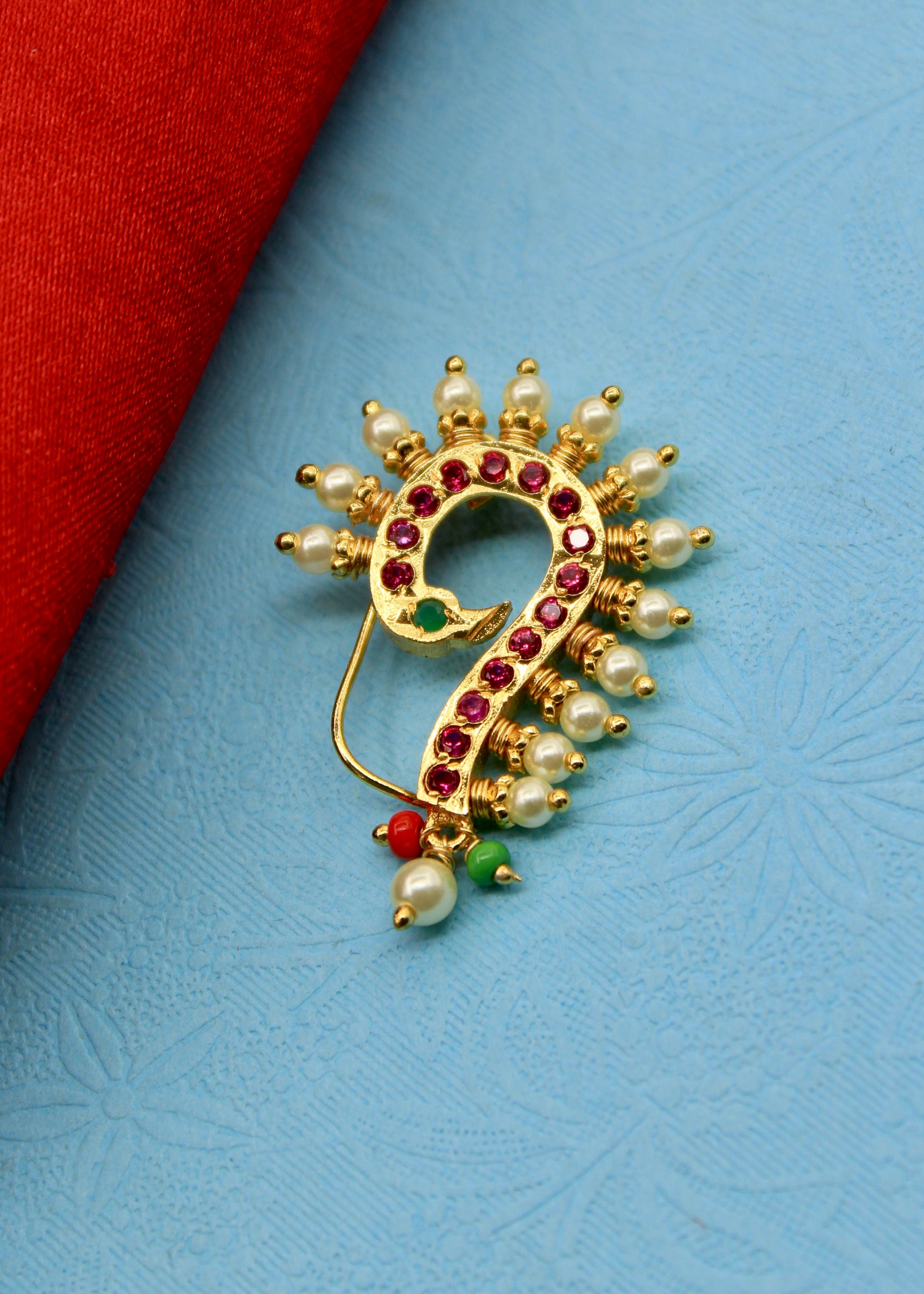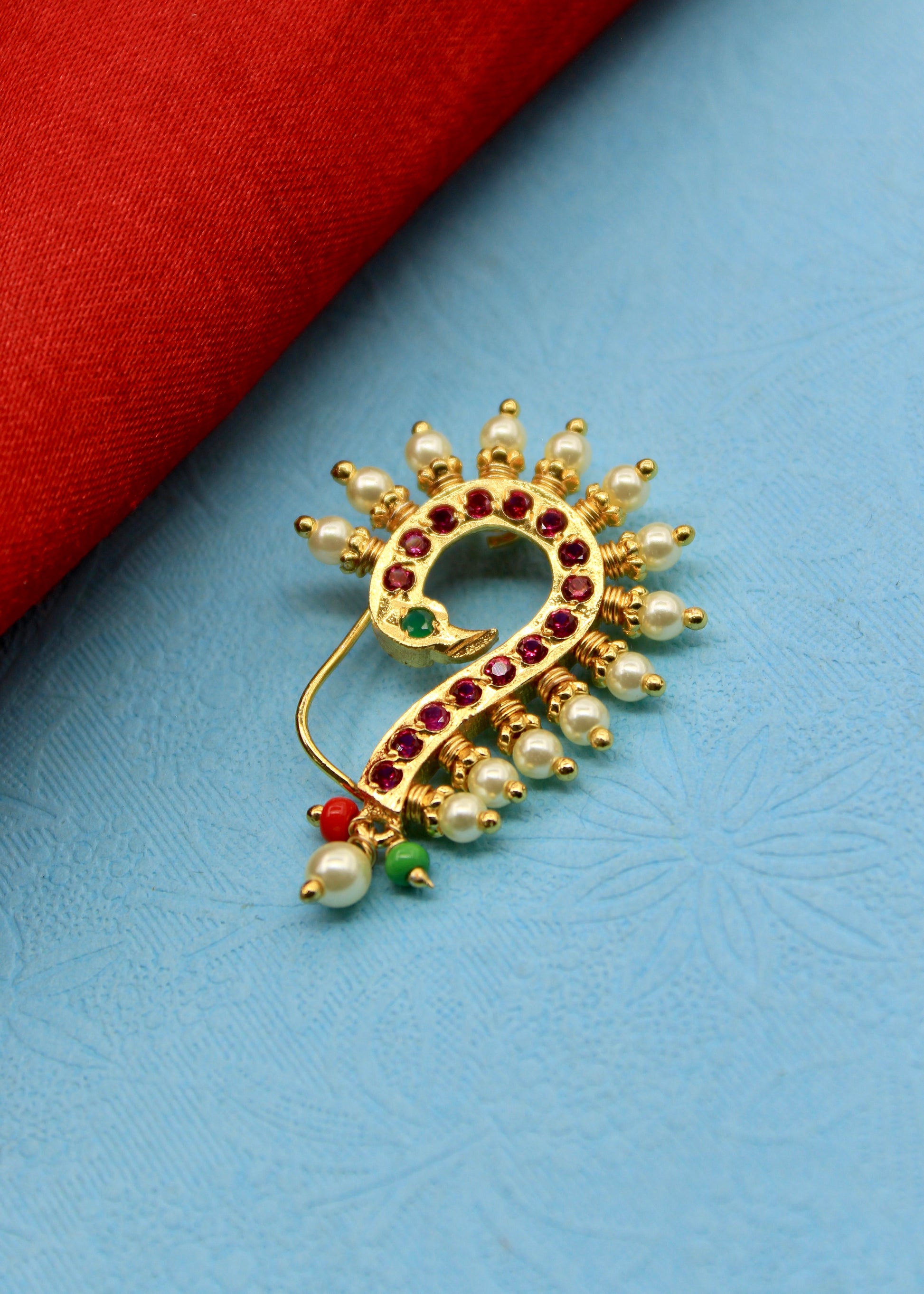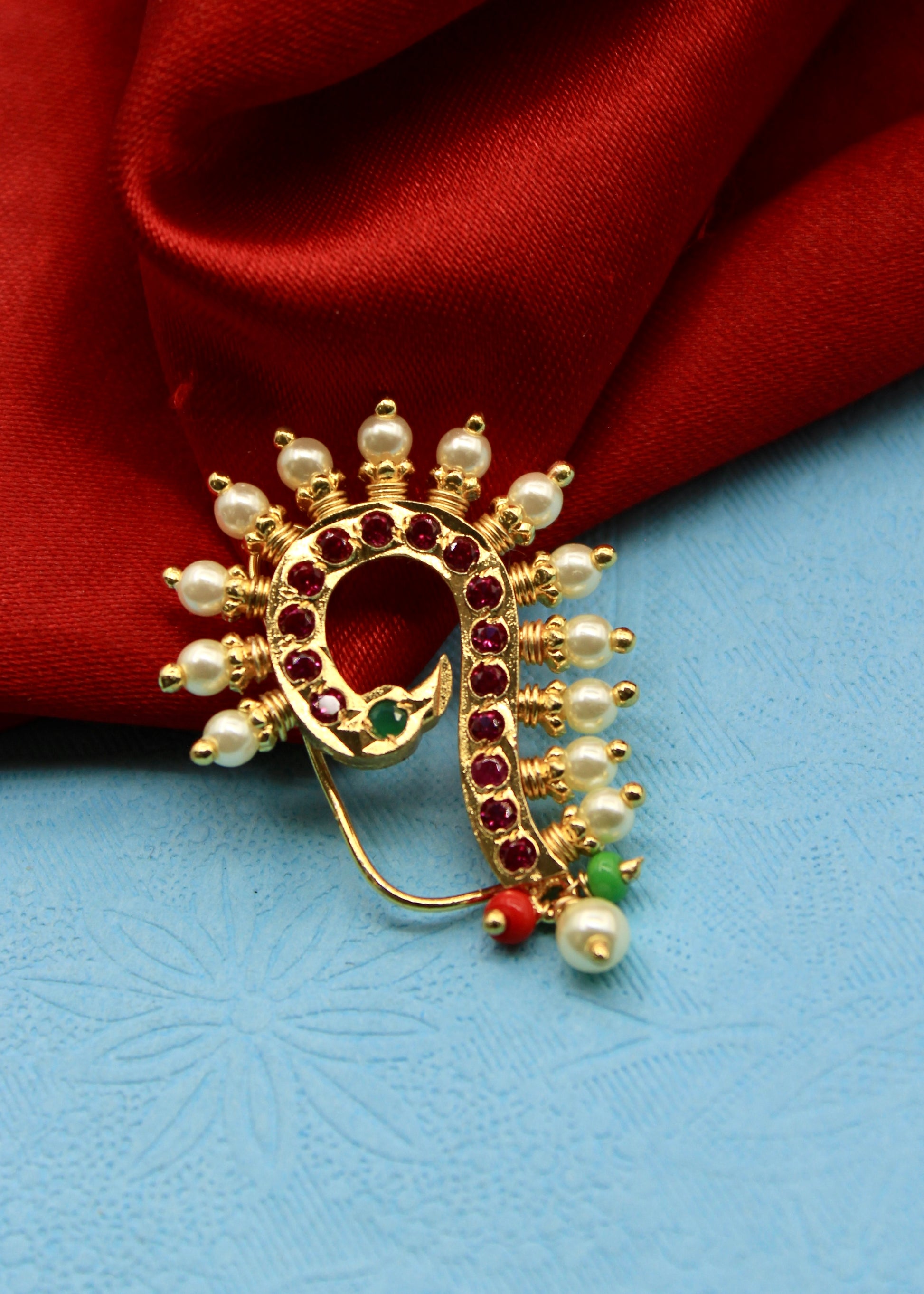 Sonchafa Jewellers introduce you this sterling pearl beads nath for stylish women like you. It is styled with sparkling pink, green stone and made from golden finish metal. This nose pin has dangling pearl beads for look more attractive. It is skin-friendly and ensures high durability.