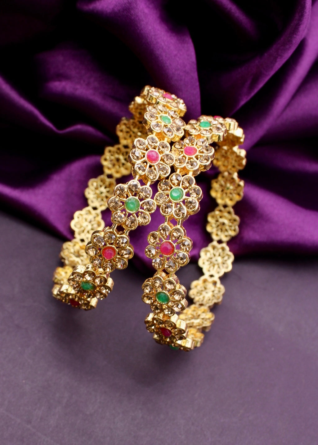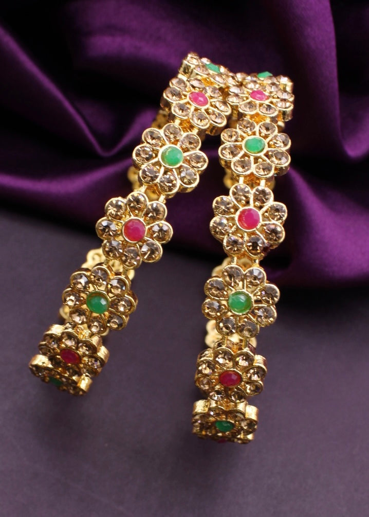 Excellently designed antique bangles from Sonchafa Jewellery will strike you at very first look. These bangles are embedded pink ,green & golden stone and made from antique gold finish metal. These bangles shows attractive design on metal surface. These are long lasting and highly durable.