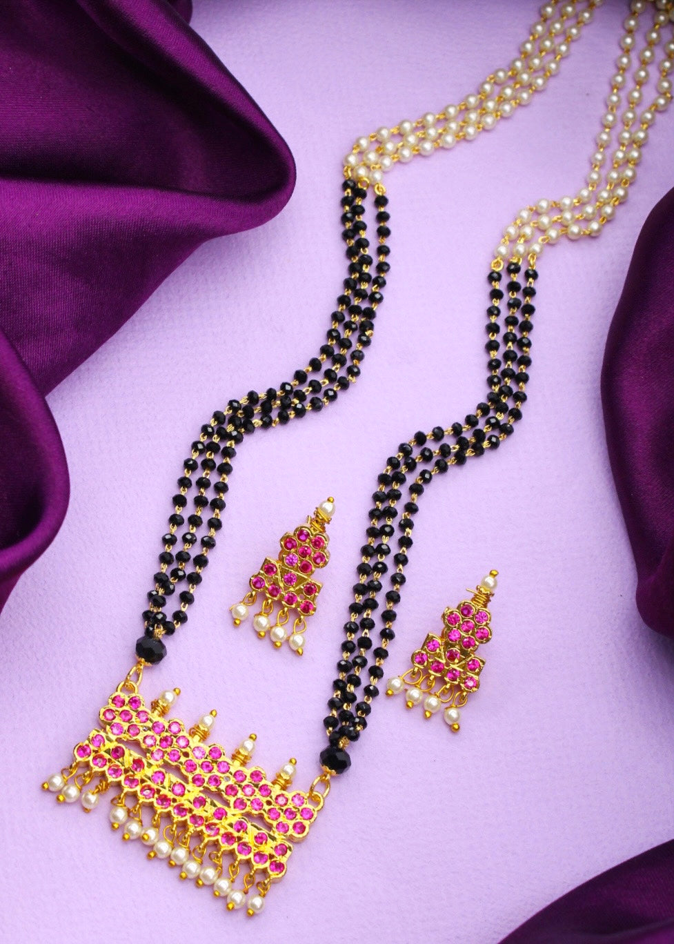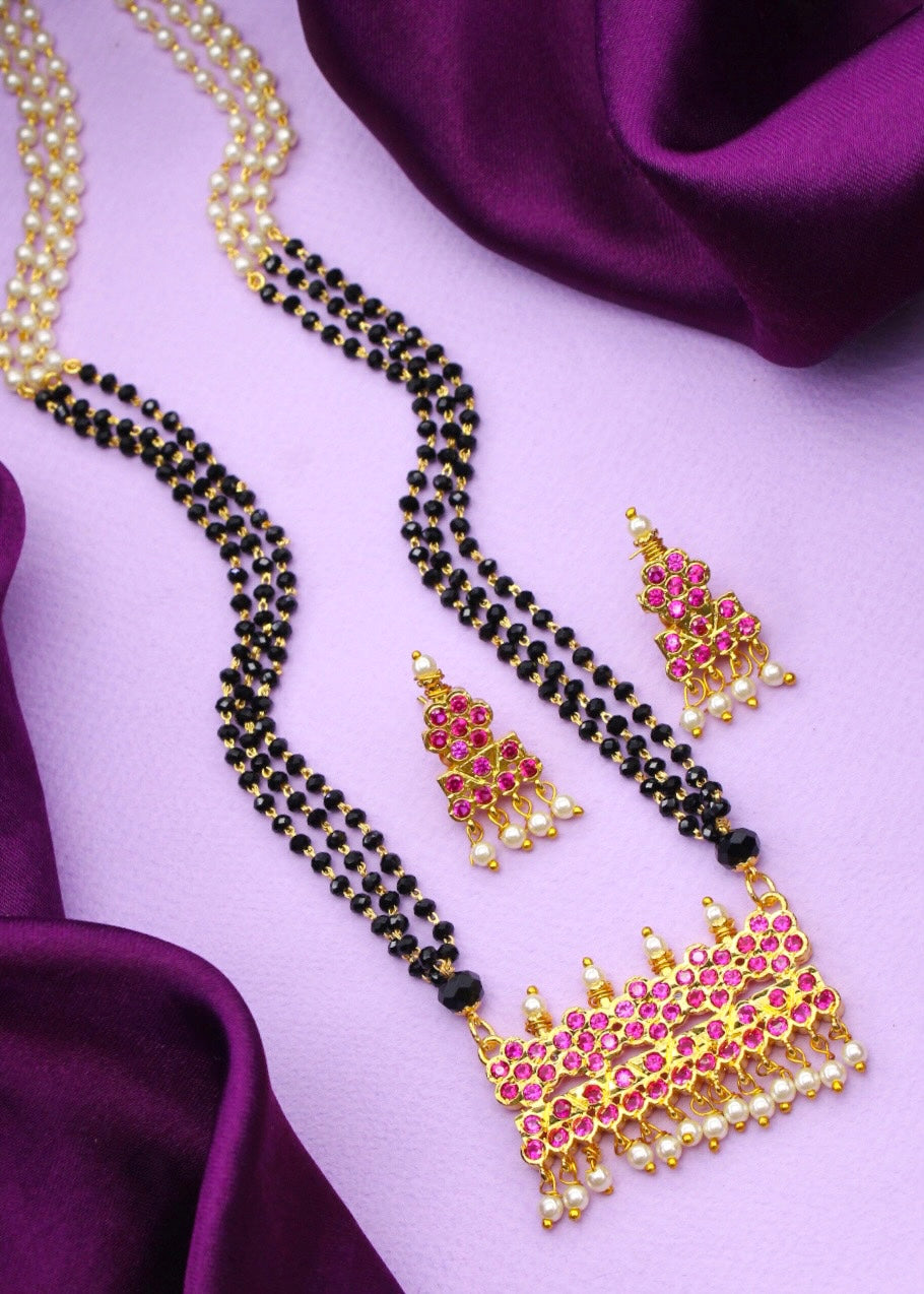 Sonchafa Jewellery brings to you this floral designer mangalsutra for your classy look. It is wonderfully crafted with golden finish metal and studded with pink, white stone. This adorable mangalsutra has wonderful dangling pearl beads for more stylish look. It is woven with pearl, crystal black beads. It is long lasting and highly durable.
