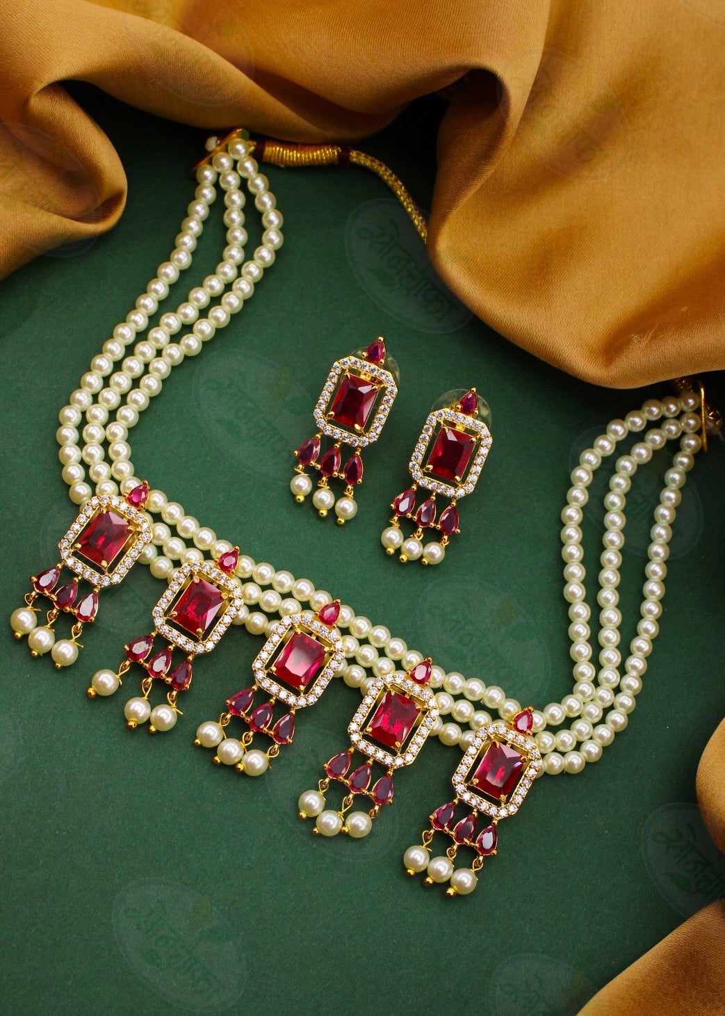 Appealing moti choker necklace set from Sonchafa Jewellery for complete your traditional look. It is studded with pink stone and made from golden finish metal. This necklace is decorated with attractive pearl beads. It is superior in quality and will retain its shine for years to come.