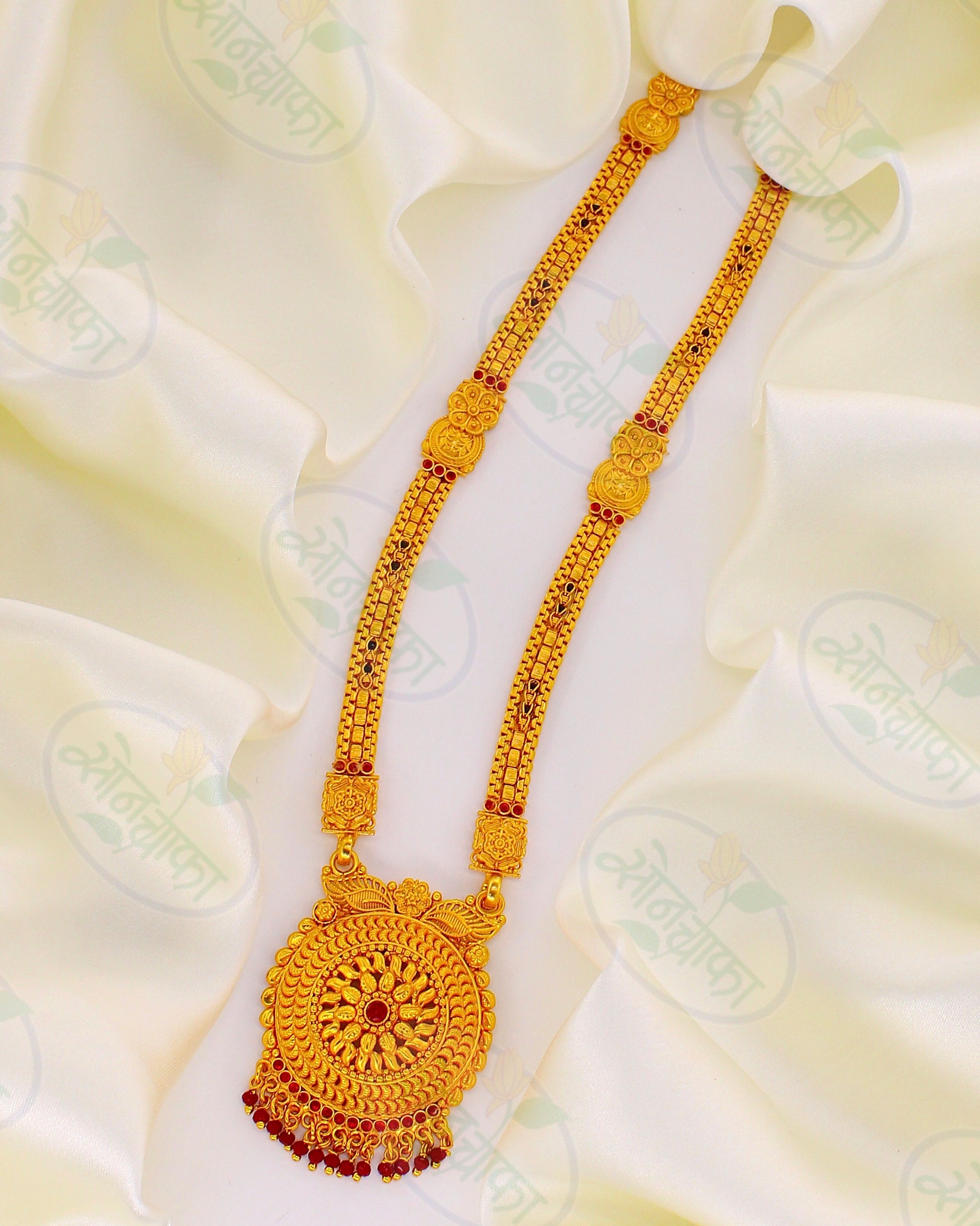 Mangalsutra defines the marital status of women and it is must have ornament for married women. The pendant has flawless floral design work on metal surface & studded with pink stone. In addition it is attached to black, golden beaded chain and ensures high durability. This mangalsutra is good in quality and skin-friendly as well.