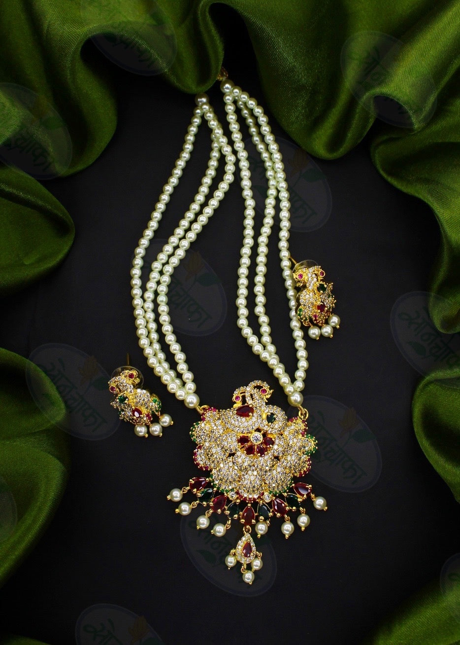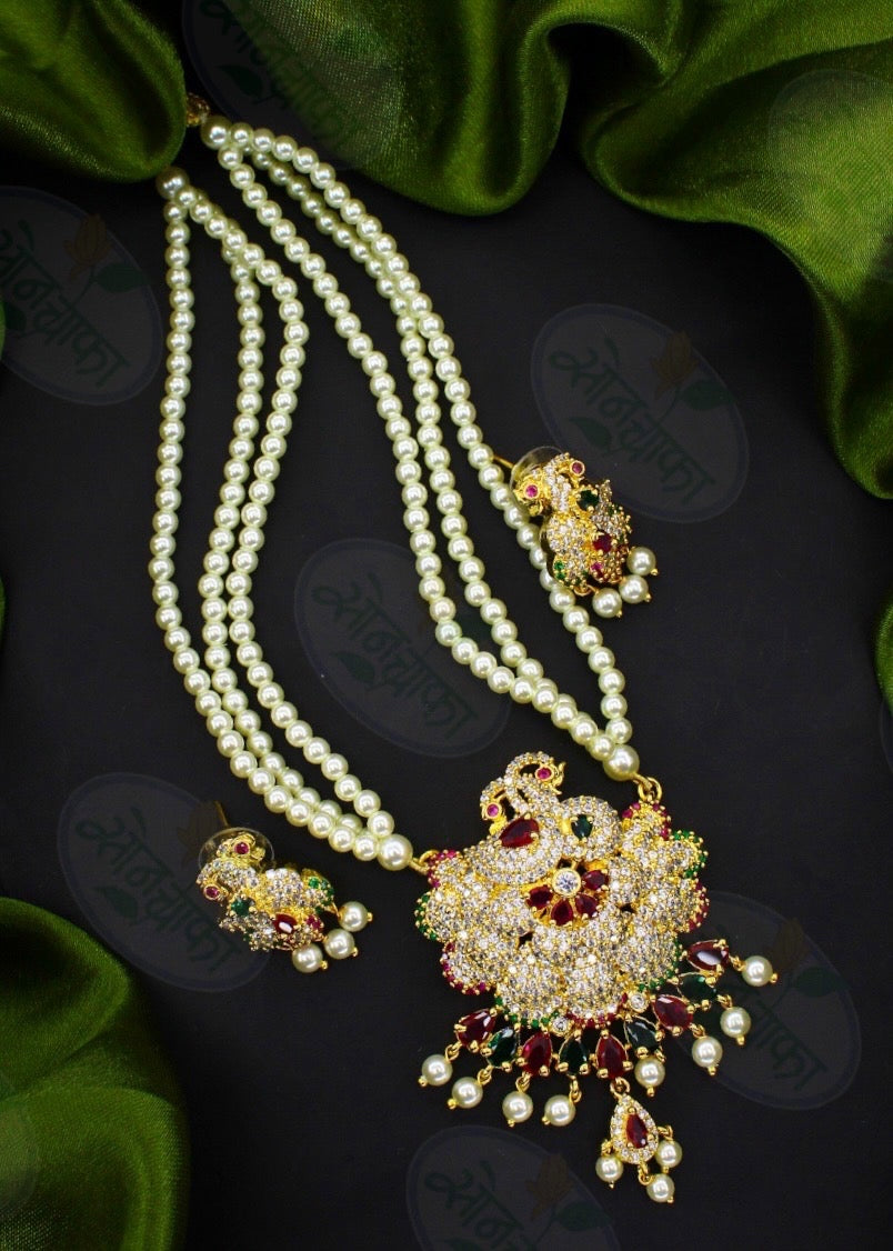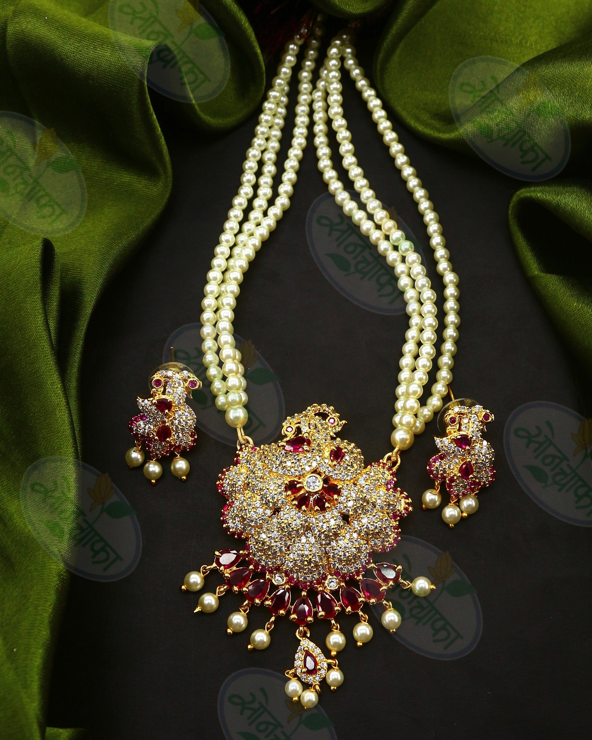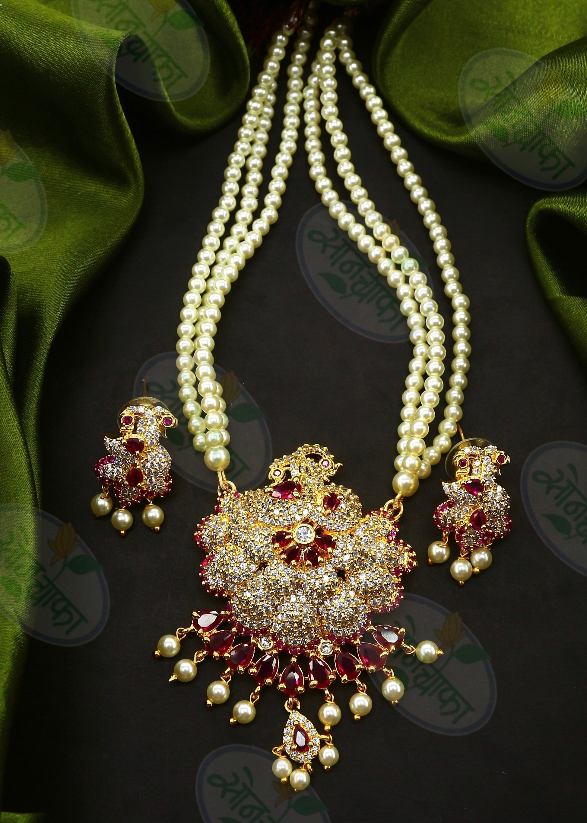 Peacock Style pearl necklace with pink-white color stones studded with pearl beads classy earrings Set For You. By sonchafa Jewellery Made With Superior quality Golden Finish Metal. royal looking neckpiece For you.