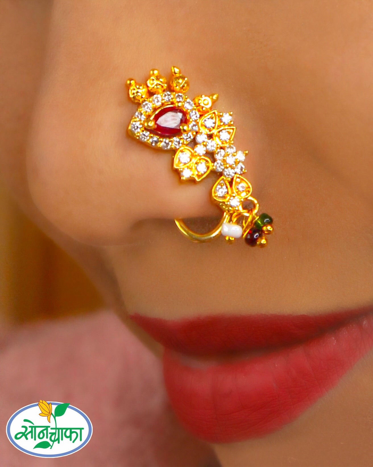 To get that perfect Maharashtrian look nath is must to wear, so Sonchafa Jewellery offers this beautiful nath for you. It is studded with sparkling pink stone with golden beads & made with golden finish metal. This metal crafted nose ornament is easy to wear as it is press nath.