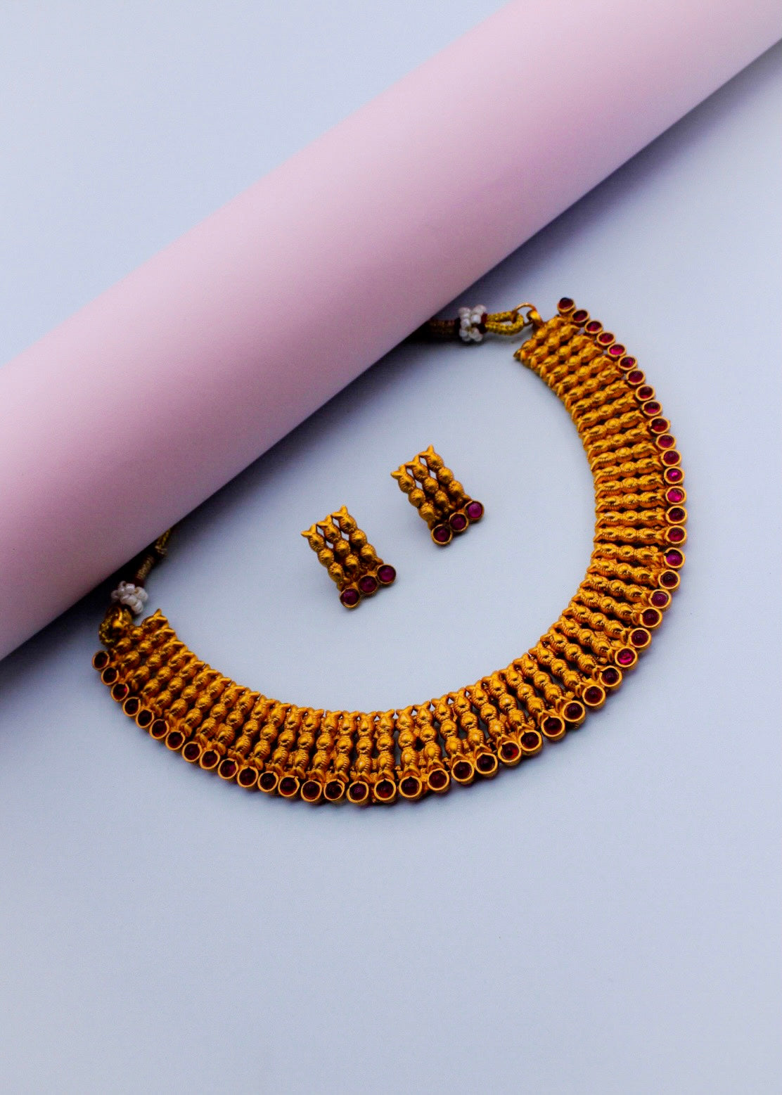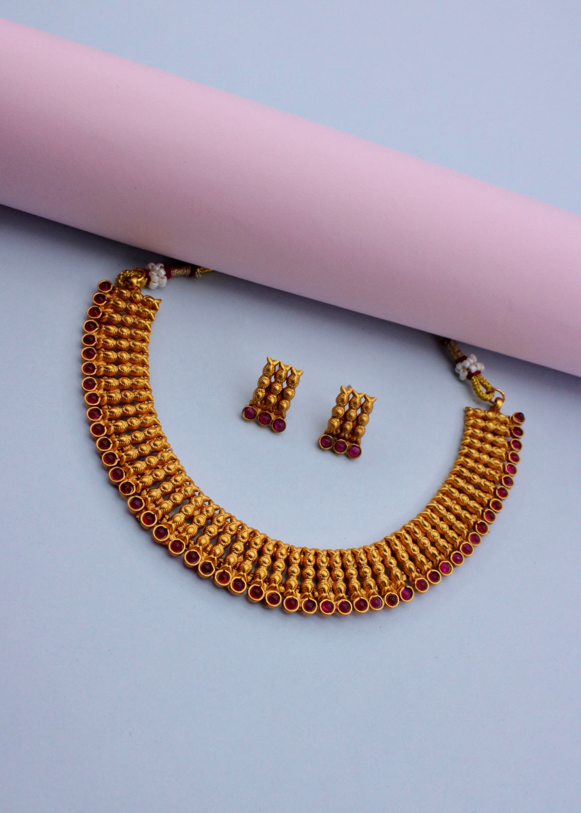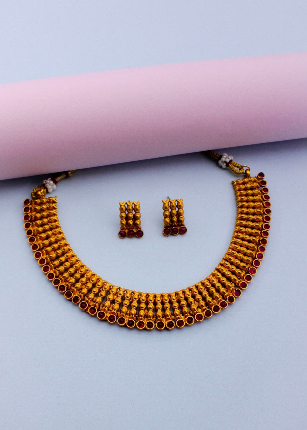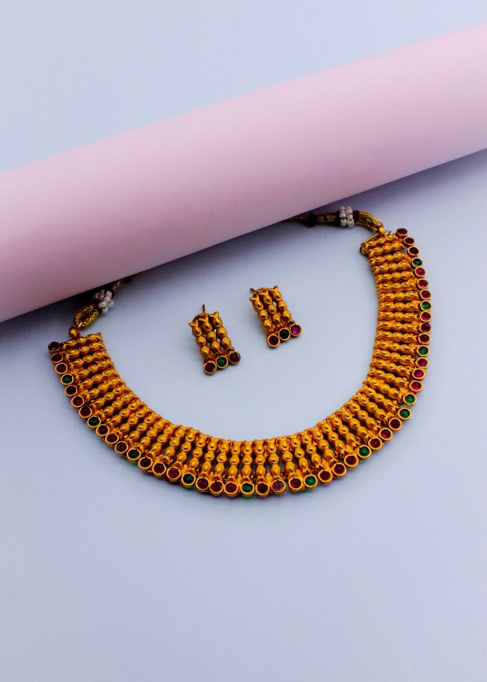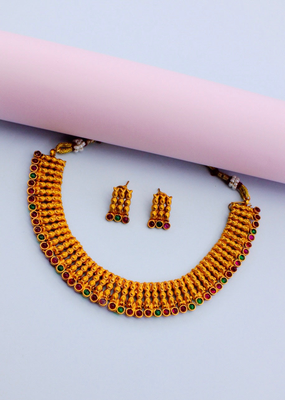 Match up this designer necklace set with your ethnic costume and get that perfect look. It is embedded with pink, green color stone and made from matte gold finish metal. In addition it is decorated with attractive design on metal surface. Grab this necklace and make your different fashion statement.