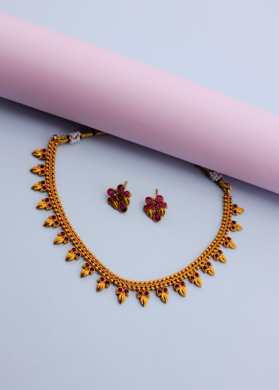 Adorn your neckline with this pretty necklace which is perfect for your classy look. It is embedded with pink stone and made from matte gold finish metal. This necklace is woven with golden beads. It has attractive ear studs for more stylish look. It is long lasting and highly durable.