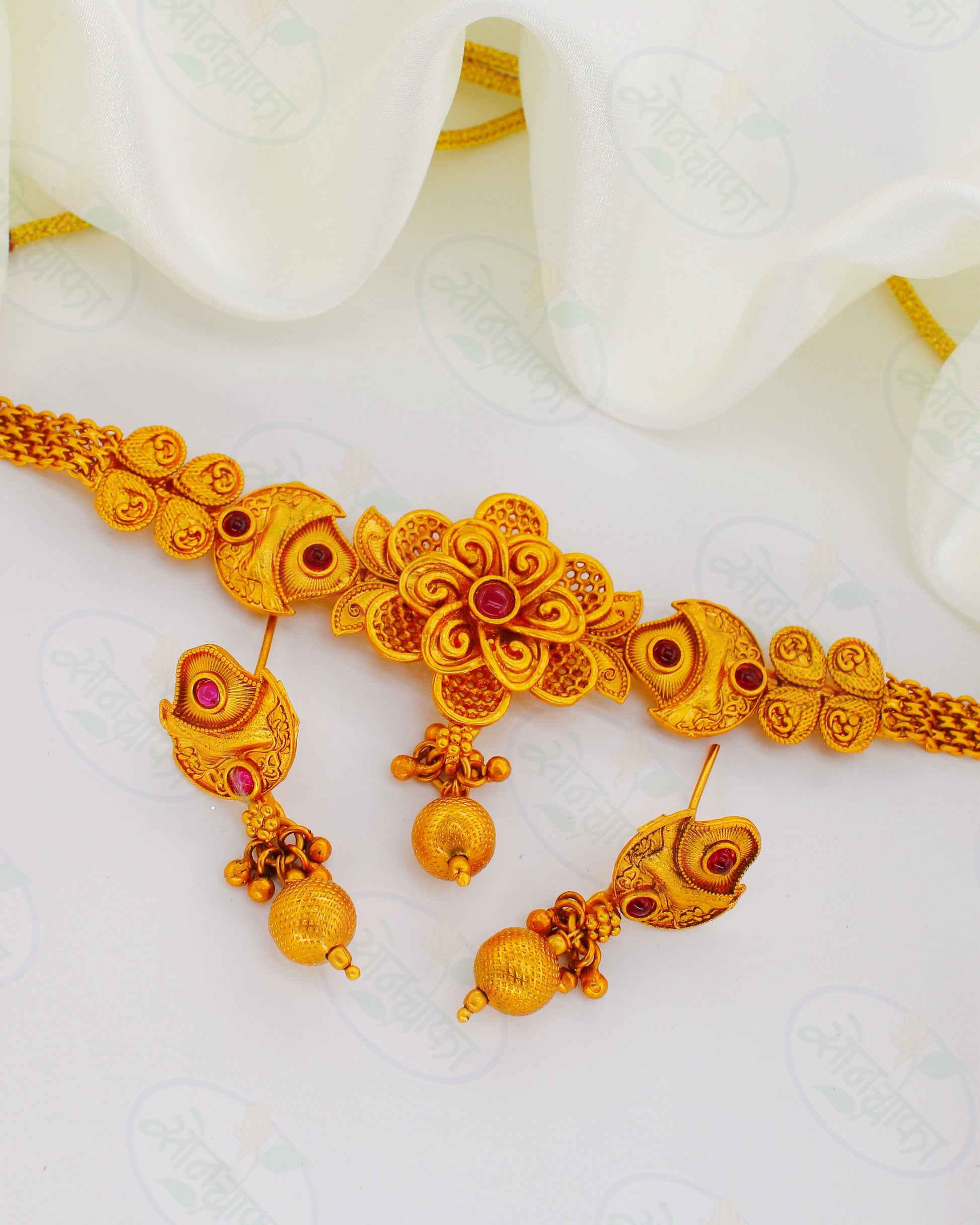 Match up this floral designer choker necklace set with your traditional costume and get that perfect look from Sonchafa Jewellery. It is studded with pink stone and made from matte gold finish metal. In addition it has dangling golden beads for added attraction.