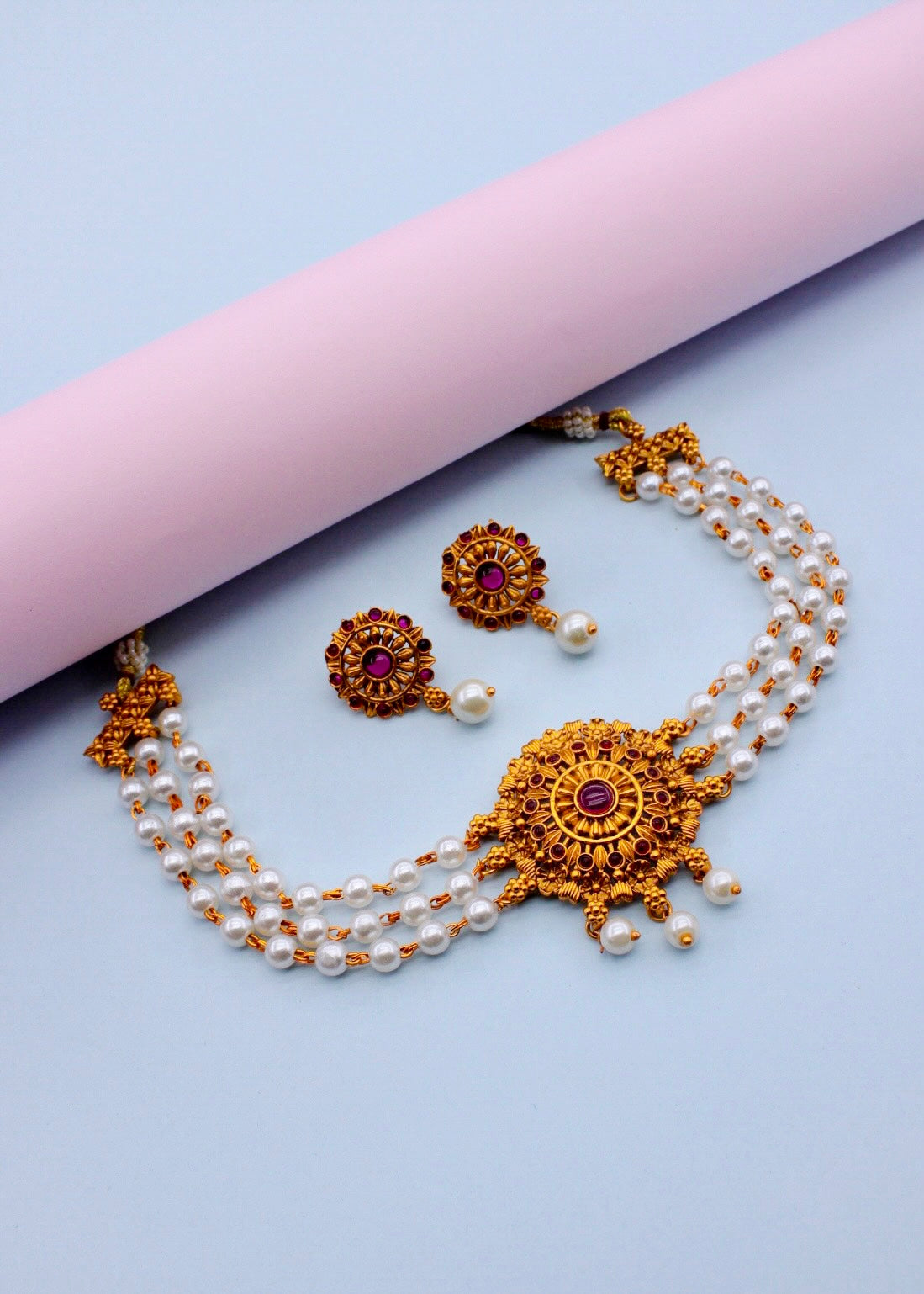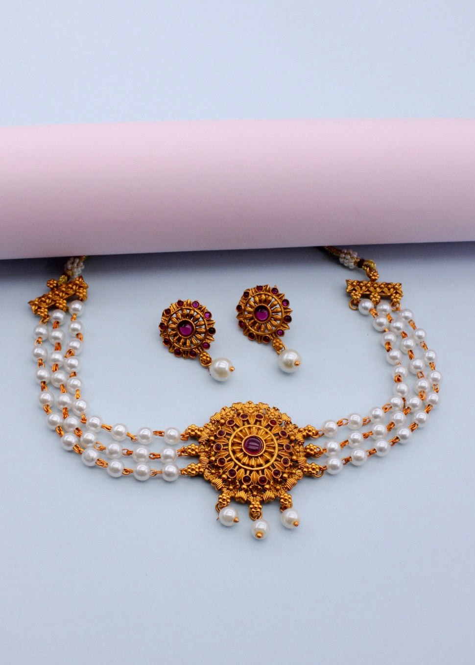 How classy is this choker necklace set from Sonchafa Jewellery. It is embedded with pink stones and crafted from matte gold finish metal. It is wonderfully woven with pearl beads for more attractive look. This choker set is perfect to pair with your traditional saree. It is long lasting and highly durable.