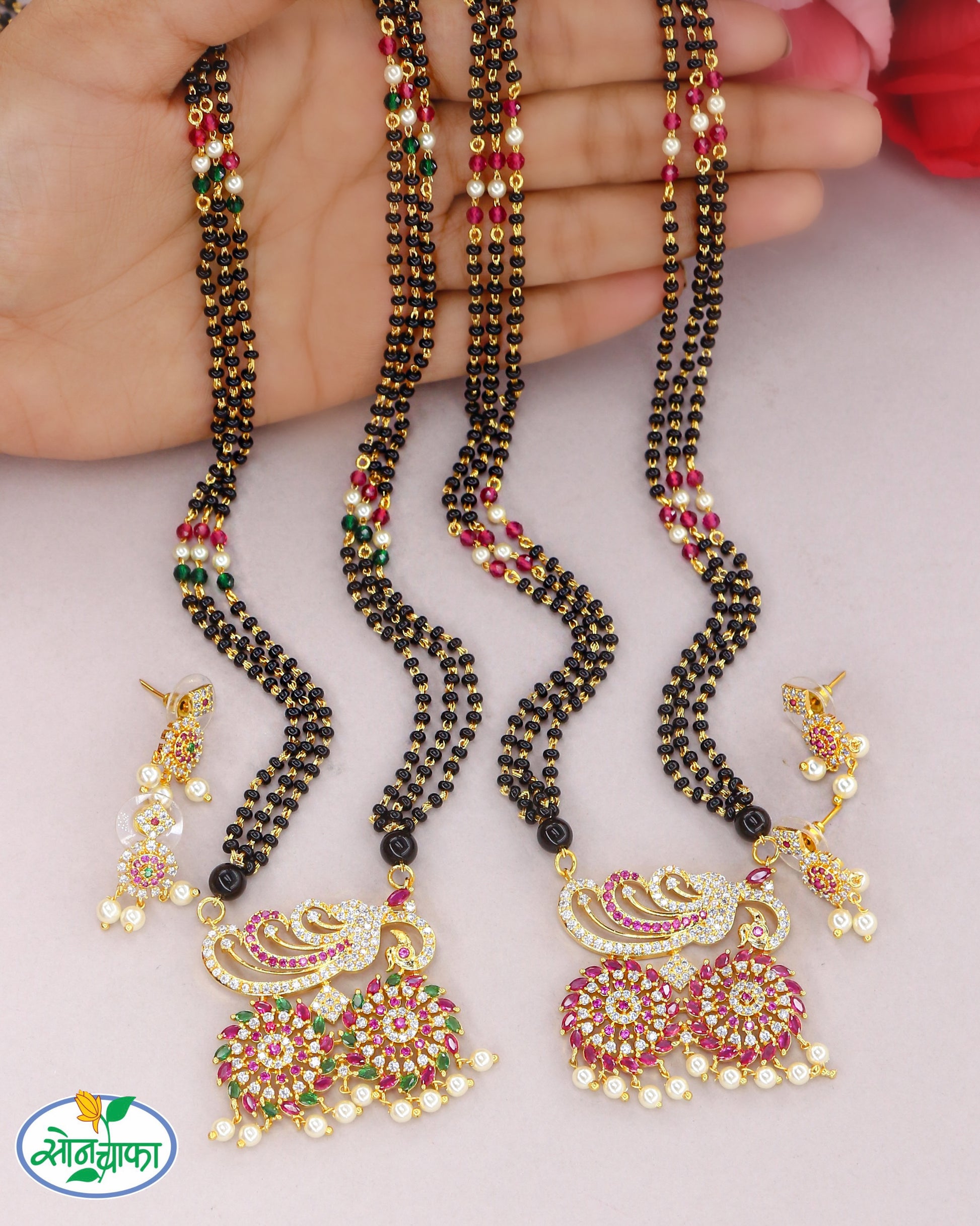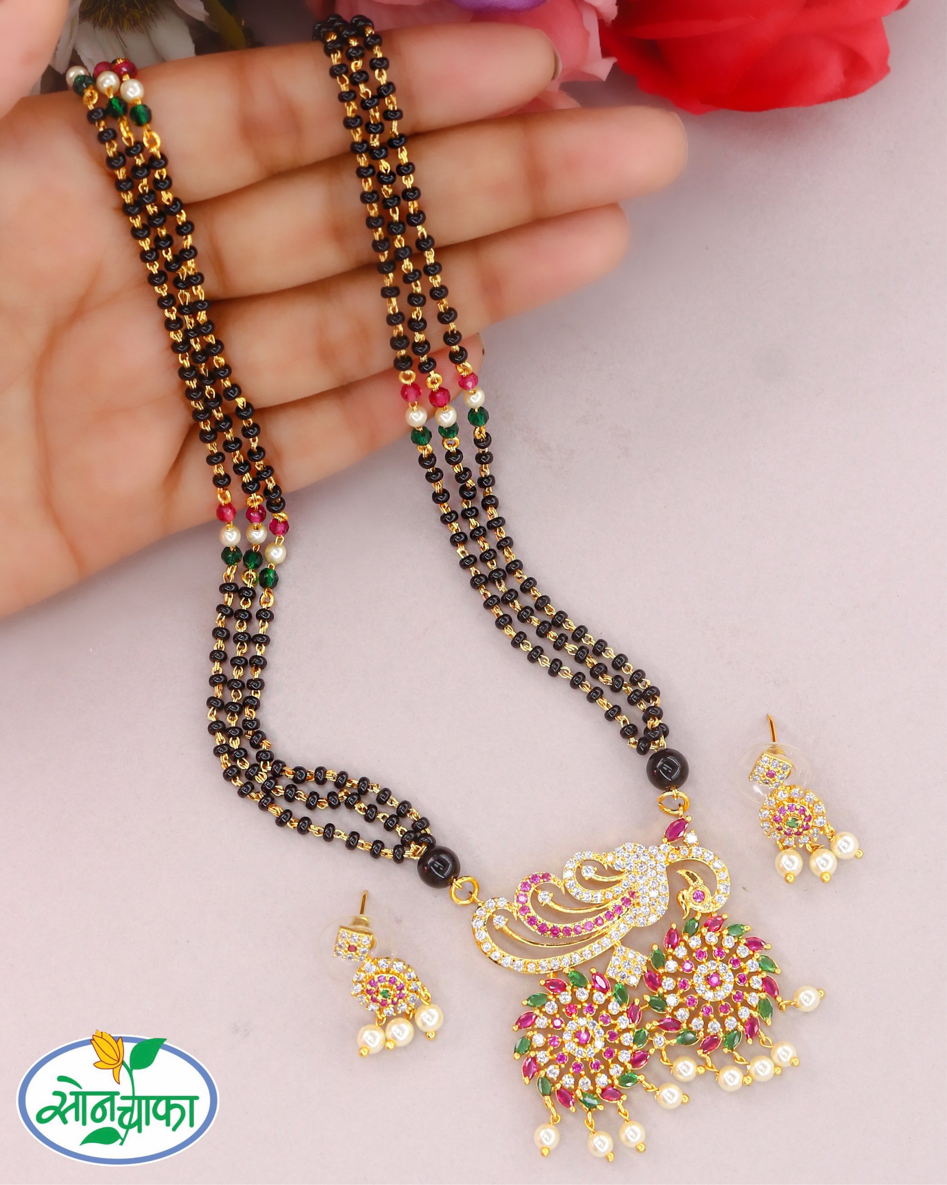 Make a classic addition to your accessory collection by adding this peacock design moti mangalsutra set from Sonchafa Jewellery. It is studded with sparkling pink, white stone and made from golden finish metal along with pearl beads. It is woven with black, pearl beaded two layer chain.