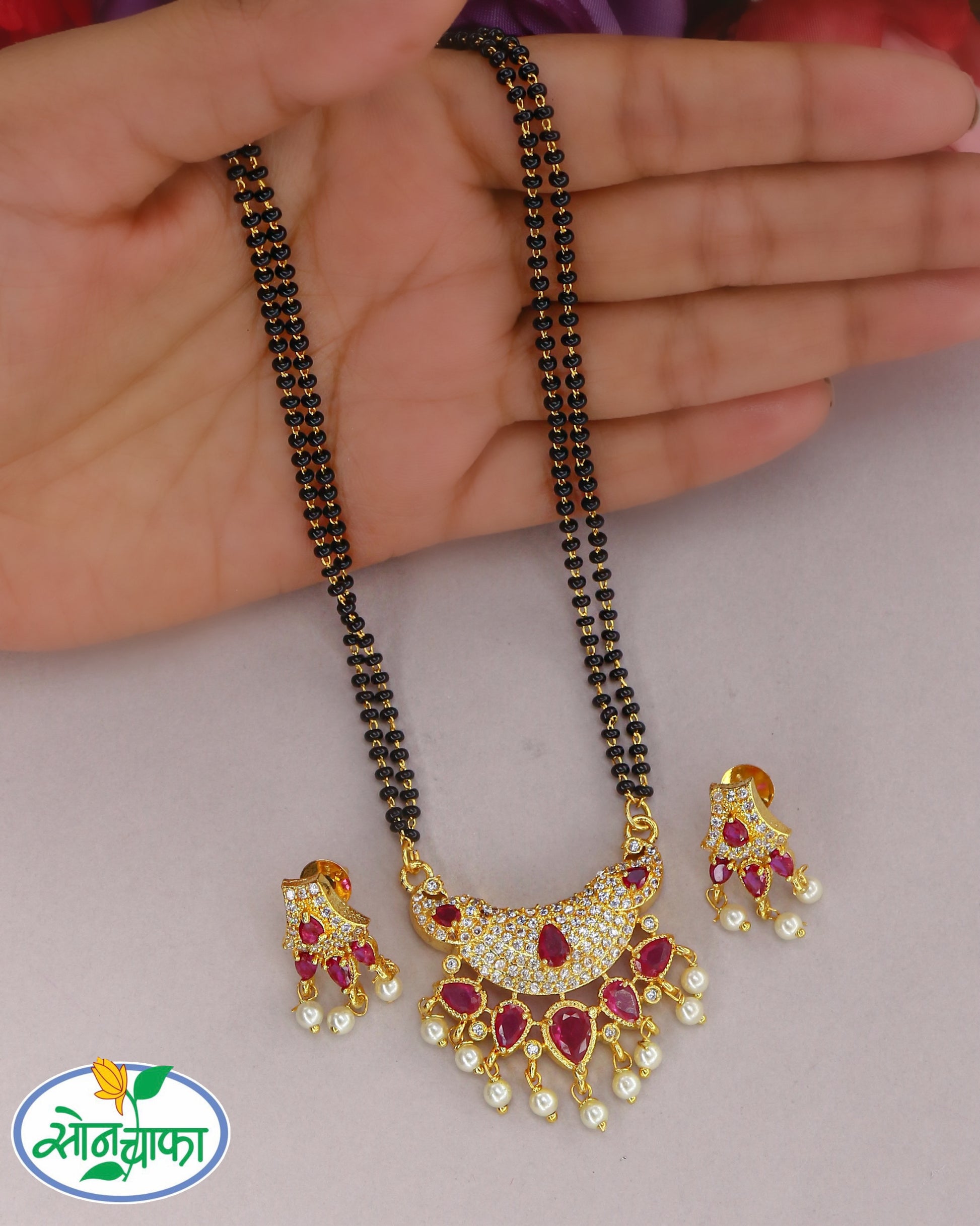 This festive season Sonchafa Jewellery offers range of dazzling Mangalsutra for modern women. It is embedded with pink, white stone along with golden beads and made from golden finished metal. This Mangalsutra comes with four layer of black beaded chain.