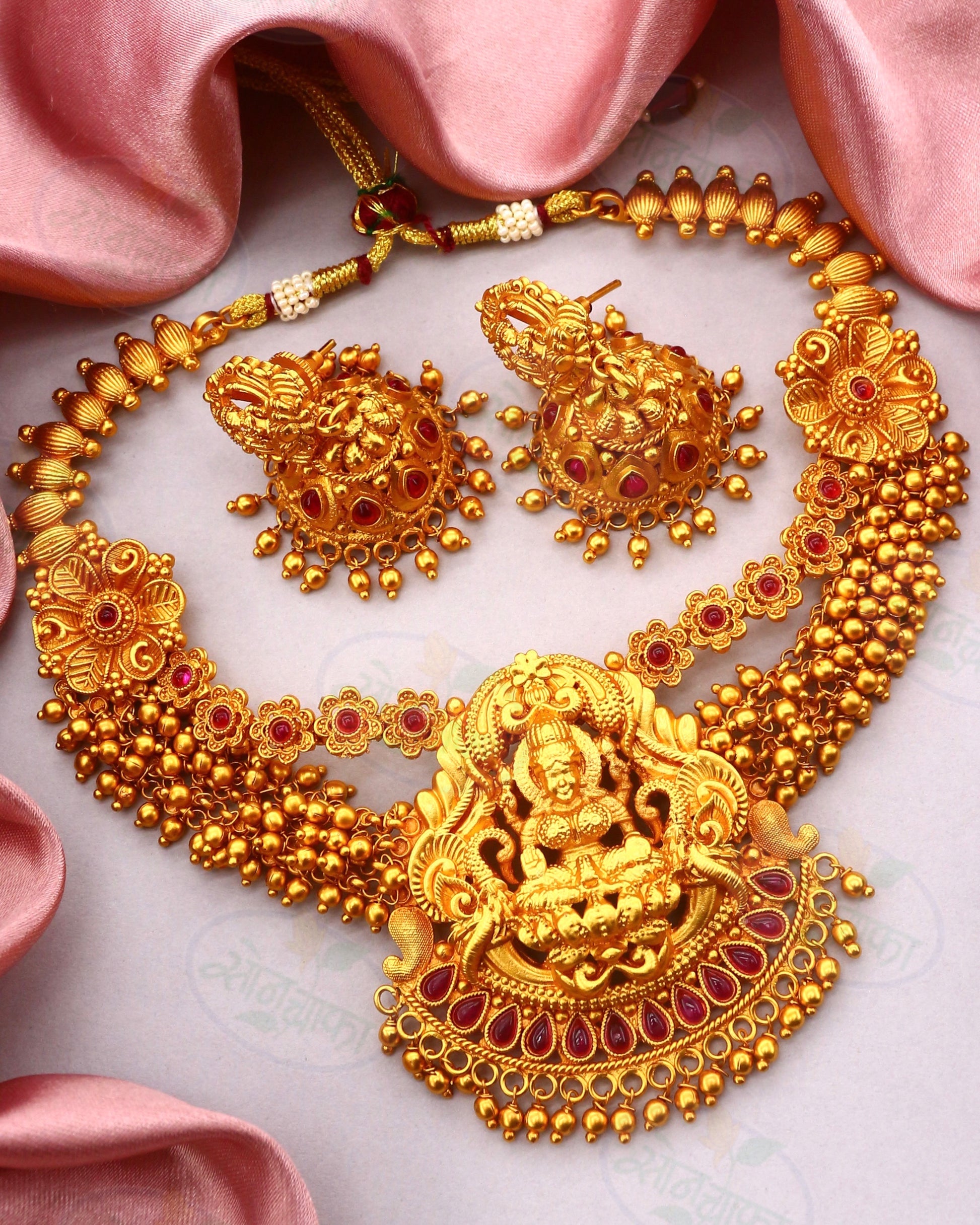 Beautiful matte gold finish sparkling temple necklace with earrings pair. From sonchafa jewellery. Made with superior quality matte gold finish metal. Classy green stones studded necklace with matching earrings set.