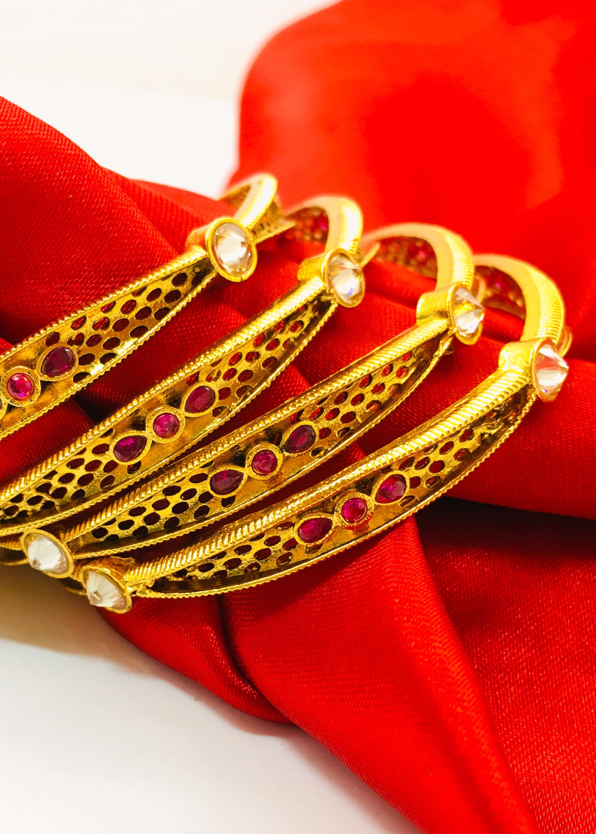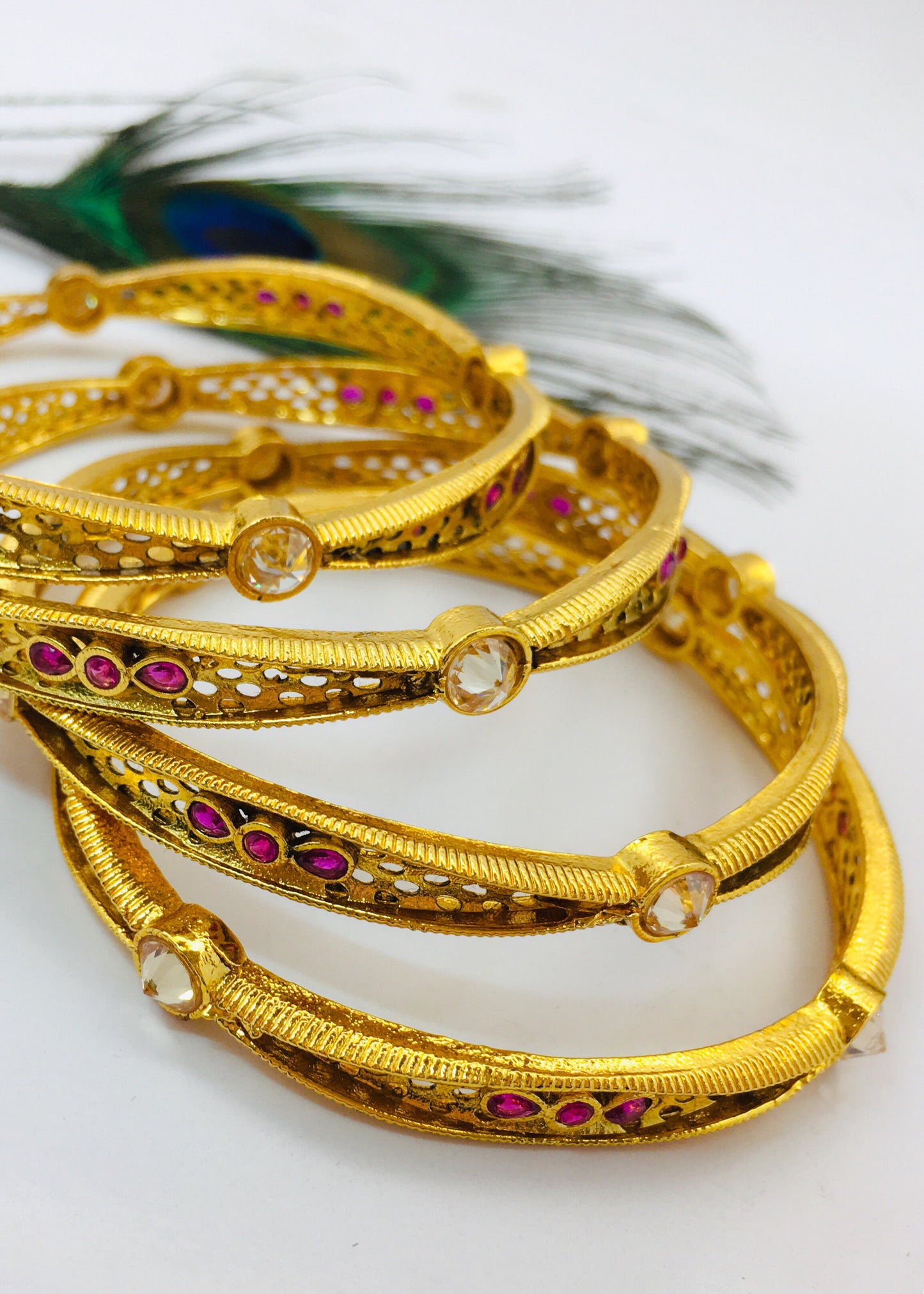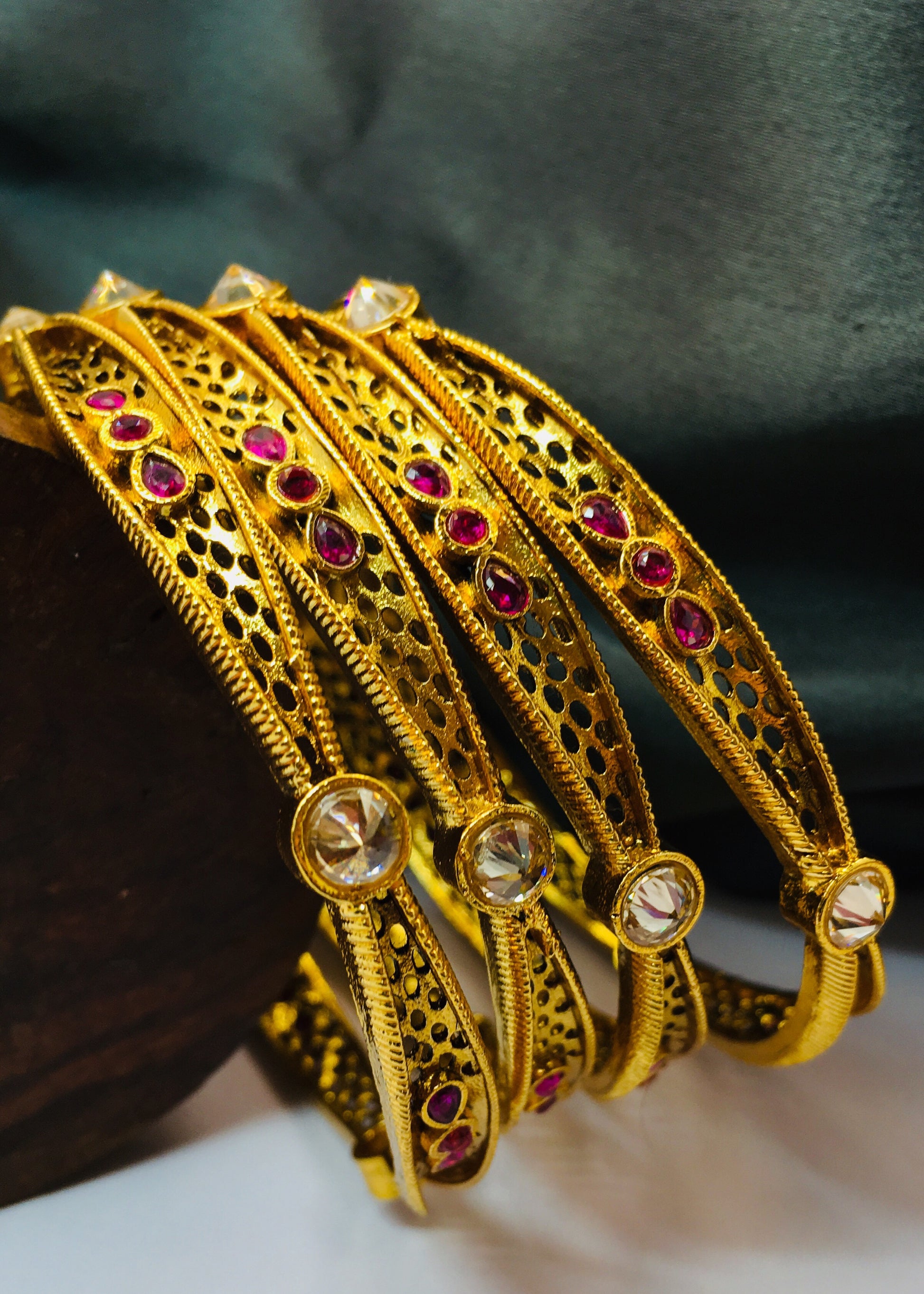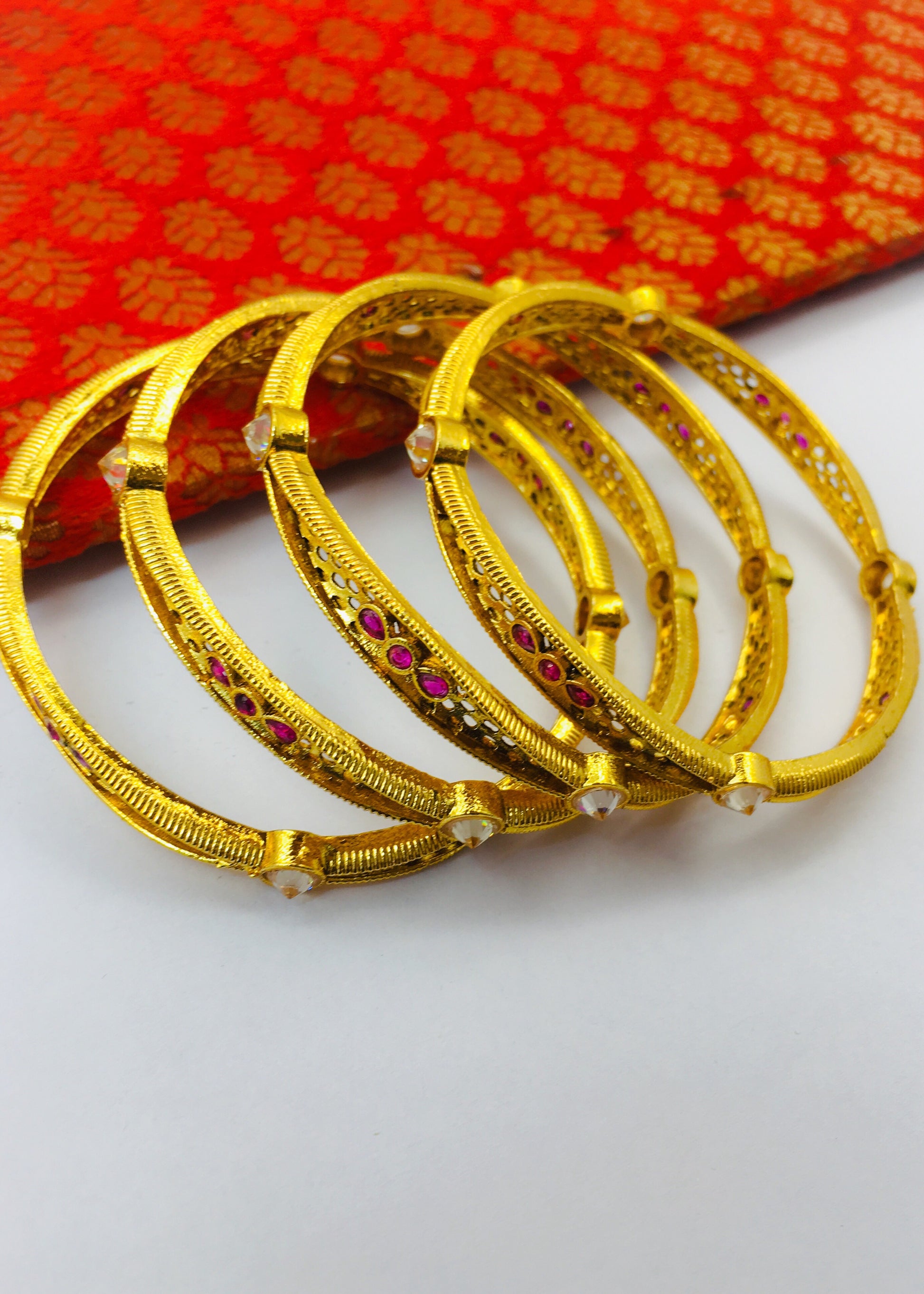 Sonchafa Jewellery offers this new Antique gold finish embedded with Pink-White stone traditional bangles for women. These bangles are made from gold finish metal. It is good in quality and skin-friendly.