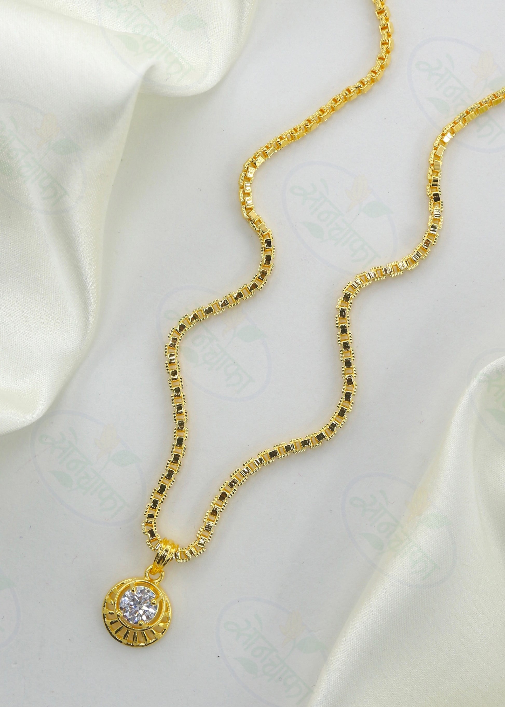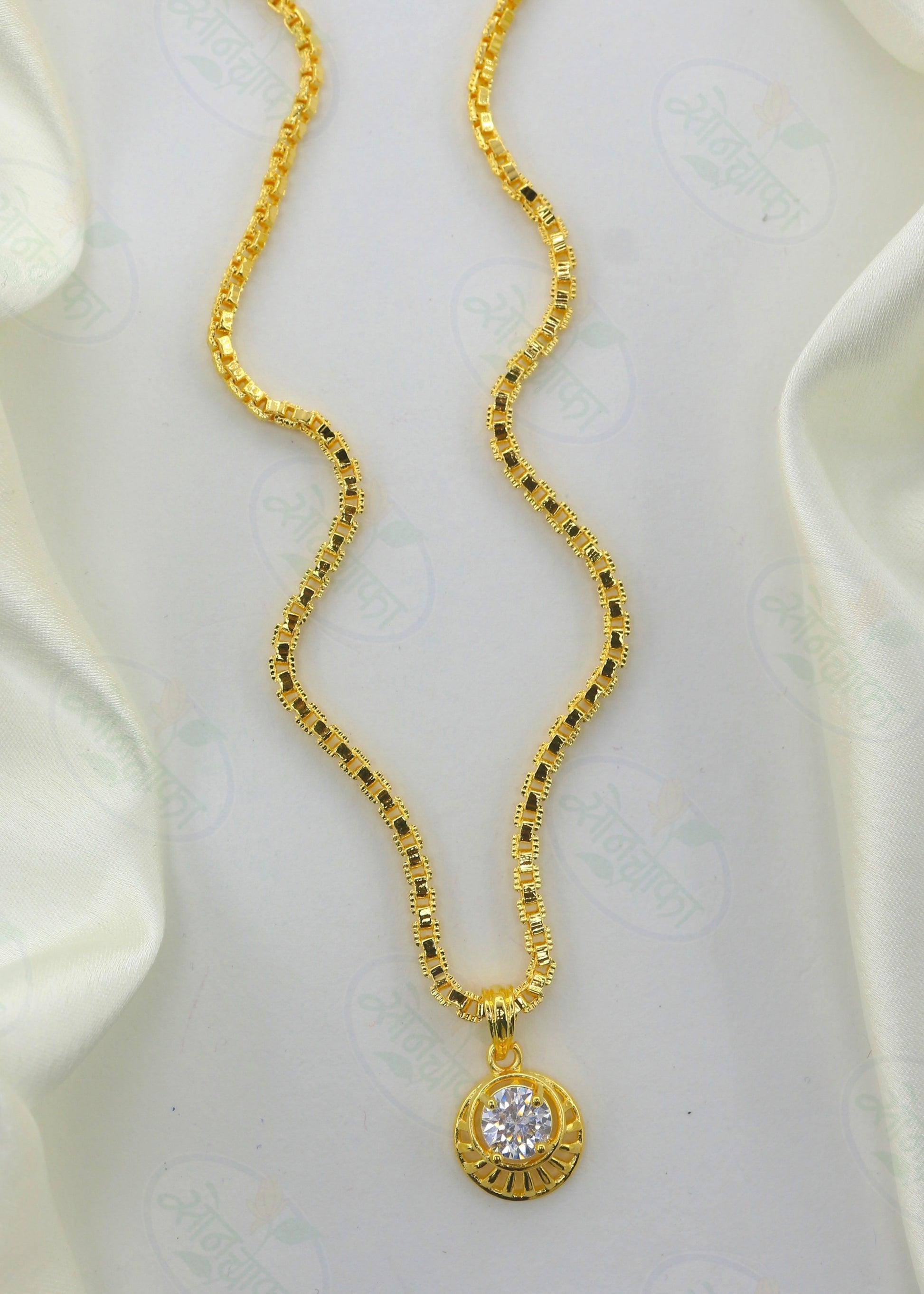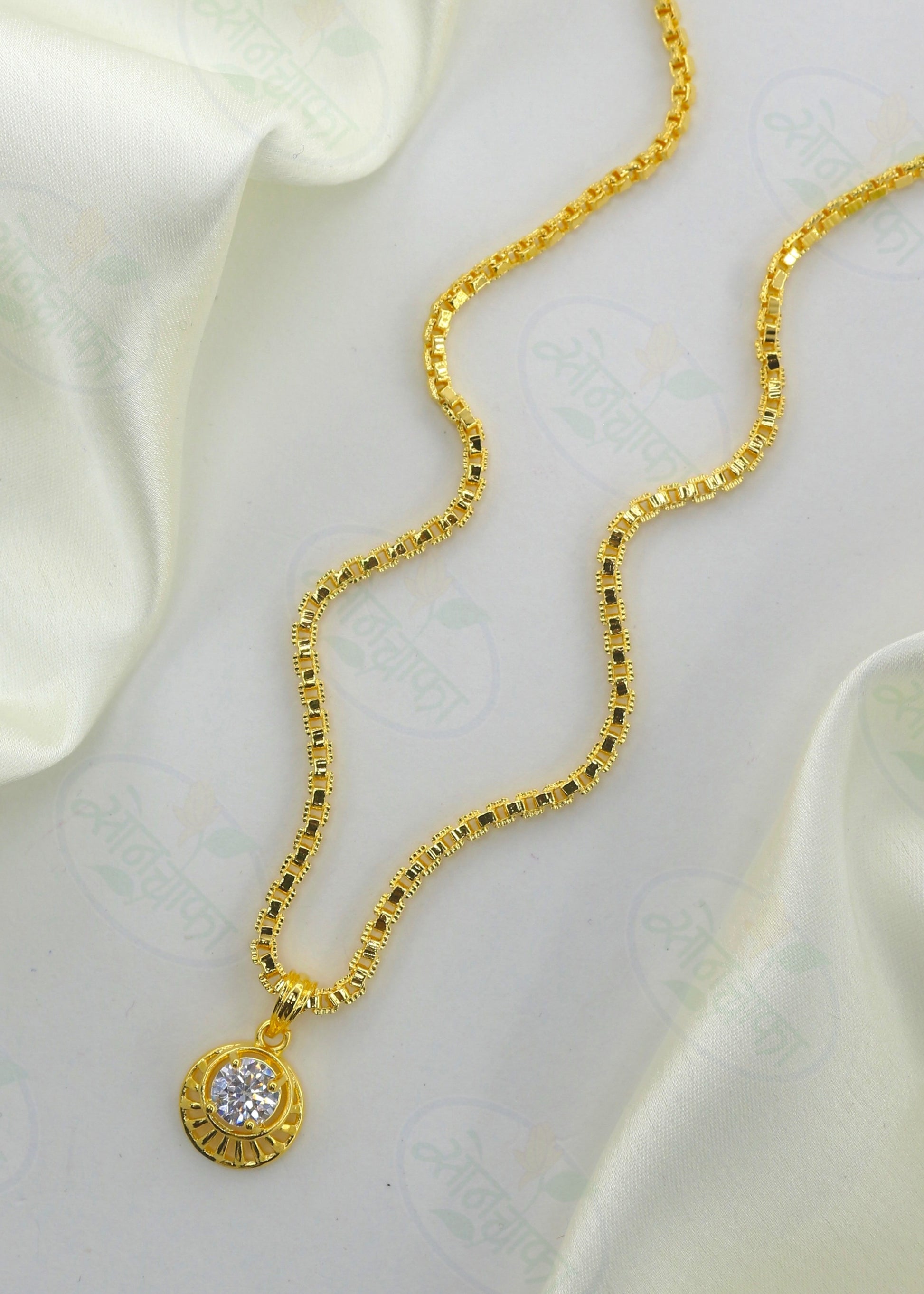 Have a look at this adorable golden chain pendant set from Sonchafa Jewellery. It is crafted from golden finish. This pendant set is encrusted with white stone. It is long lasting and highly durable.