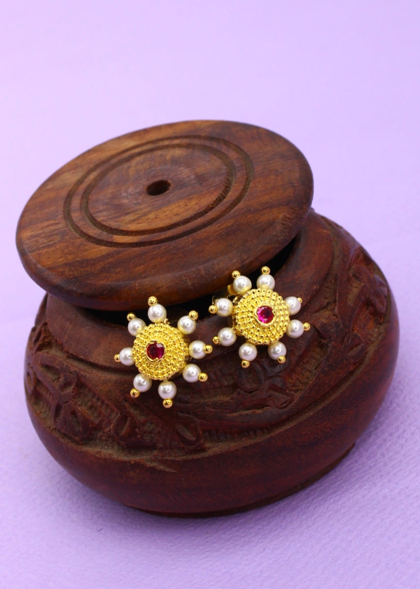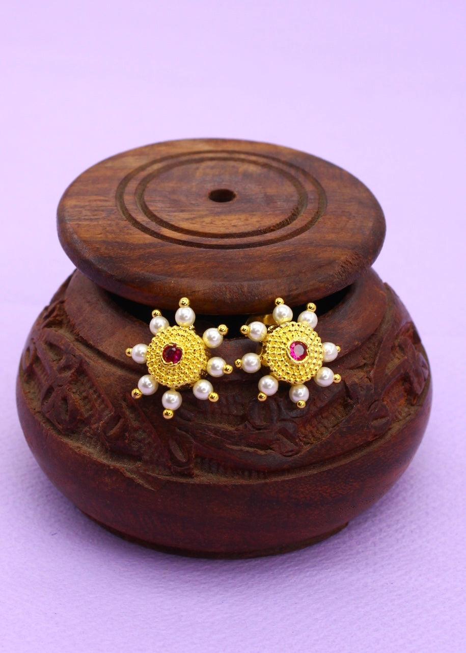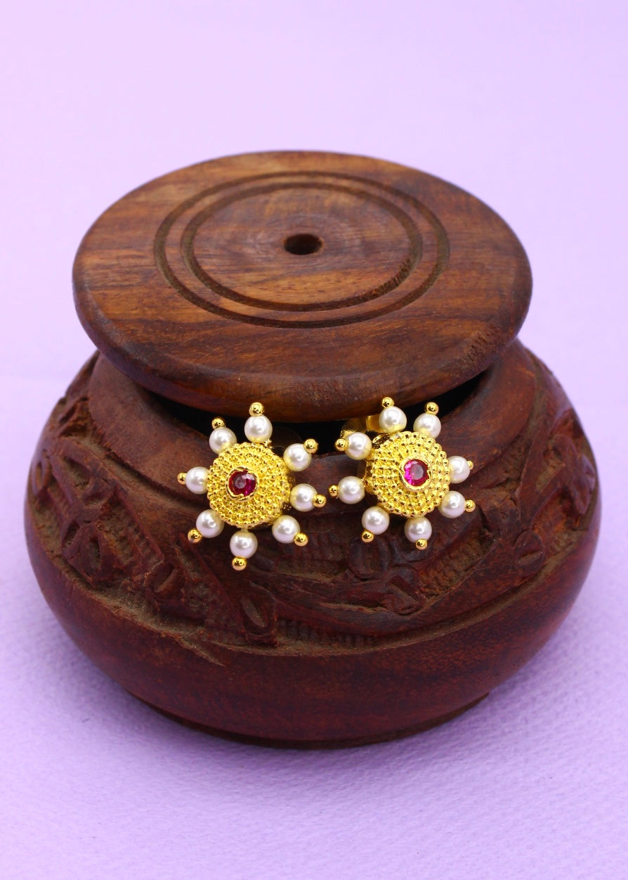 Beautifully designed, this pearl beads earrings from the house of sonchafa Jewellery is perfect to enhance your Maharashtrian appearance. Crafted from golden finish metal.
