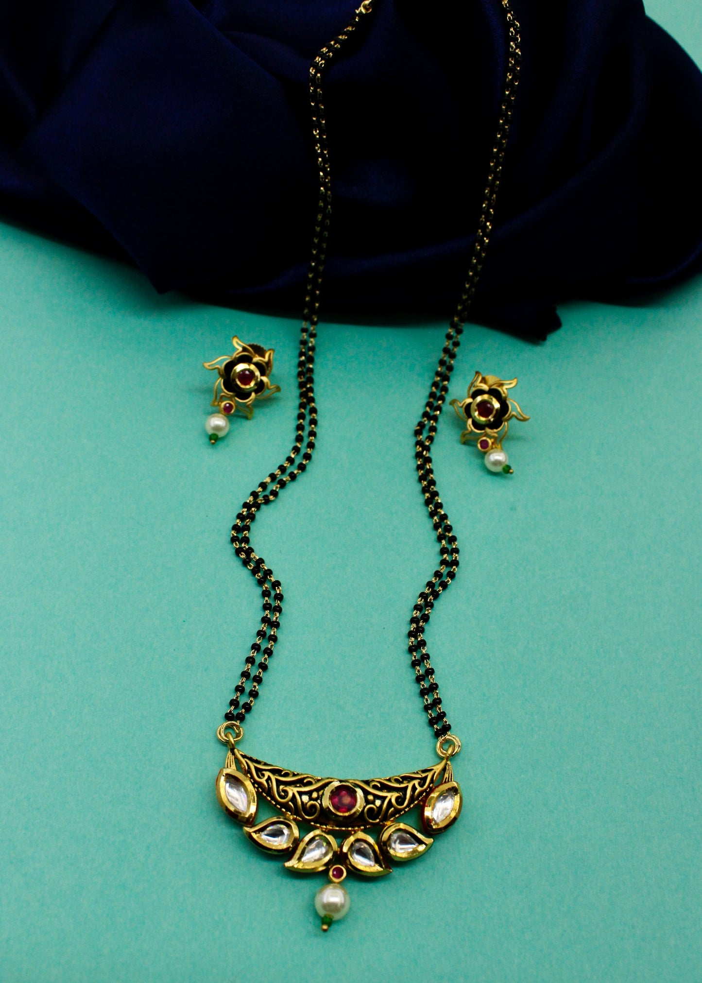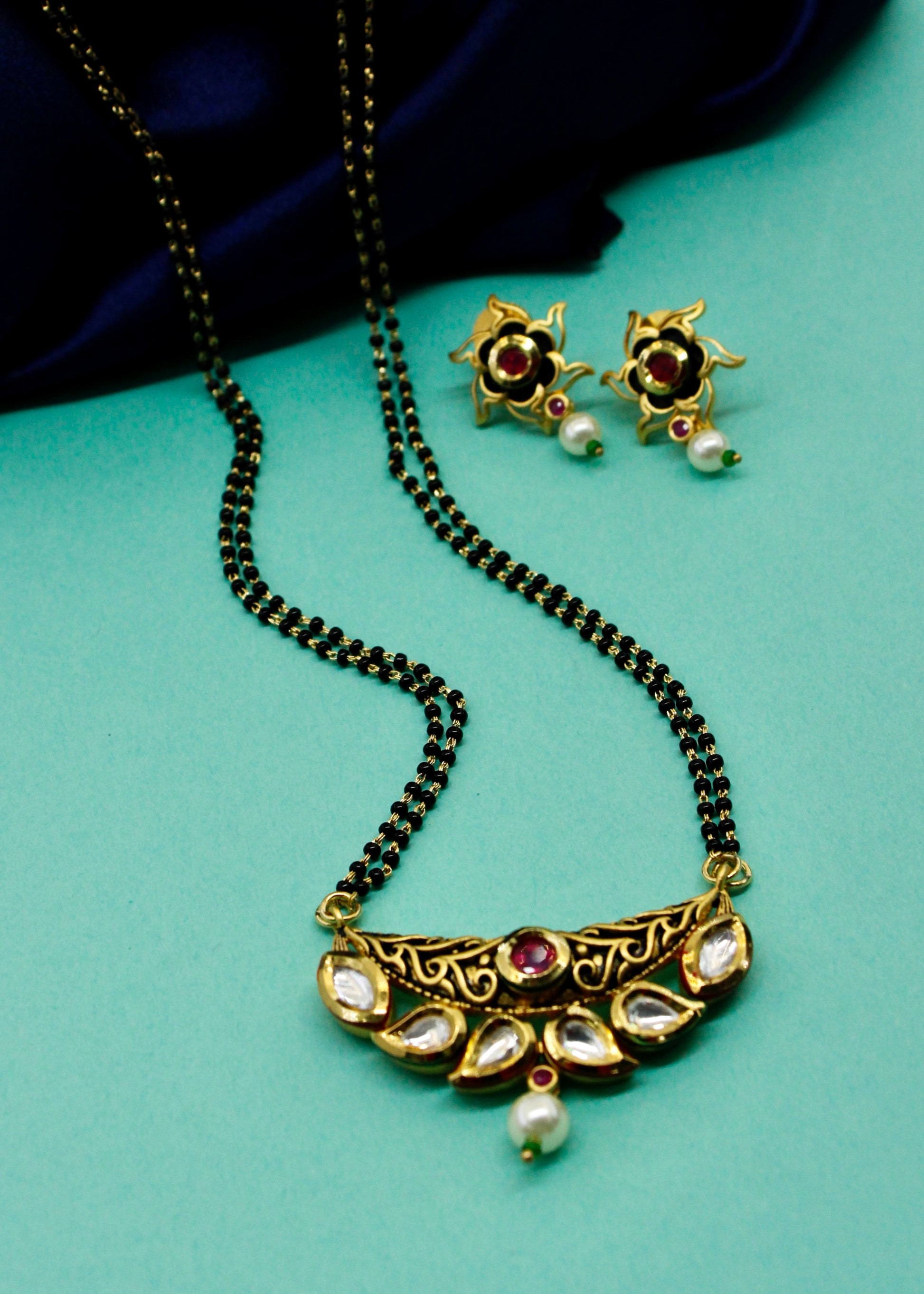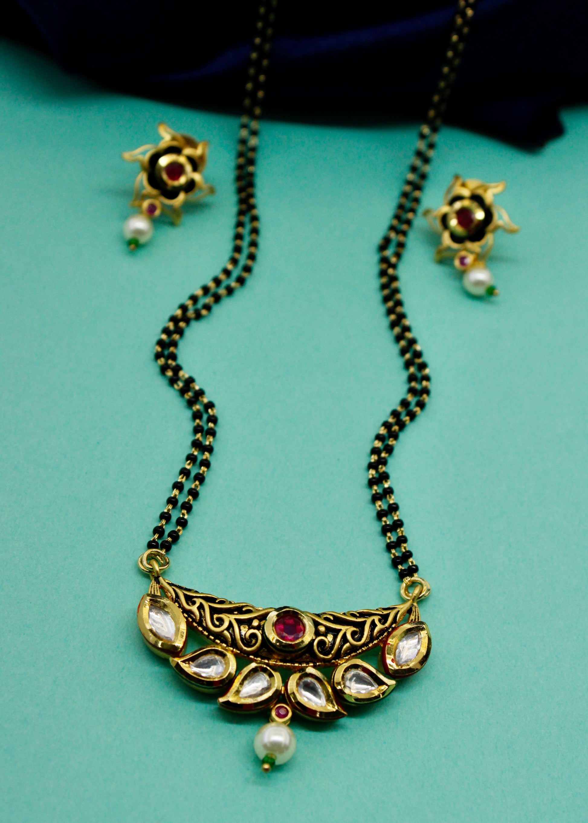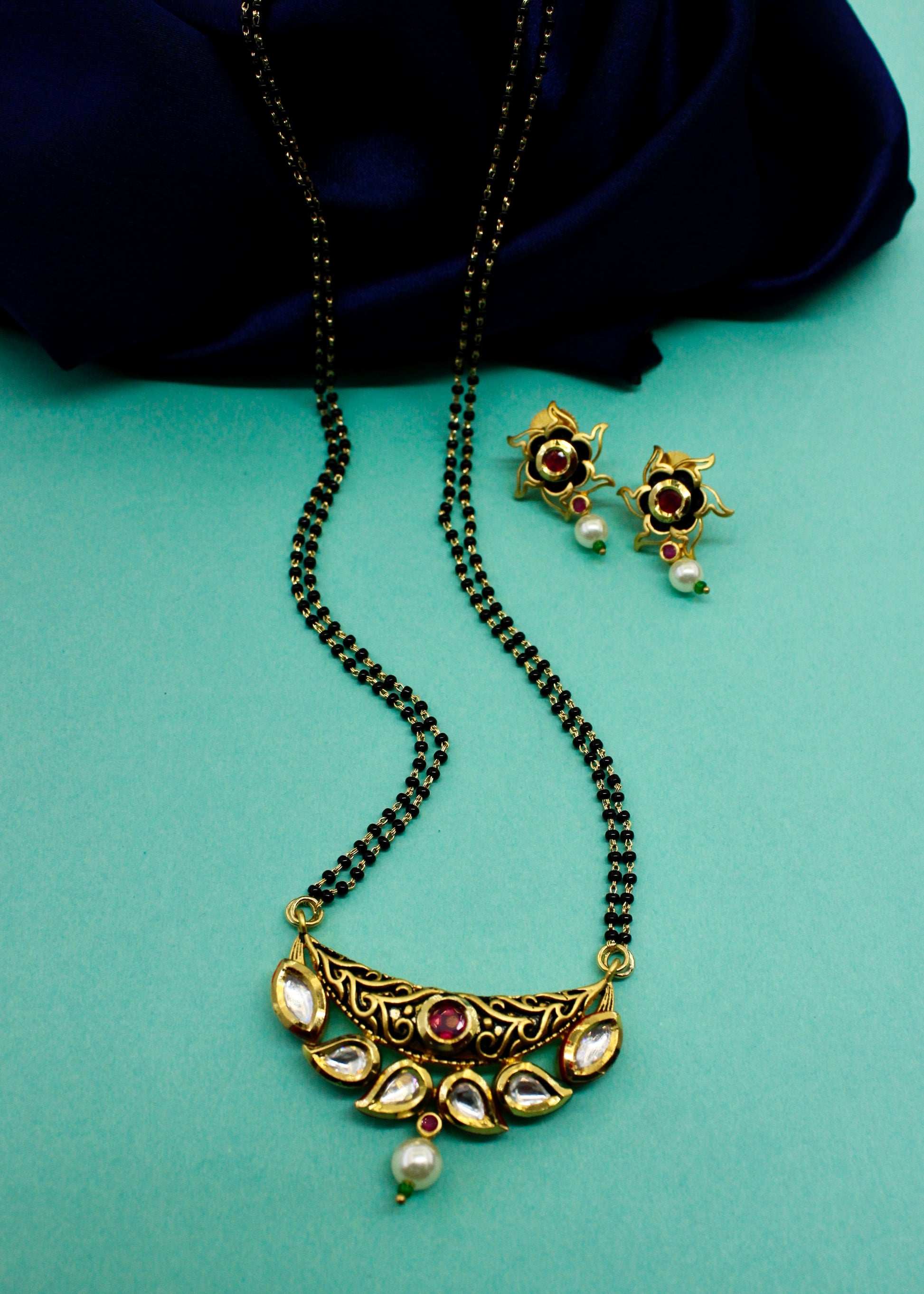 Mangalsutra is must have ornament for married women, so Sonchafa Jewellery offers this wonderful mangalsutra set. It is embedded with kundan and pearl beads.Made from matte golden finished metal. This mangalsutra has double layer of black beaded chain.