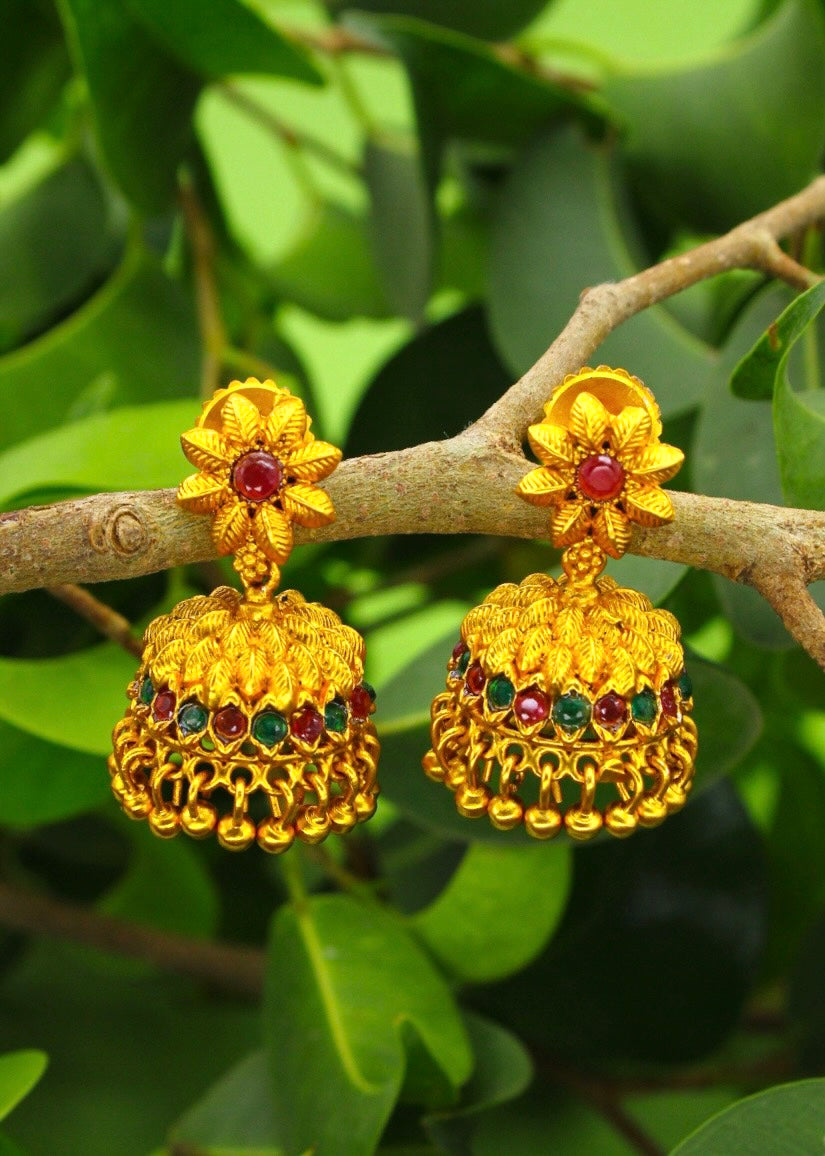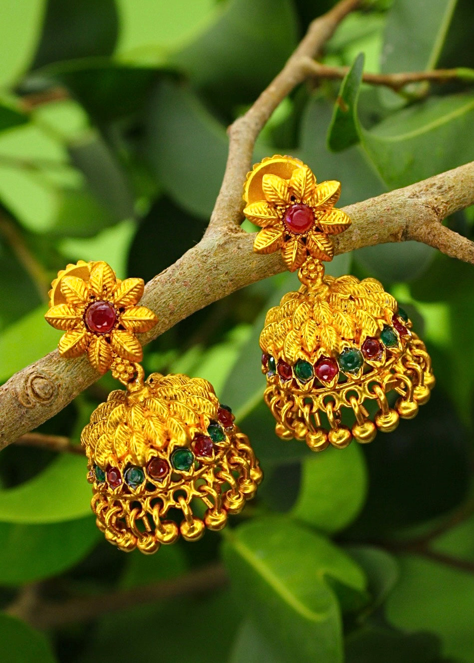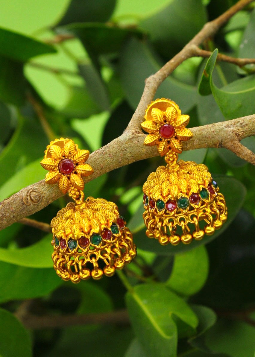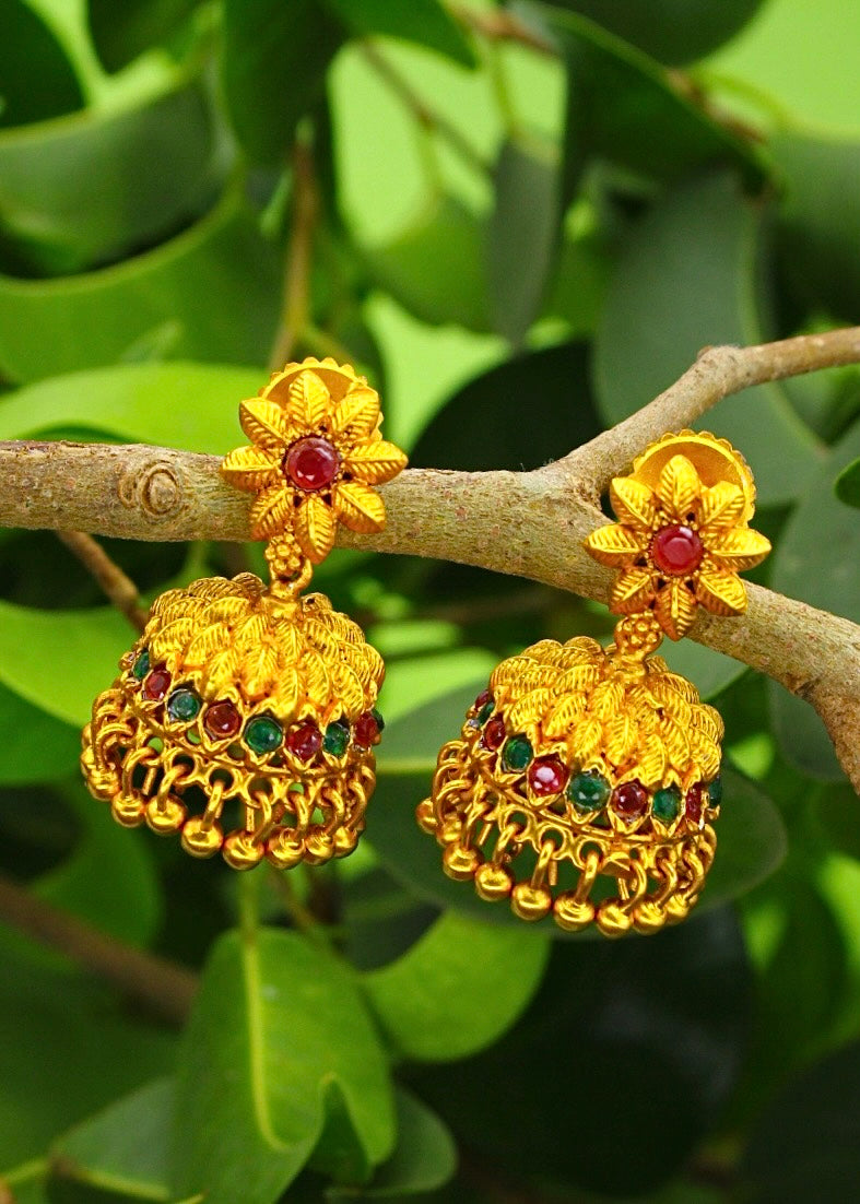 If you wish to get that perfect traditional look then you must pick this pair of matte golden colour earrings from Sonchafa Jewellery. They are fashioned from matte golden finish metal and have pearl bead droplets for added attraction.