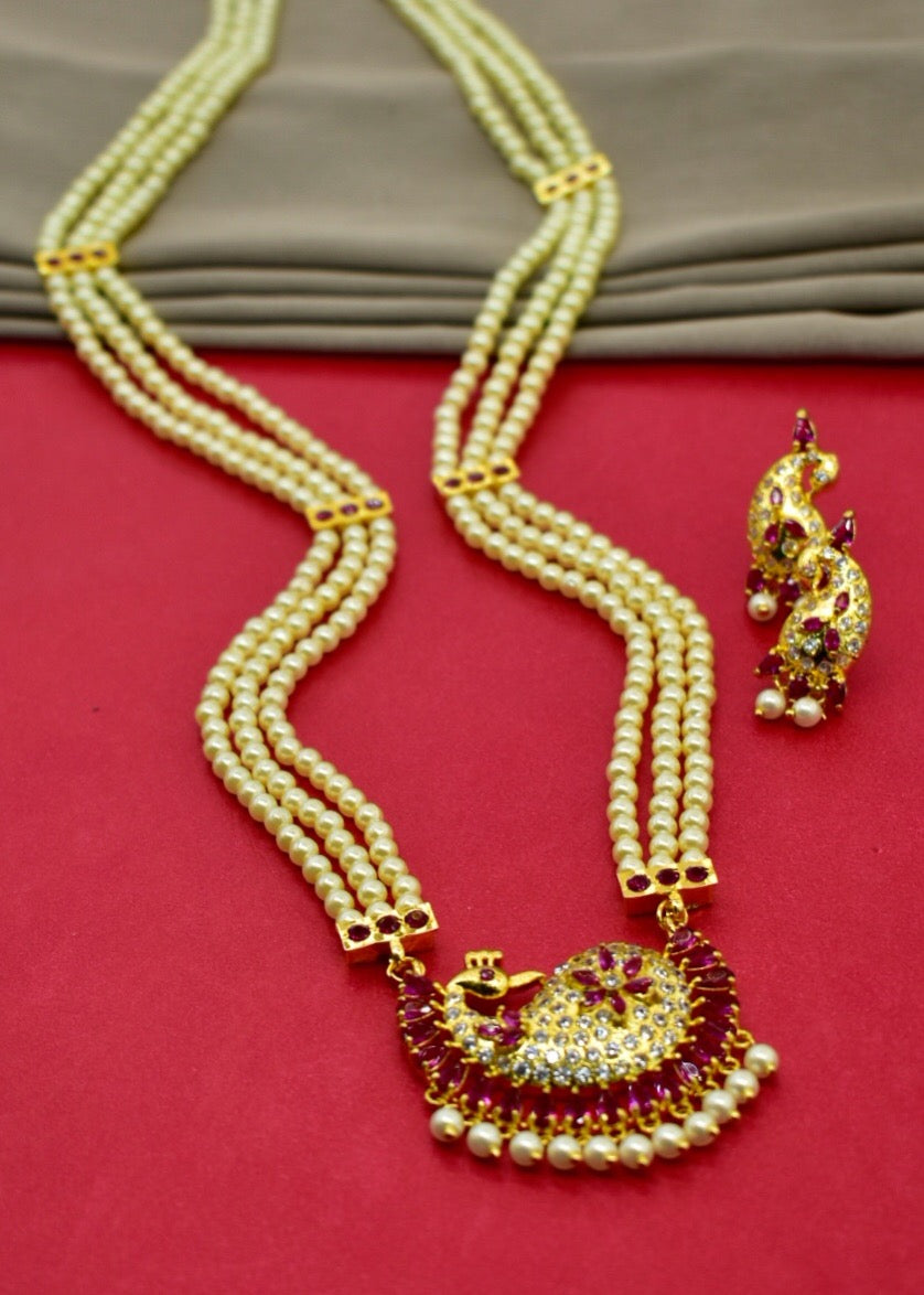 Peacock Style pearl necklace with pink-white color stones studded with pearl beads classy earrings Set For You. By sonchafa Jewellery Made With Superior quality Golden Finish Metal. royal looking neckpiece For you.
