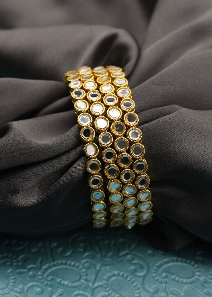Add extra elegance to your appearance by adorning this set of golden colour beautiful bangles with your matching costumes. They are encrusted with shimmering round shape mirror stones. These appealing bangles are fashioned from antique gold finish metal and ensures high durability. These are skin-friendly and long lasting