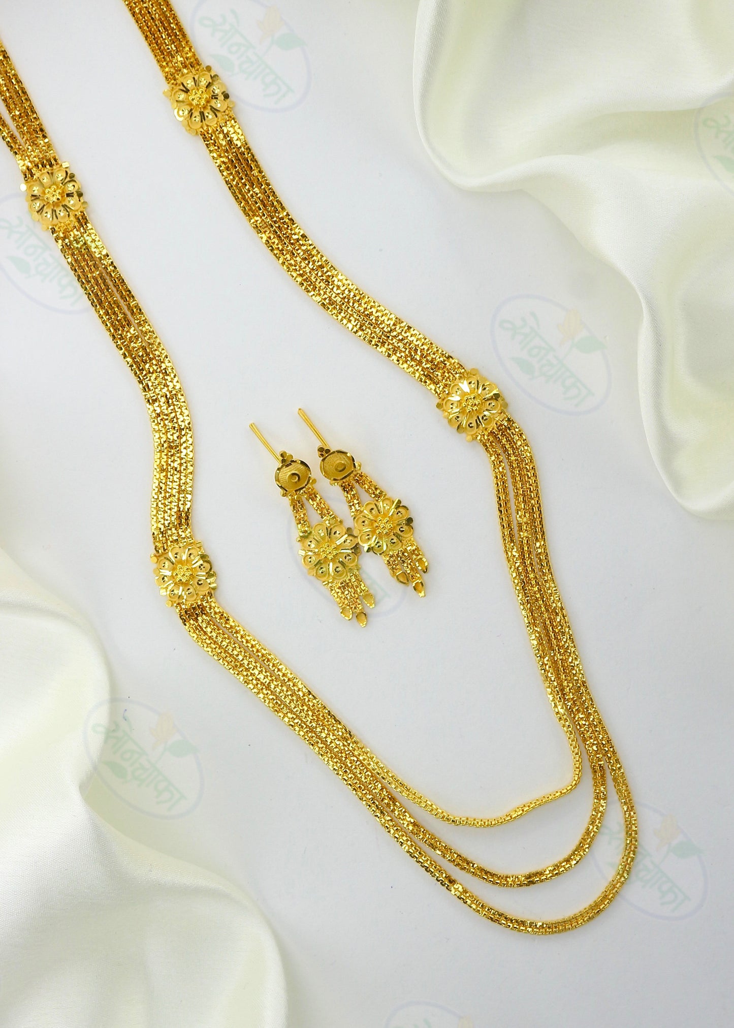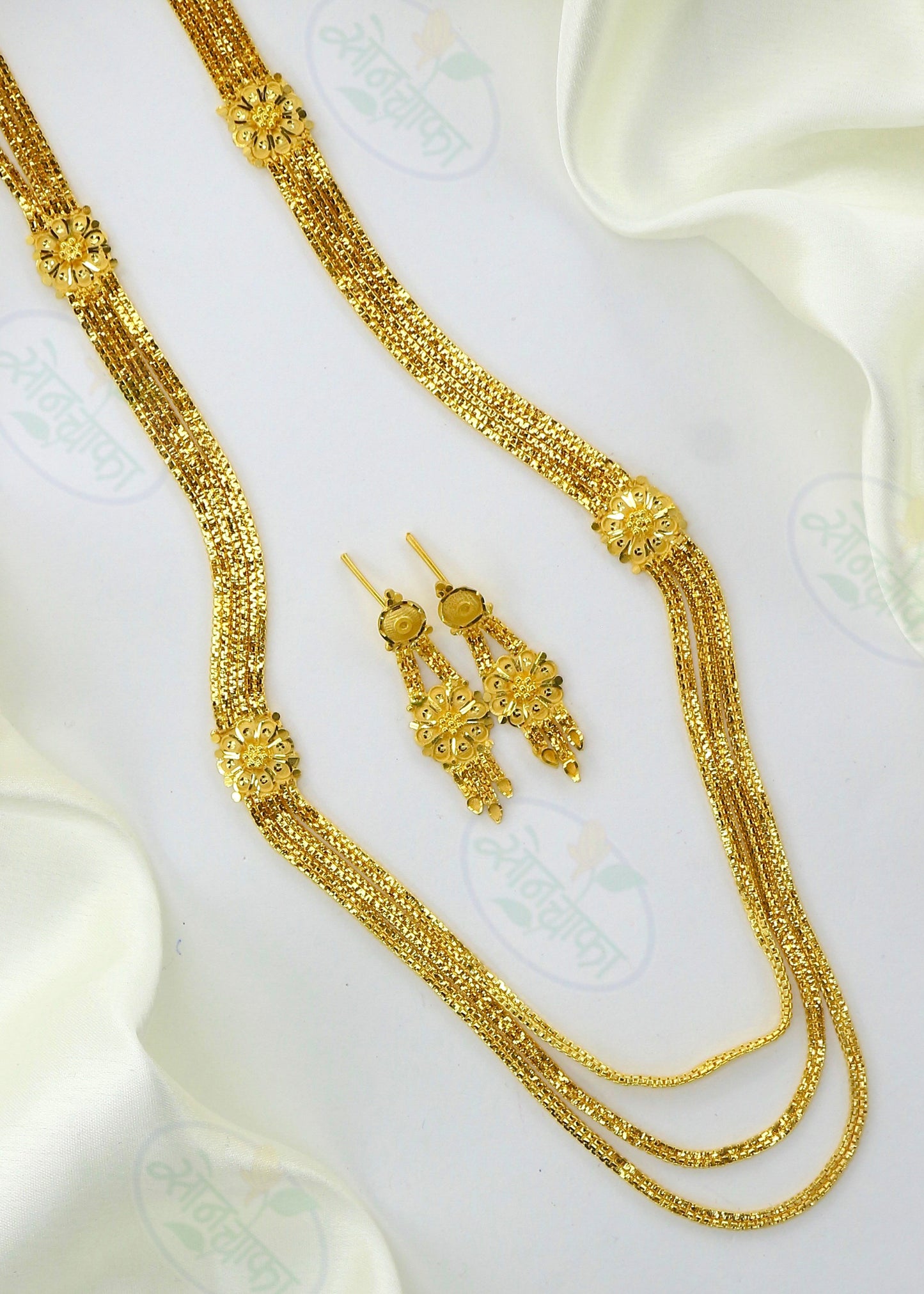 Gold plated triple layer long floral designer necklace set from Sonchafa Jewellery for traditional look. It is wonderfully crafted with 1 gram gold plated metal along with golden chain. It is long lasting and high in durability. It will surely intensify your classy look.