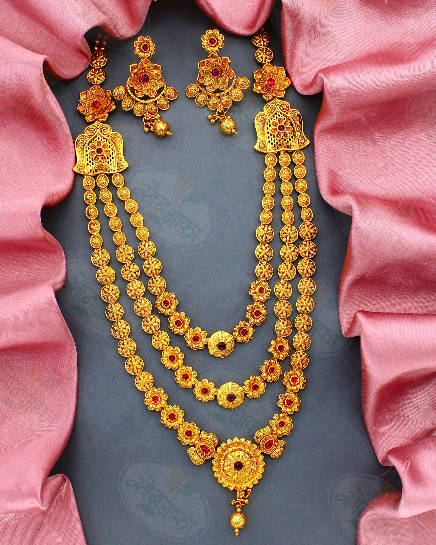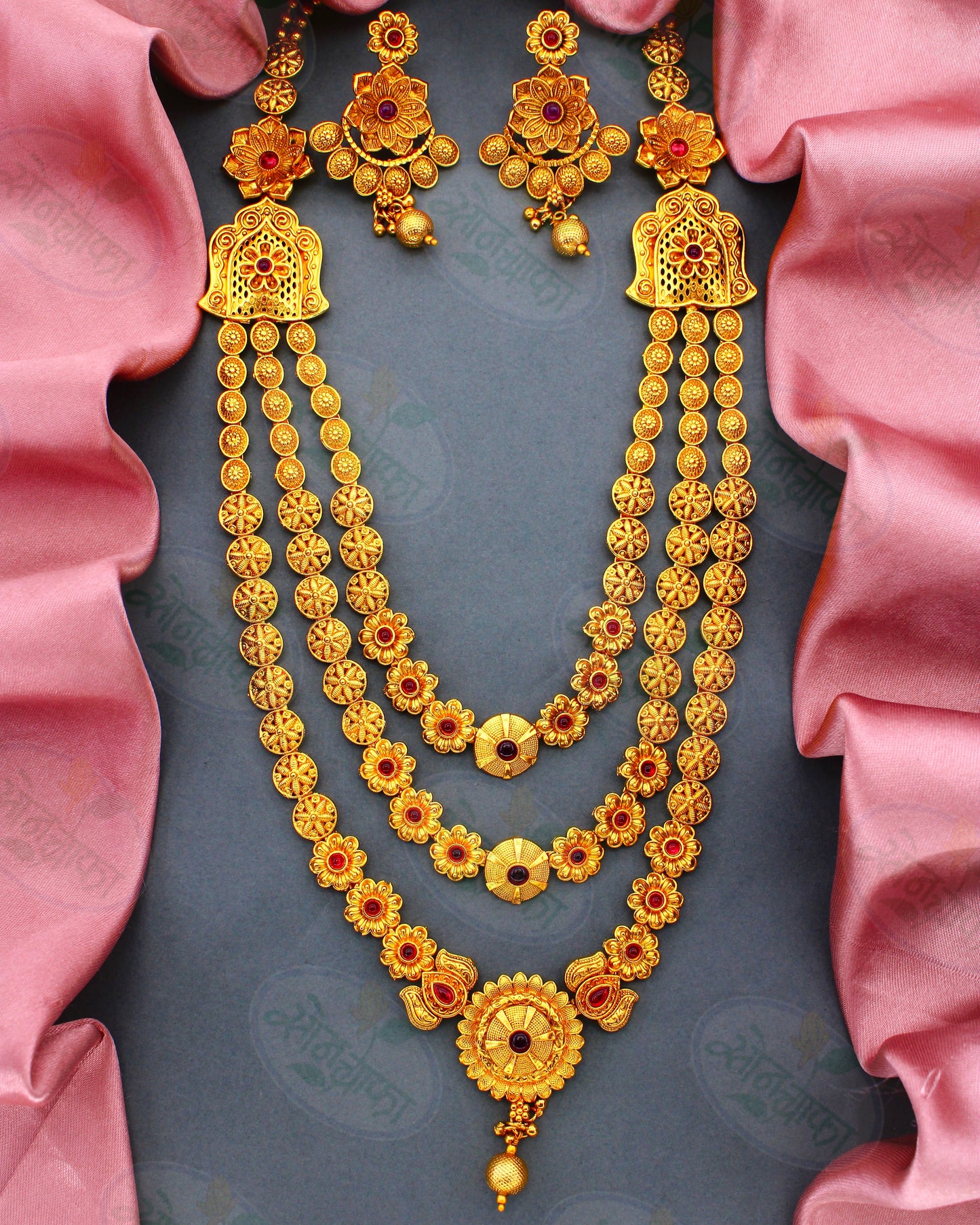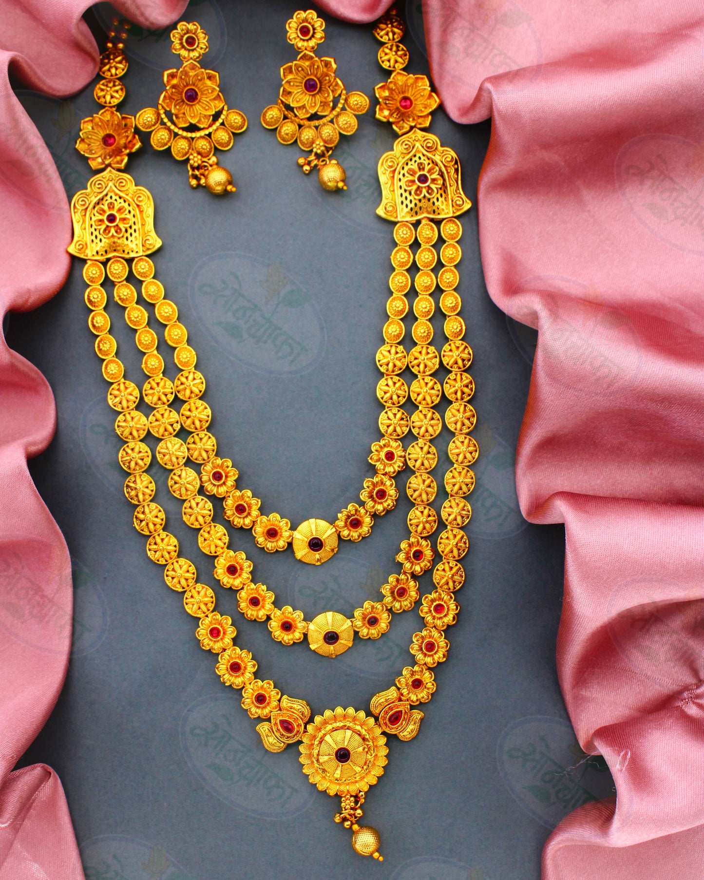 Sonchafa Jewellery brings to you this exquisite floral pendant styled adorable layerd necklace set for you in stylish look. This necklace feature intricate carving on the surface. This necklace set feature eye-pleasing intricate carving design on surface. The neck-piece comes with adjustable dori, so that you can fit it properly.