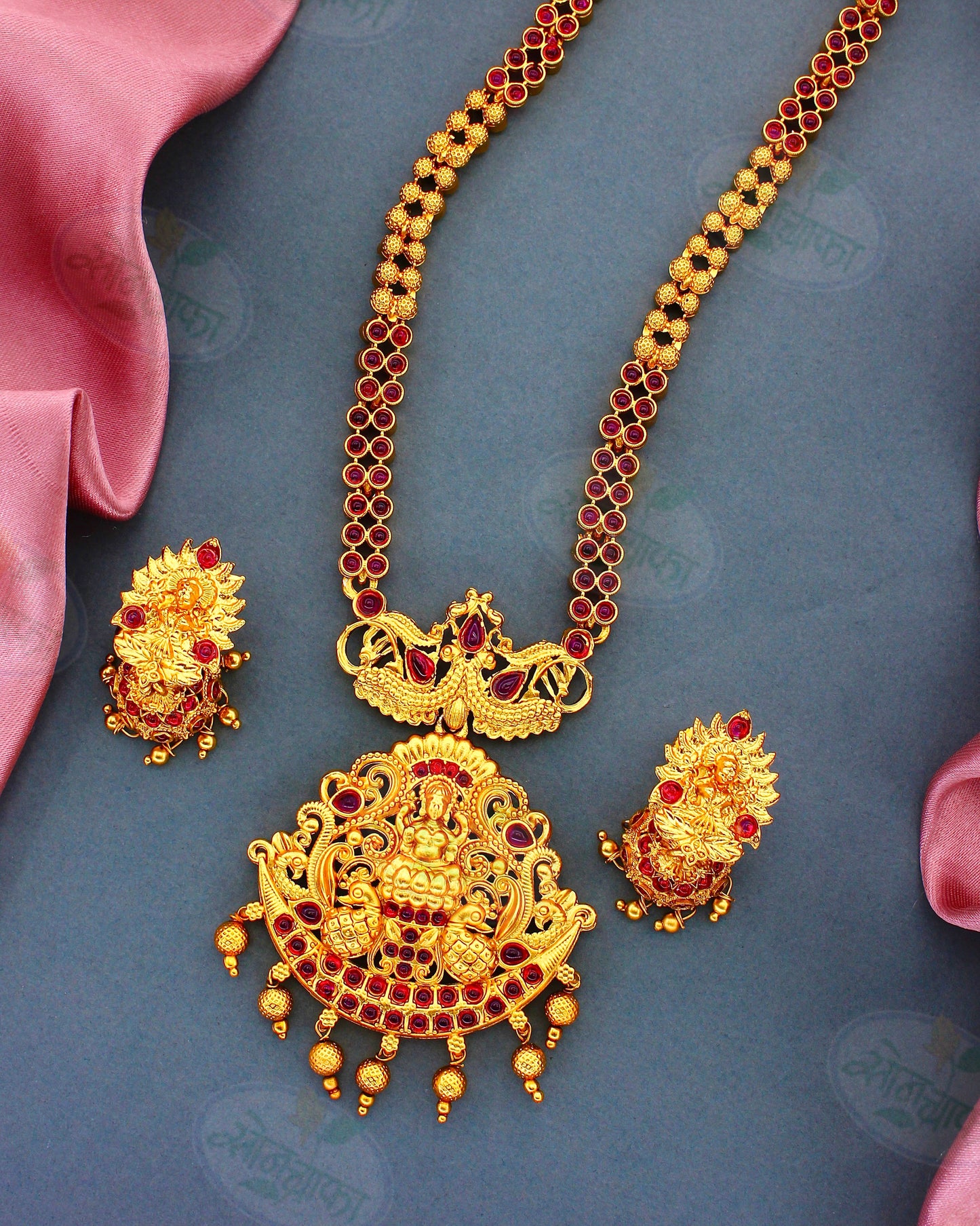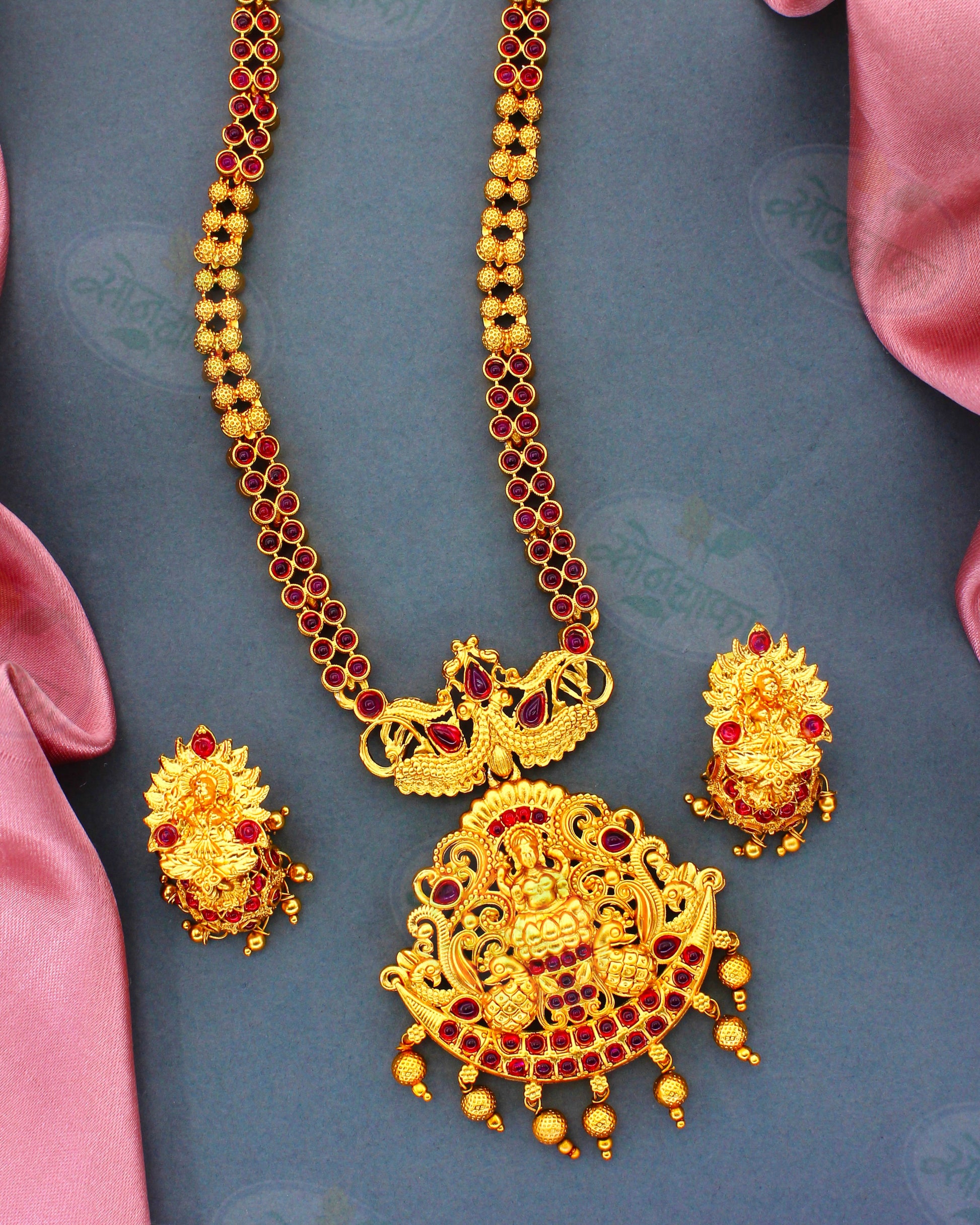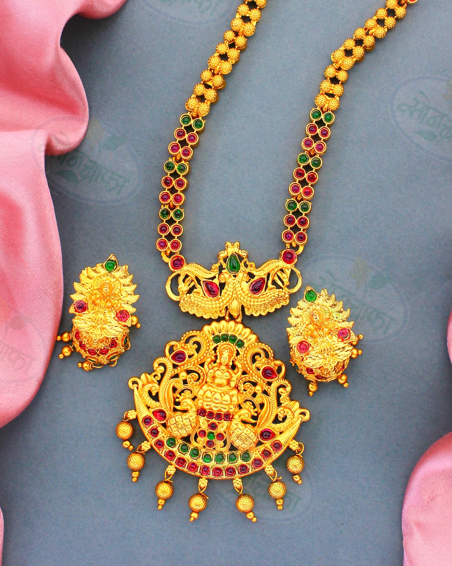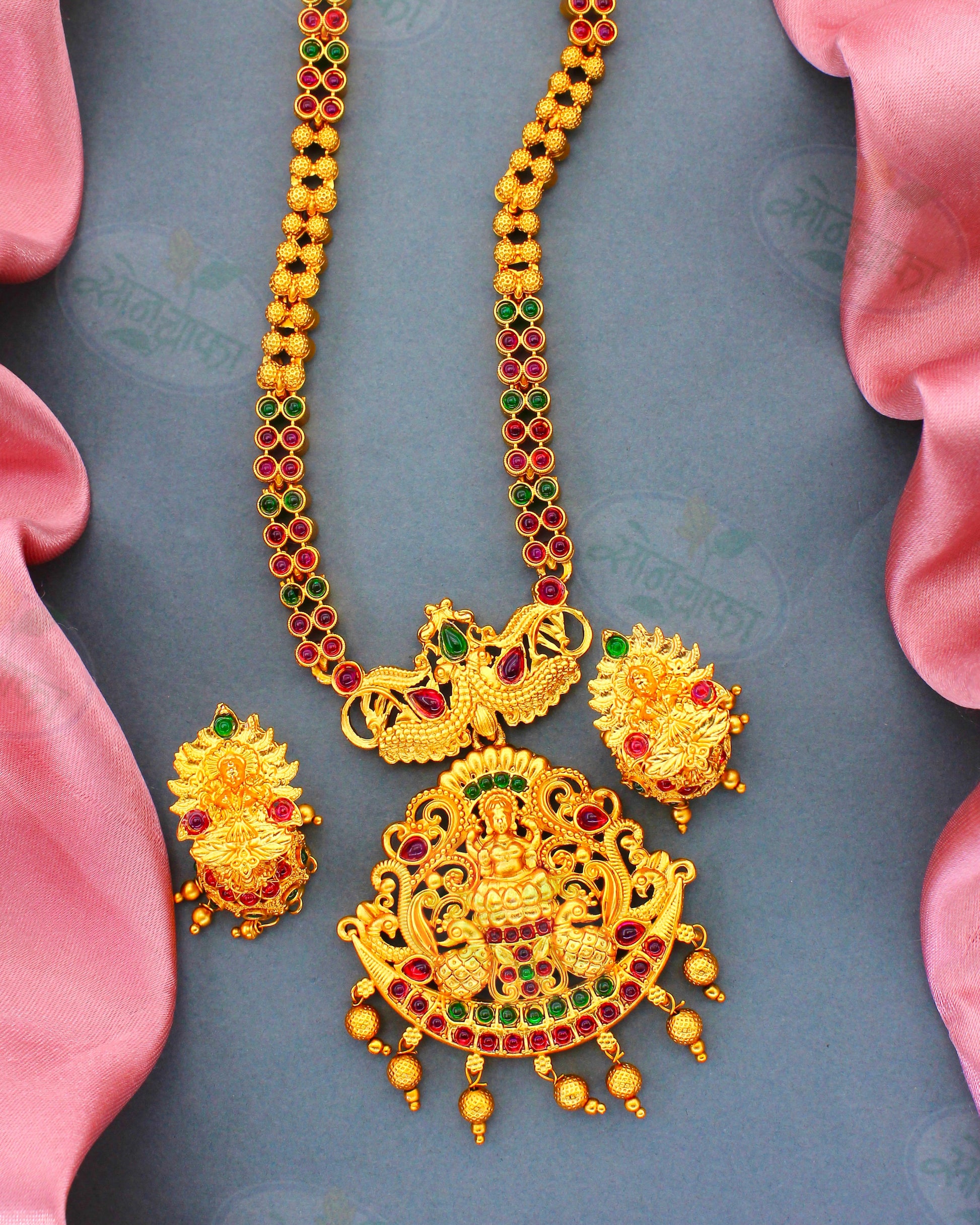 Sonchafa Jewellers brings to you this floral designer necklace set for modish women like you. Club this designer necklace set with your traditional costumes. It is embedded with sparkling pink green stones and made from matte golden finish metal. It also has beautifully designed earrings. It is woven with stunning floral design. This long necklace set is superior in quality and rust-resistant as well.